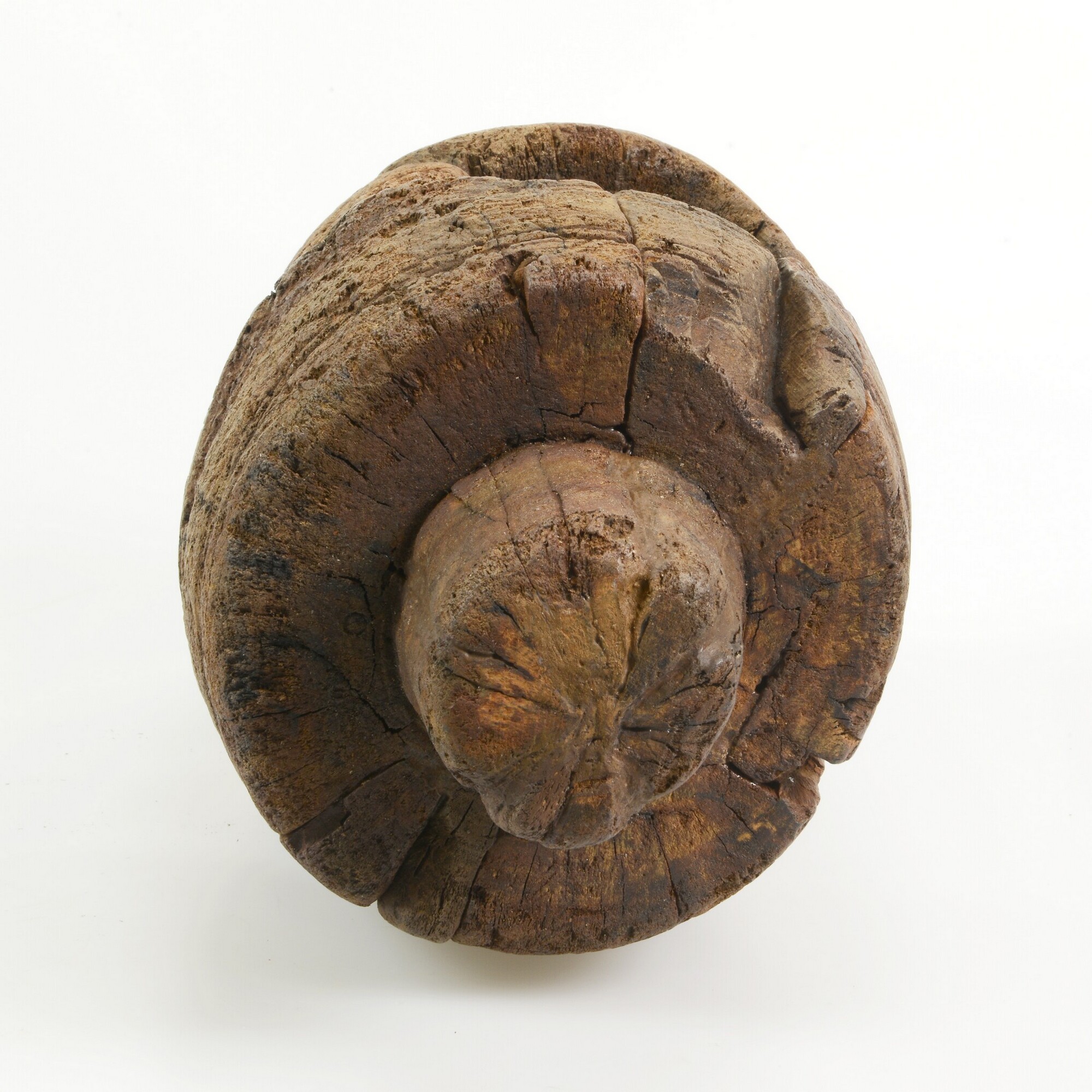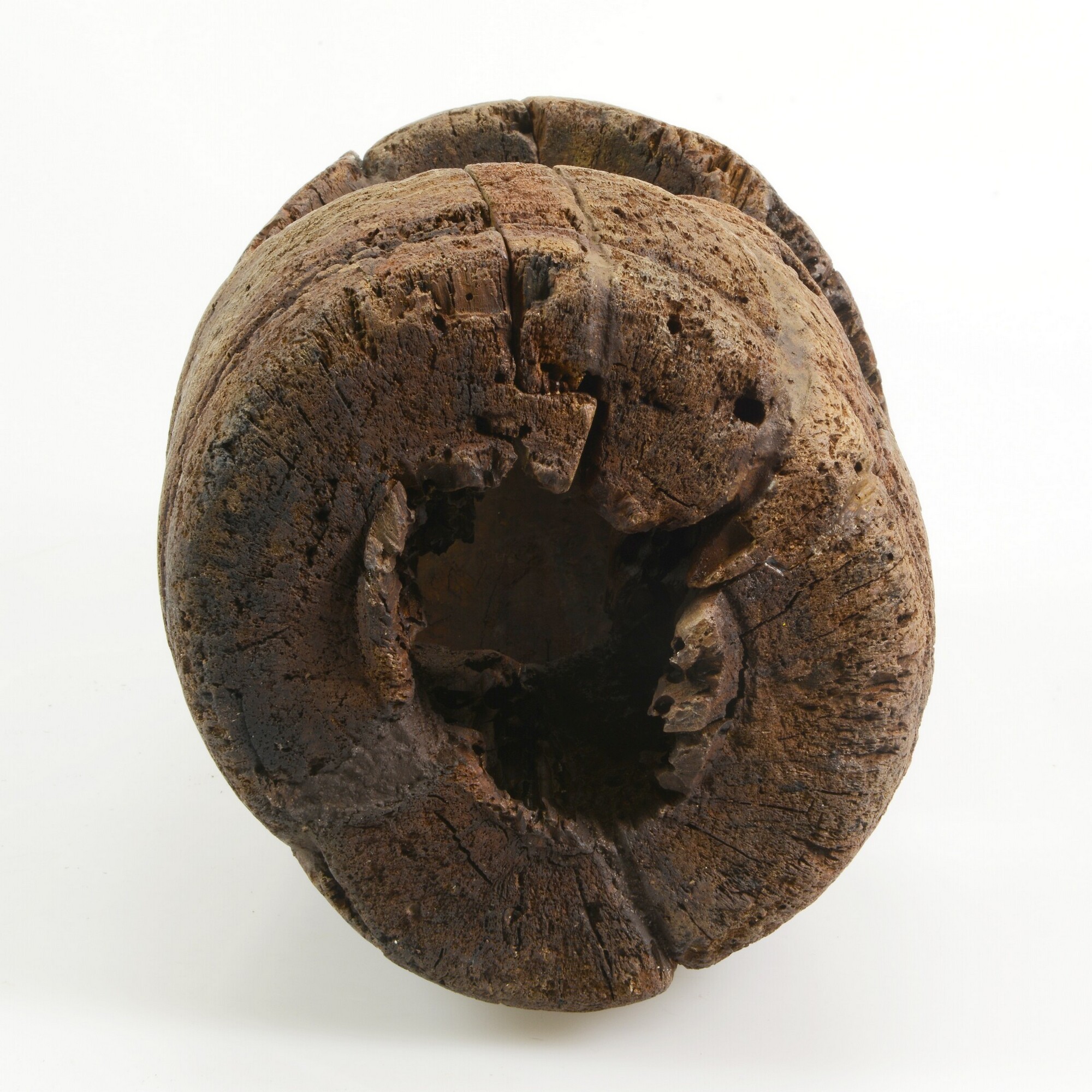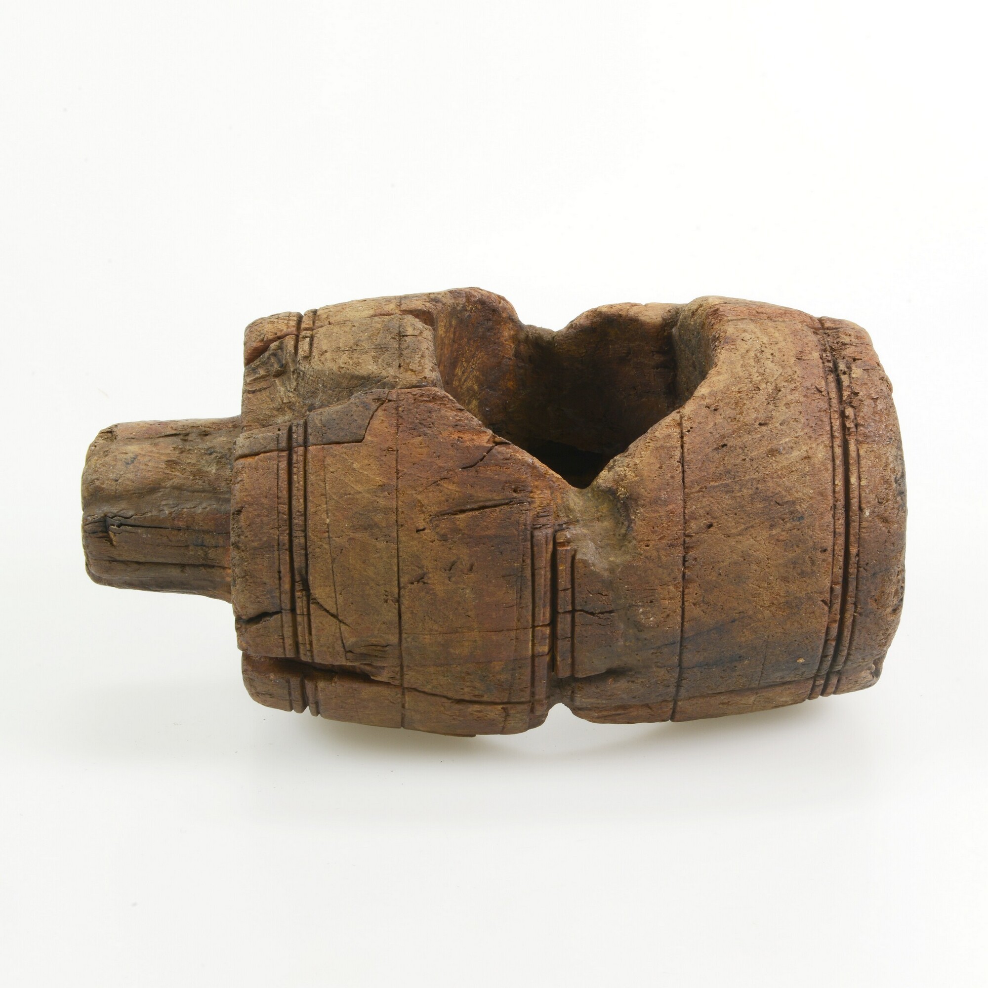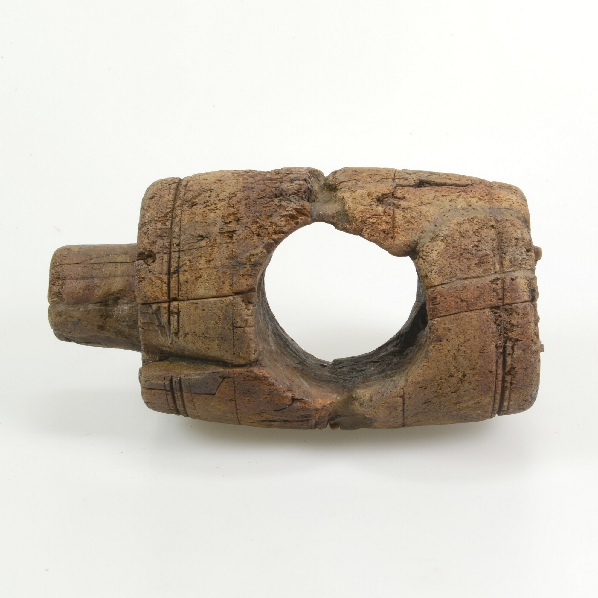 Bril; ronde klos (gerestaureerd uit meerdere onderdelen), waardoorheen de kolderstok stak vanaf bovendeks de stuurplecht, naar benedendeks naar het vooruiteinde van de helmstok op het roer. Deze klos kon draaien in het dek en maakte het bedienen van het roer via de kolderstok en helmstok mogelijk. Deze klos heette de ‘bril’ (Witsen 1670). Houtworm.