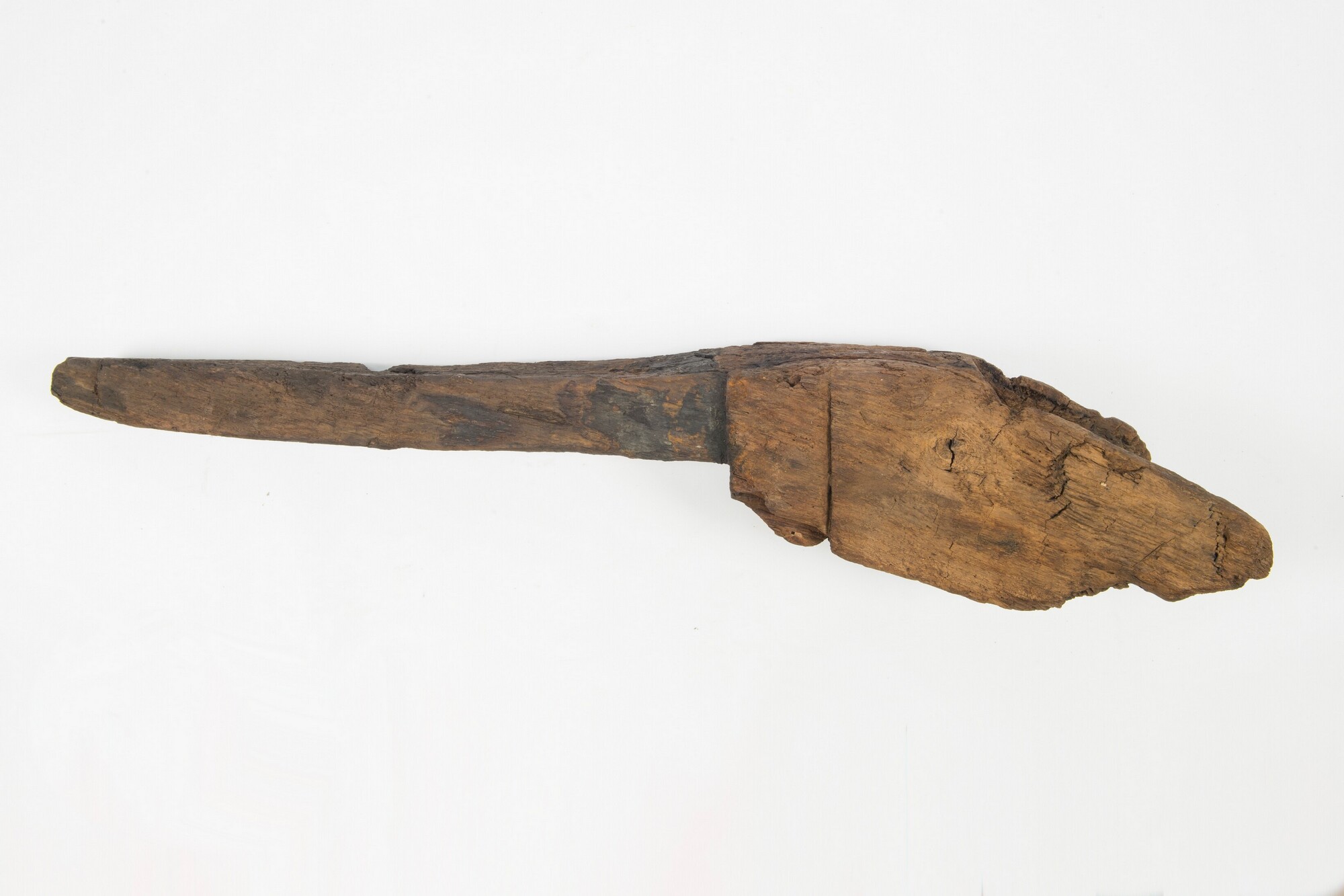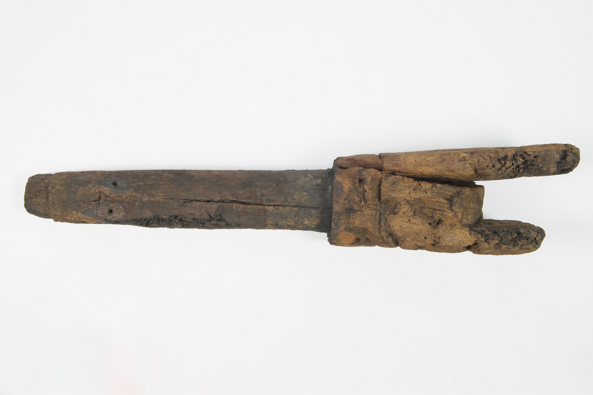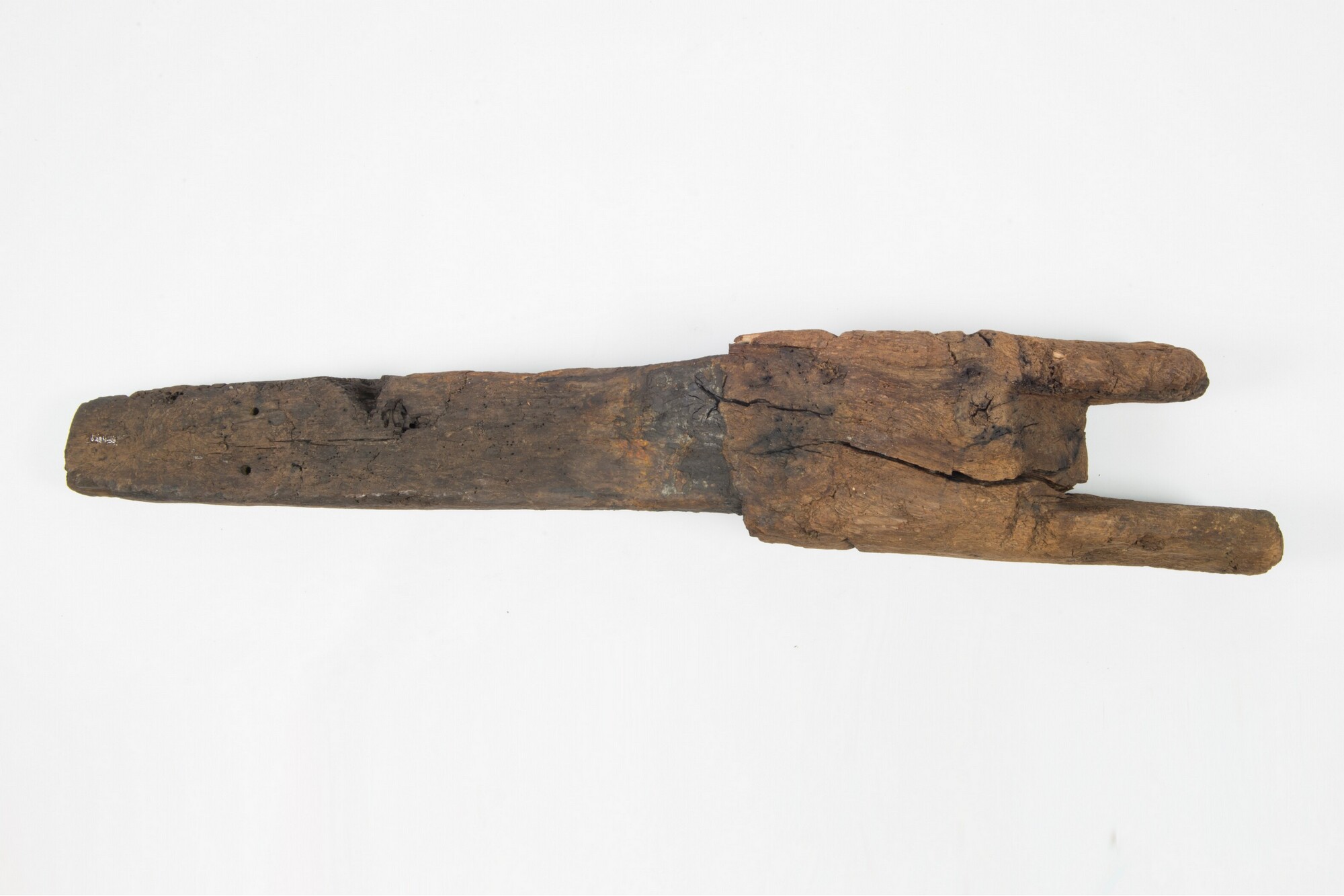 Pompmik of gek (spelling Witsen, 1670: ‘geck’) van een scheepspomp, onderkant compleet, bovenkant afgevreten door paalworm
