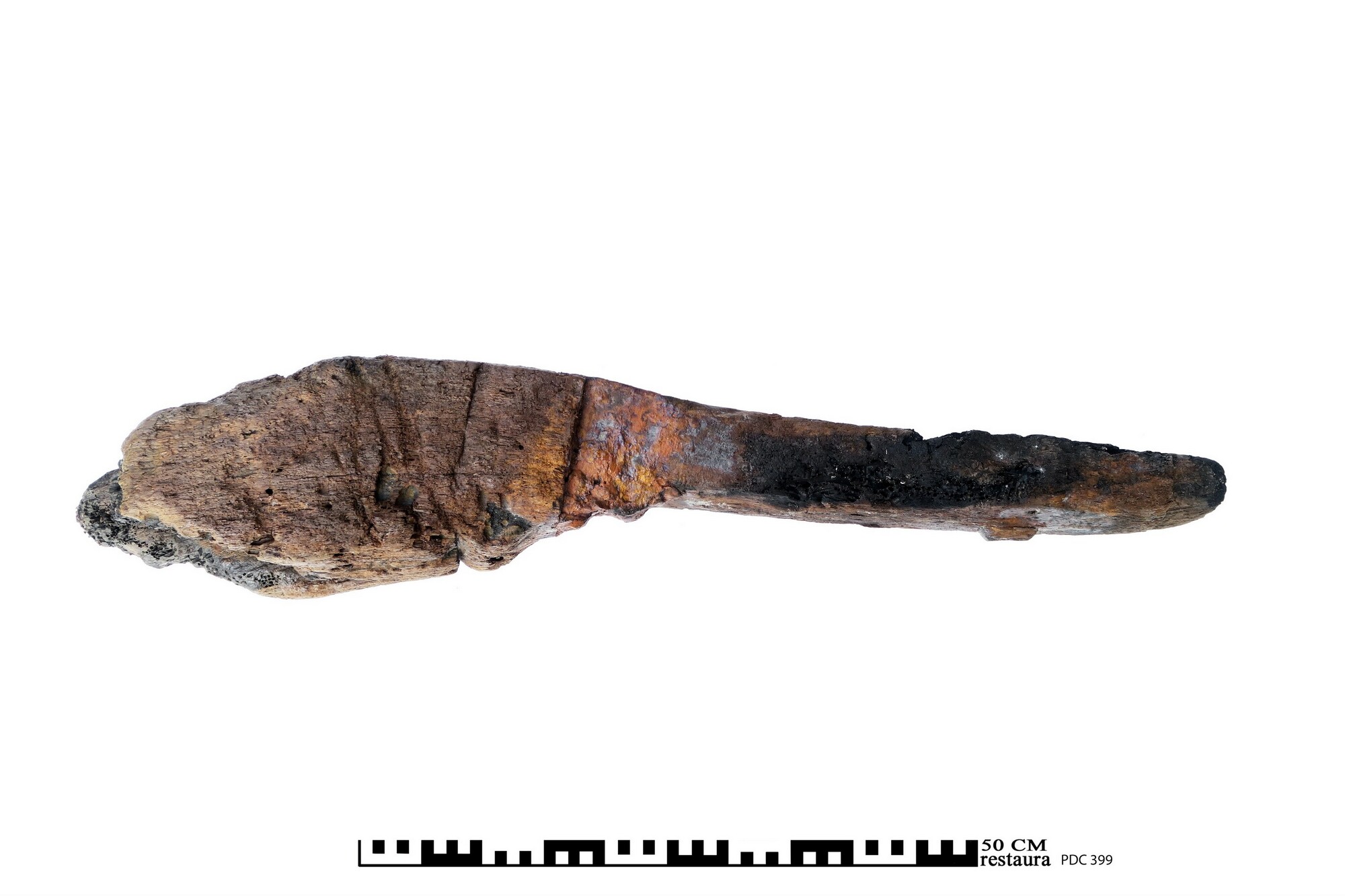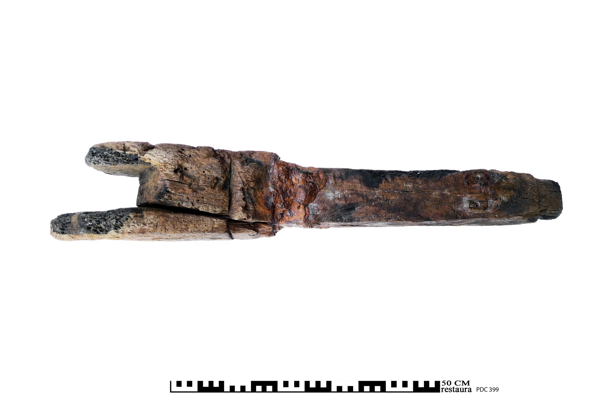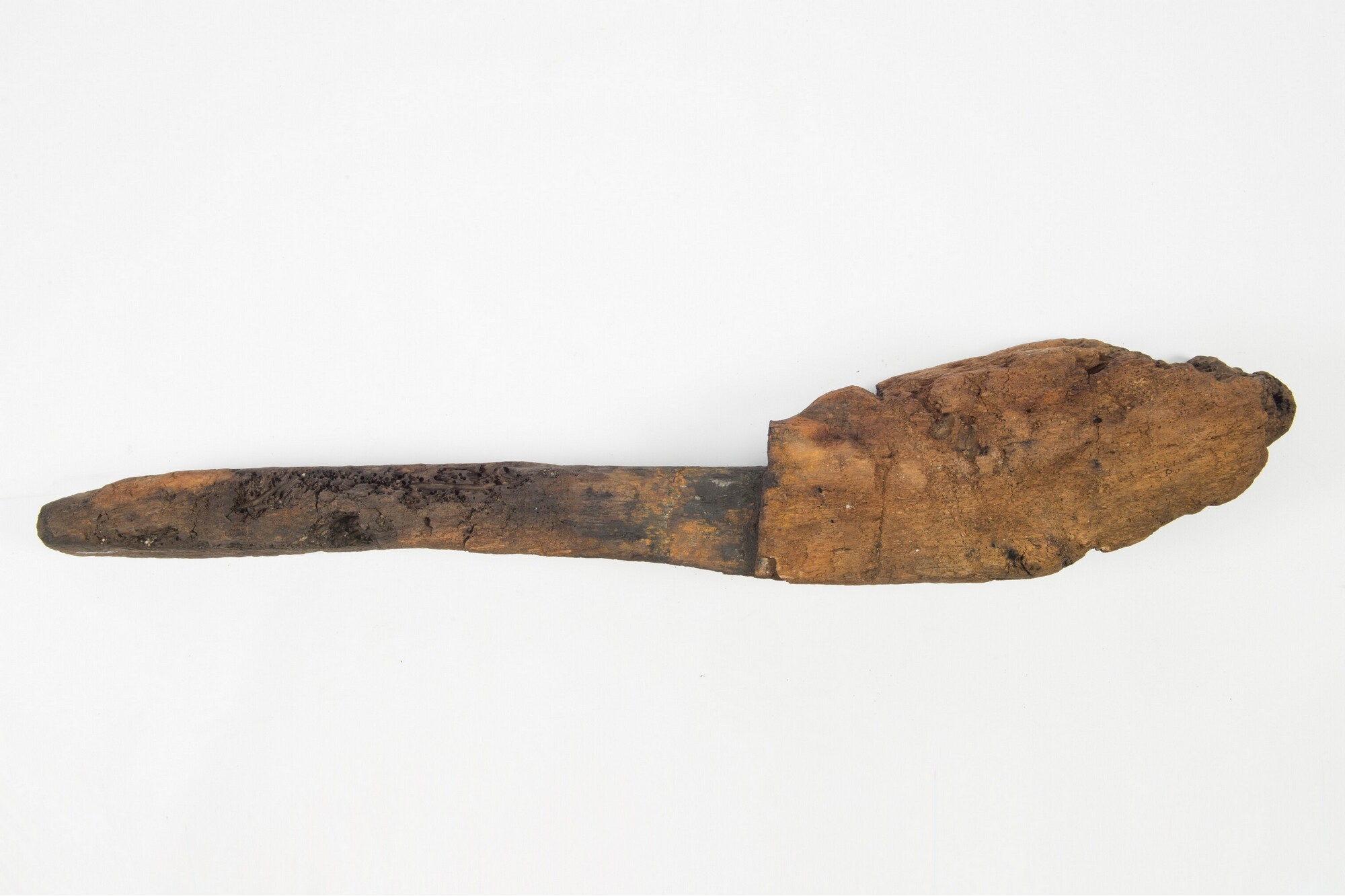 Pompmik of gek (spelling Witsen, 1670: ‘geck’) van een scheepspomp, onderkant compleet, bovenkant afgevreten door paalworm