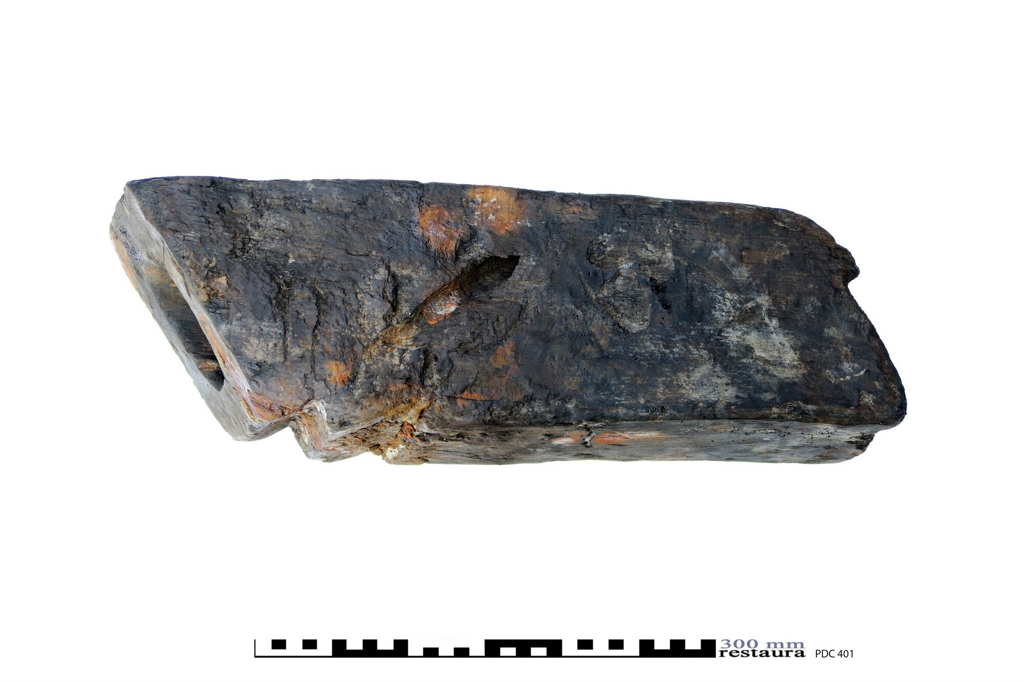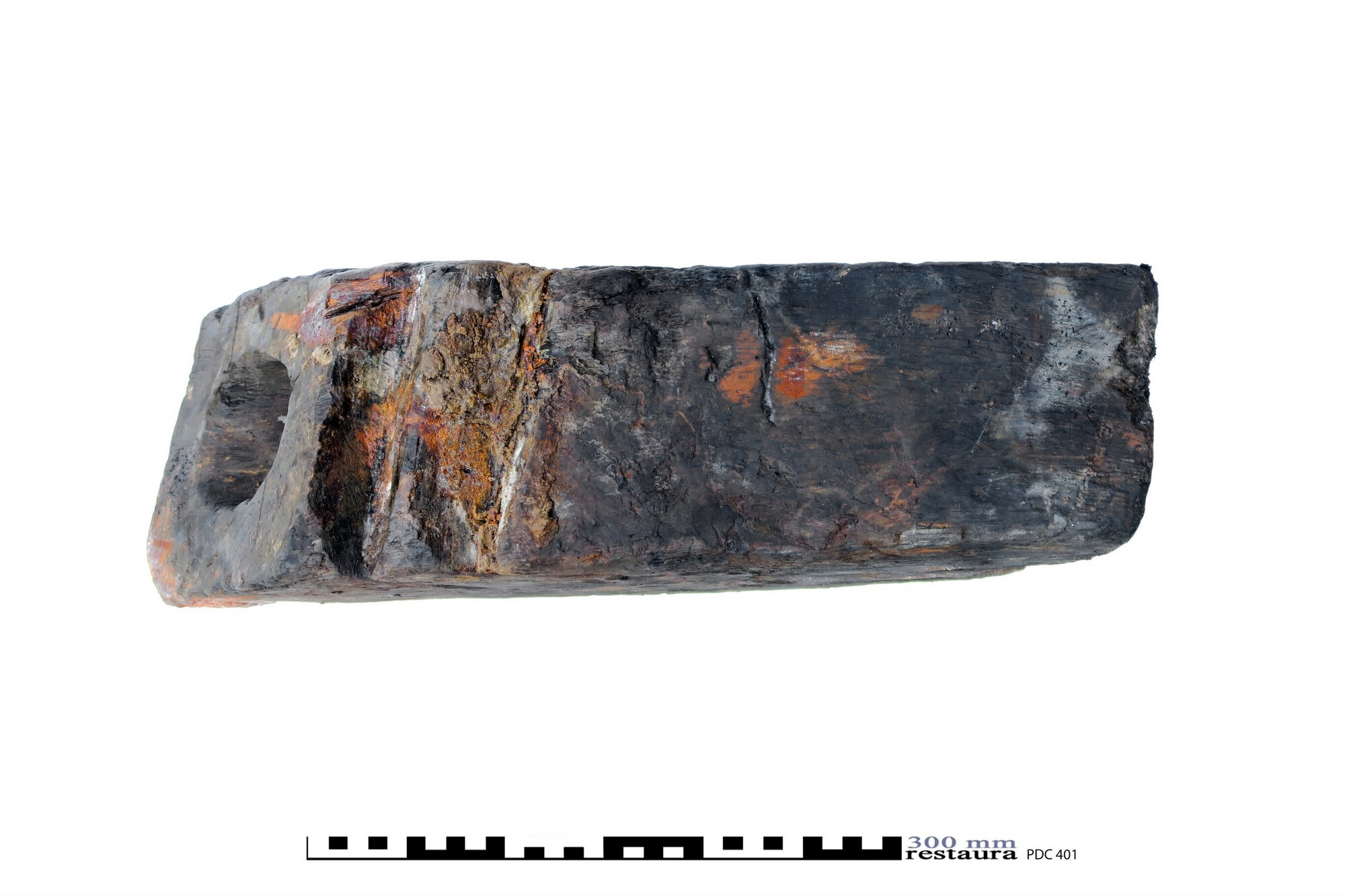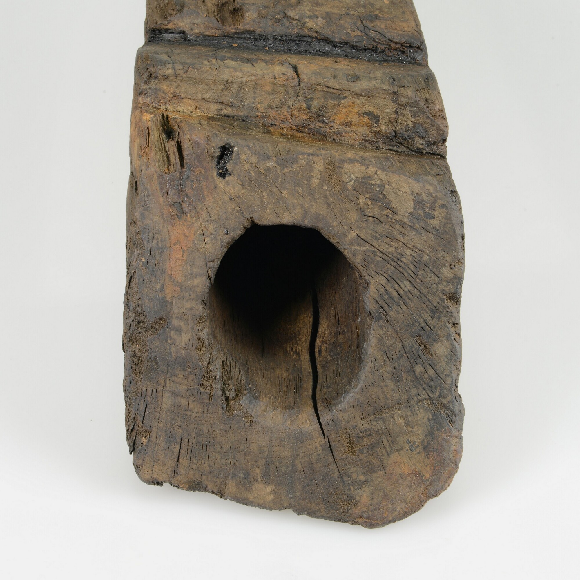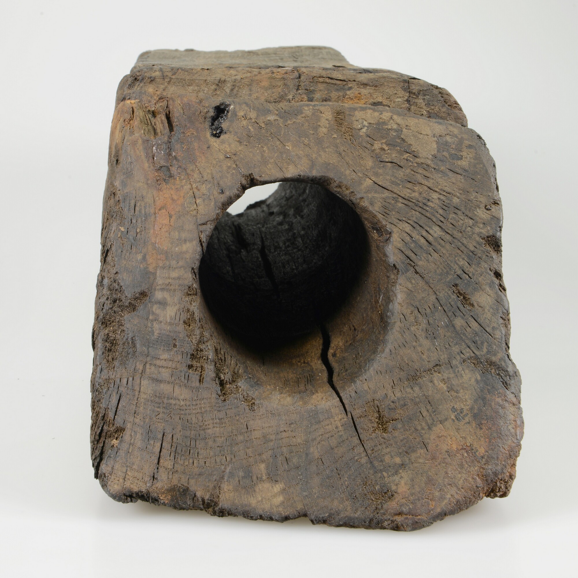 Spuikoker of bos (spelling Witsen, 1670: ‘bosch’). Een korte vierkantige balk in de lengterichting doorboord voor het door het boord lozen van lek-, regen- en/of buiswater. Aan de buitenkant een restant ‘mamiering’ om naar binnen stromen van water te verhinderen, in dit geval vermoedelijk van zeildoek. Precieze wijze van bevestigen is niet direct duidelijk. Slechts ...