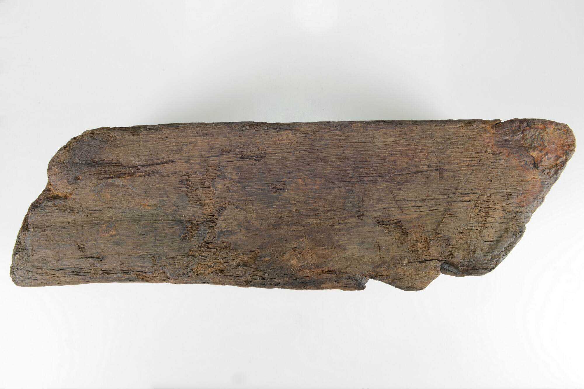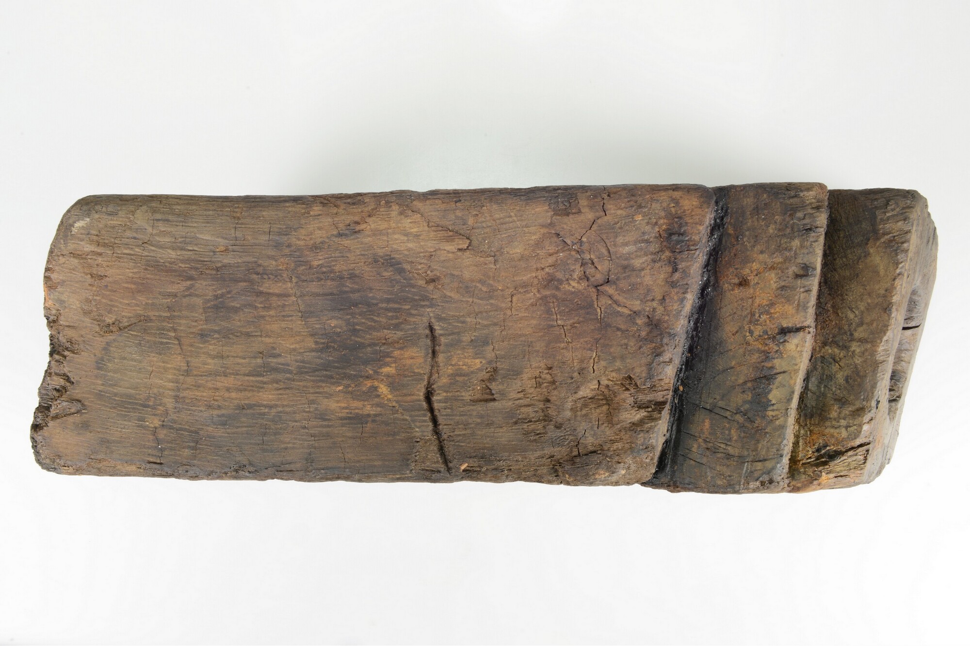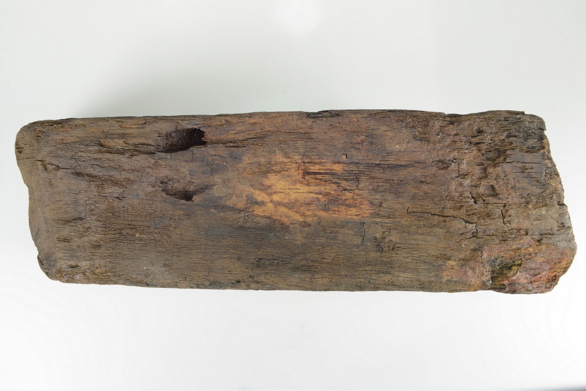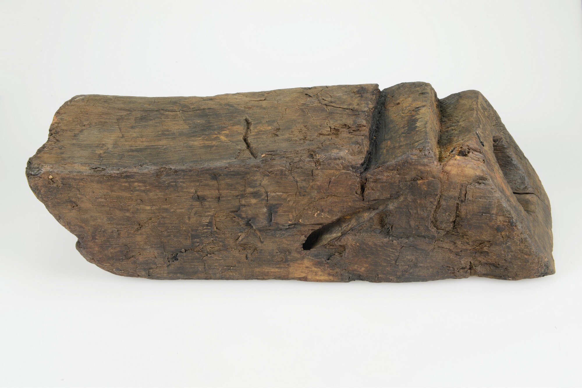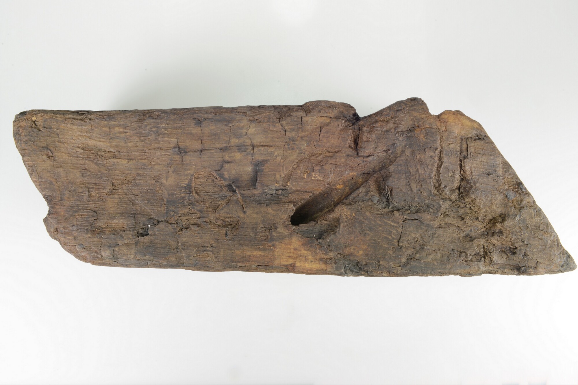 Spuikoker of bos (spelling Witsen, 1670: ‘bosch’). Een korte vierkantige balk in de lengterichting doorboord voor het door het boord lozen van lek-, regen- en/of buiswater. Aan de buitenkant een restant ‘mamiering’ om naar binnen stromen van water te verhinderen, in dit geval vermoedelijk van zeildoek. Precieze wijze van bevestigen is niet direct duidelijk. Slechts ...