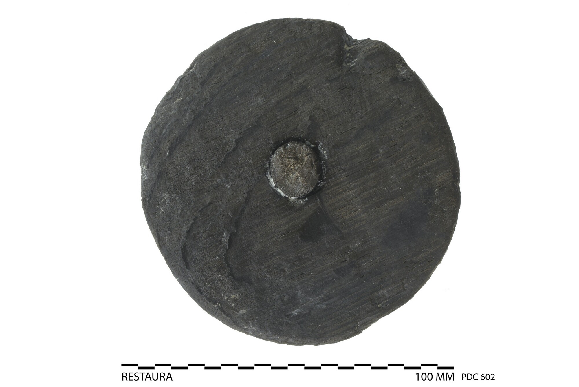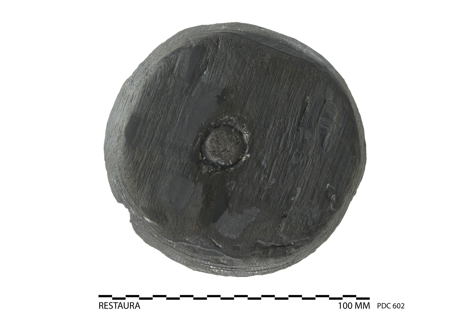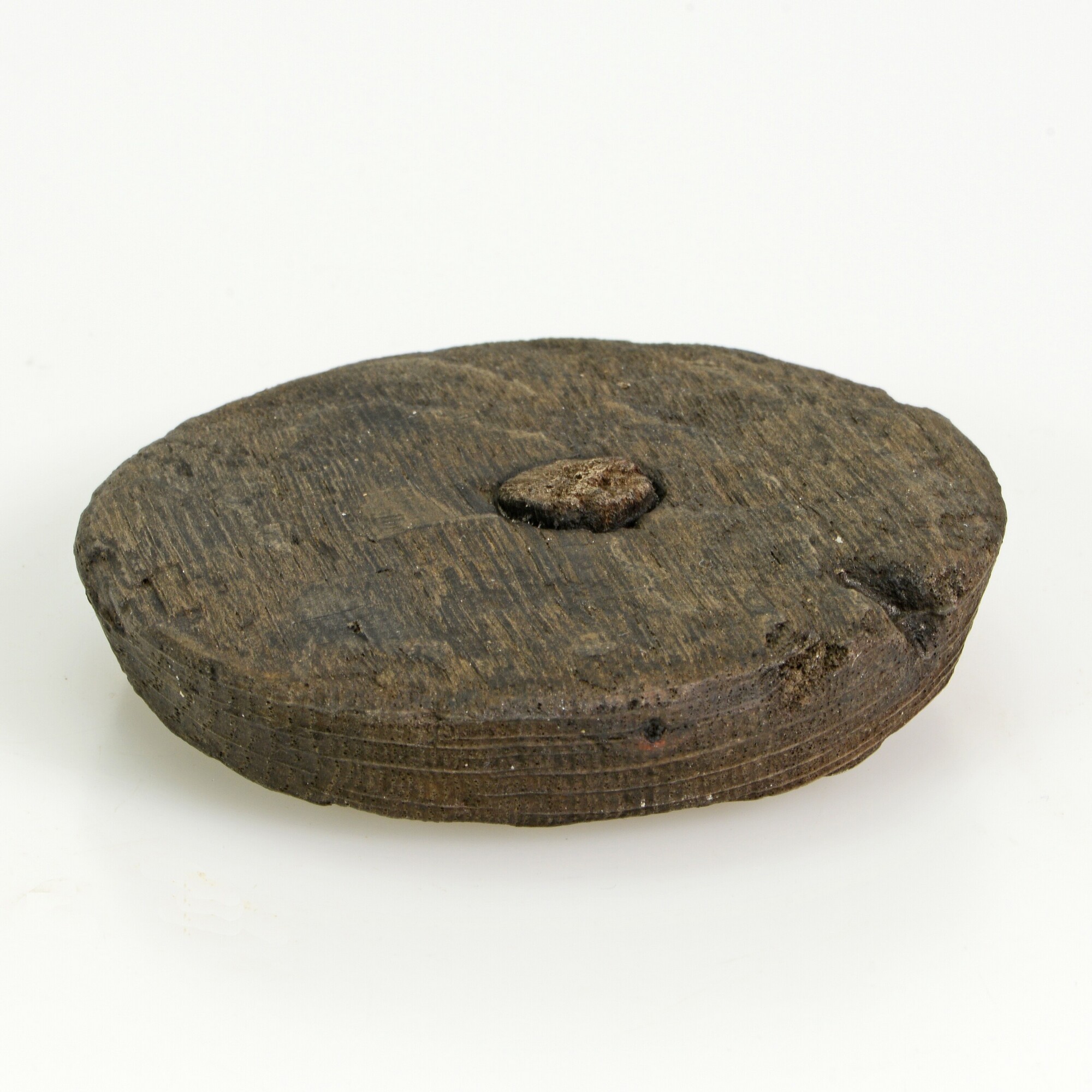 Schijf; licht conisch; restant houten knop in gat; inkeping