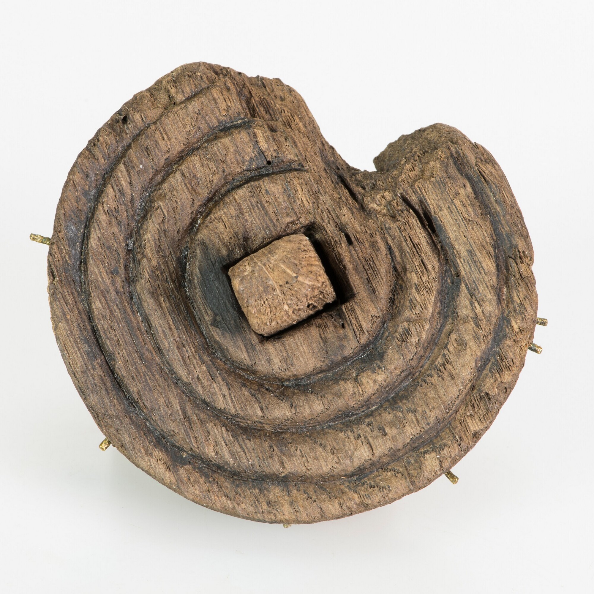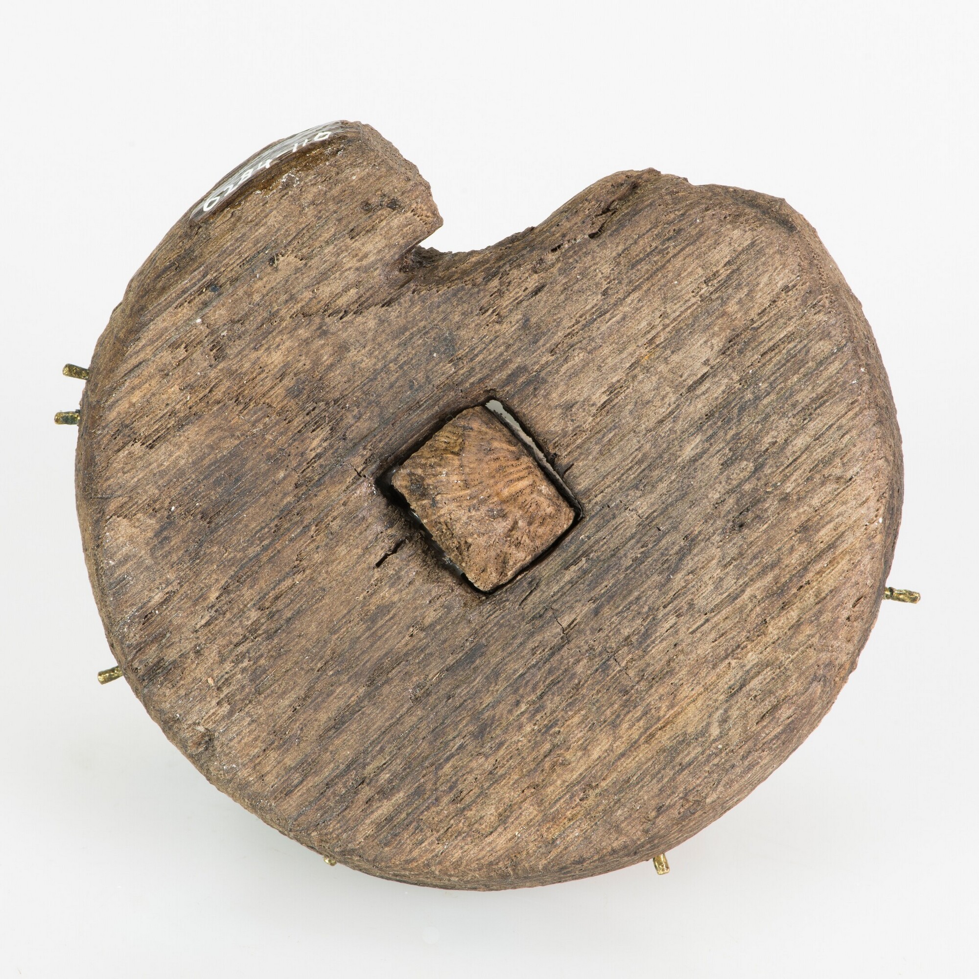 Schijf; licht conisch, met restant houten knop; bovenkant versierd met vier cirkels; rondom steken restanten van messing spijkers/pennetjes uit de zijkant