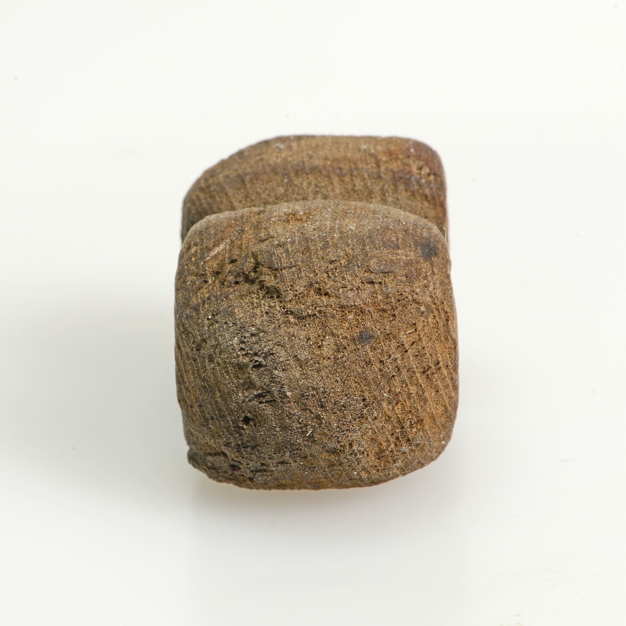 Knop, waarschijnlijk behorende bij houten schijf; uiteinde kaartstok; in het verlengde van de knop bevindt zich het stokgedeelte