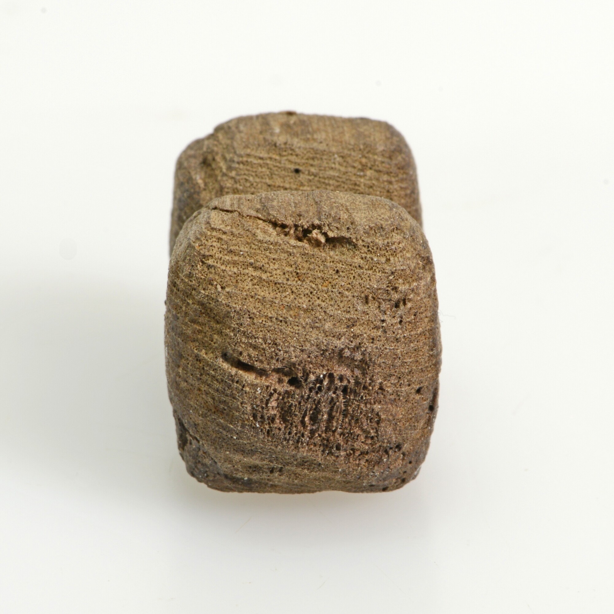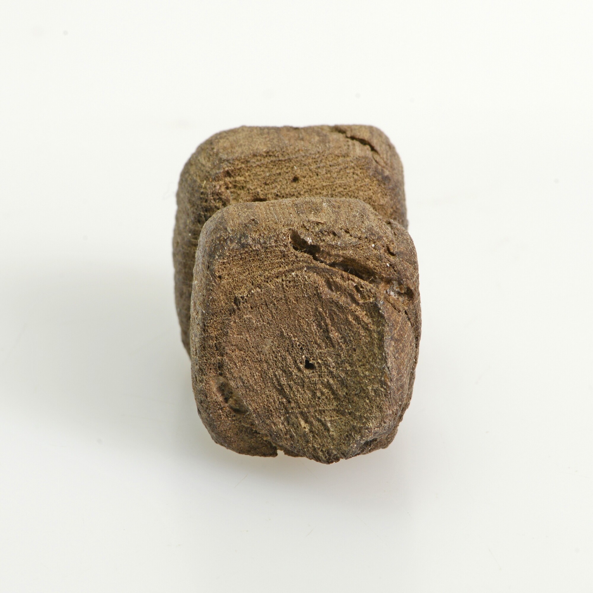 Knop, waarschijnlijk behorende bij houten schijf; uiteinde kaartstok; in het verlengde van de knop bevindt zich het stokgedeelte