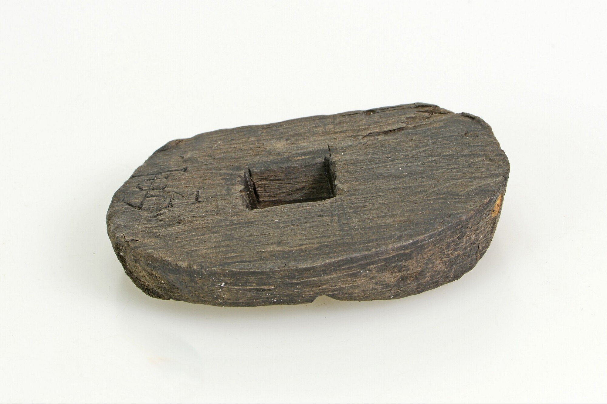 Schijf; licht conisch, met vierkant gat (1.7 x 1.7 cm) zonder knop erin, aan de onderkant een dikke groef dwars over, aan de bovenkant een monogram TCVDM.