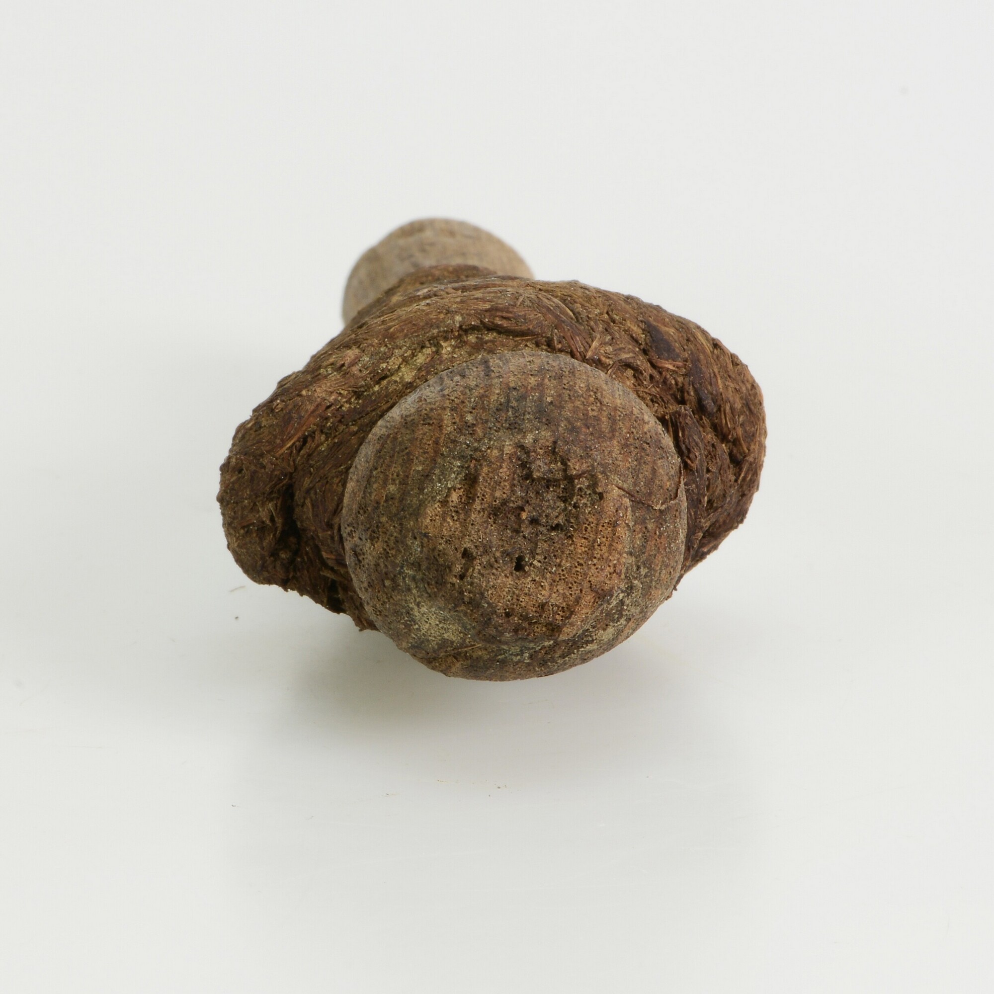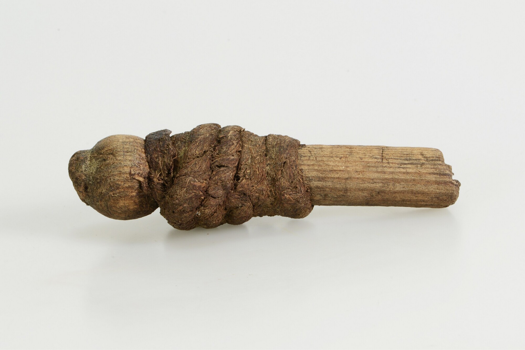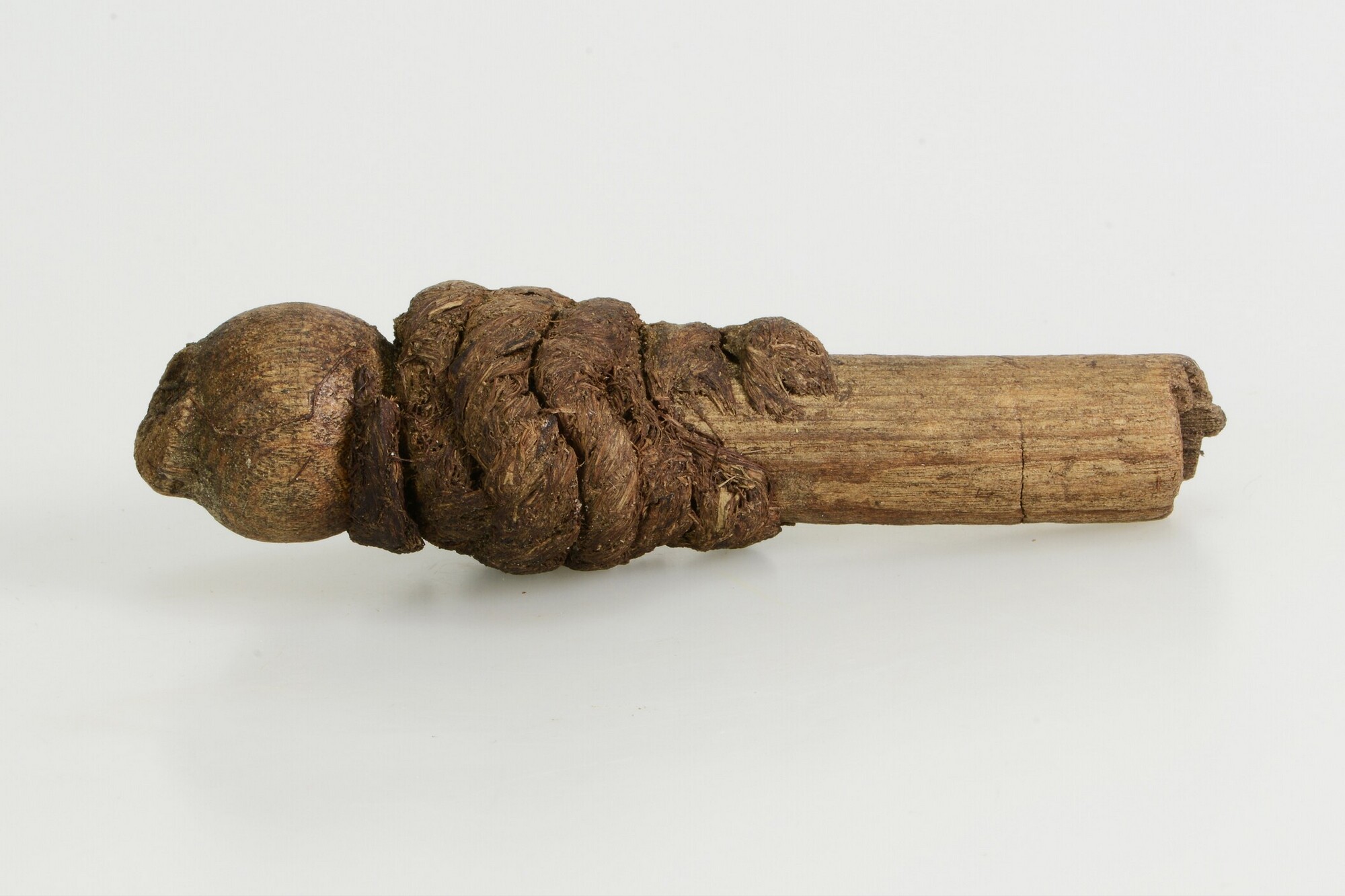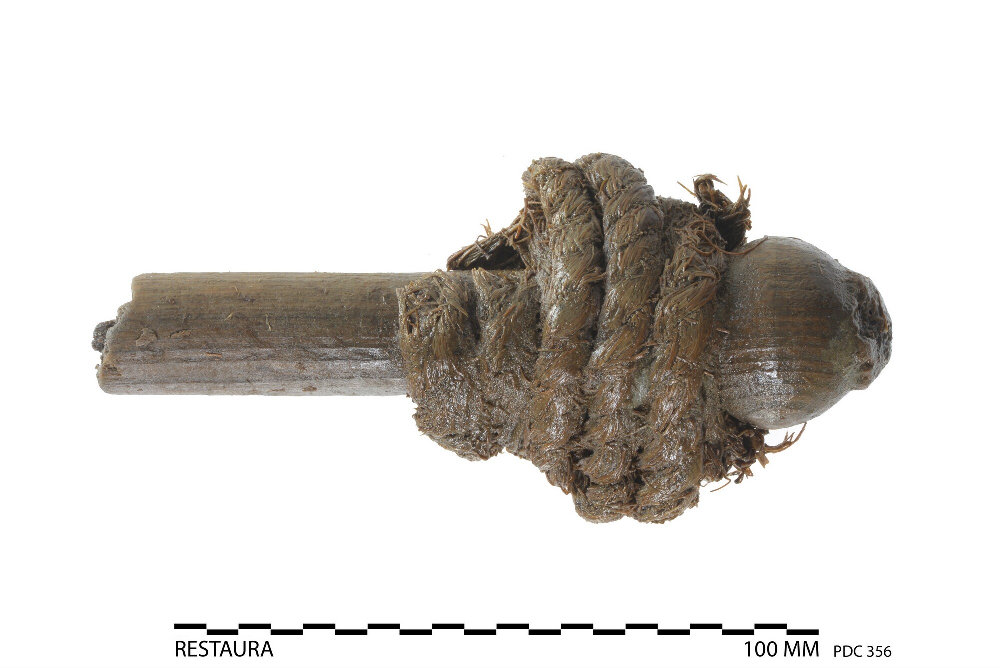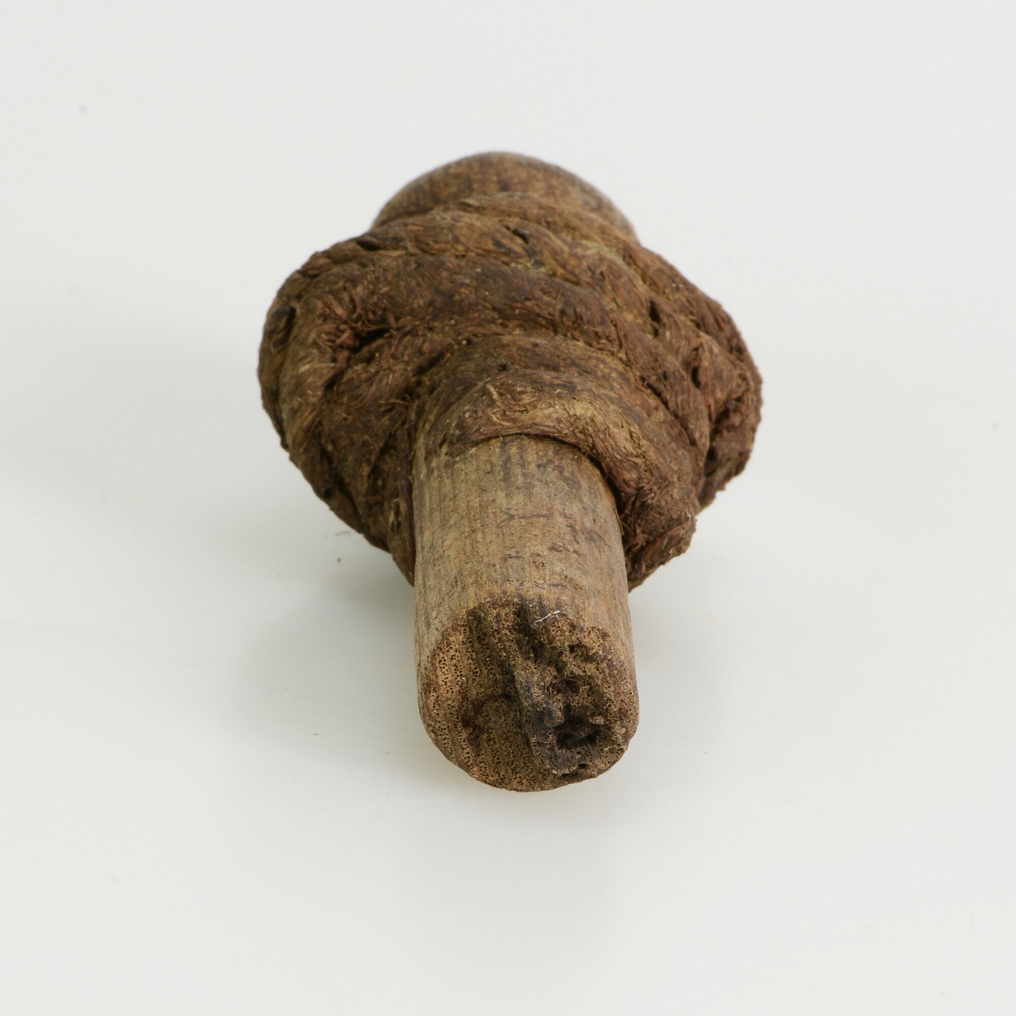 Lontstok; fragment van het voor-middendeel, inclusief de knop van het lontuiteinde, maar het lontuiteinde zelf ontbreekt; de stok is rond: 1.9-2.0 cm; hieromheen gewikkeld ligt een restant van twee lagen lont, driestrengs, rechtsgeslagen, diameter=0.6-0.9 cm; de knop naar het lontuiteinde is vrijwel rond: 2.7-2.9 cm en onversierd. Nat gewicht: 64 gram.
