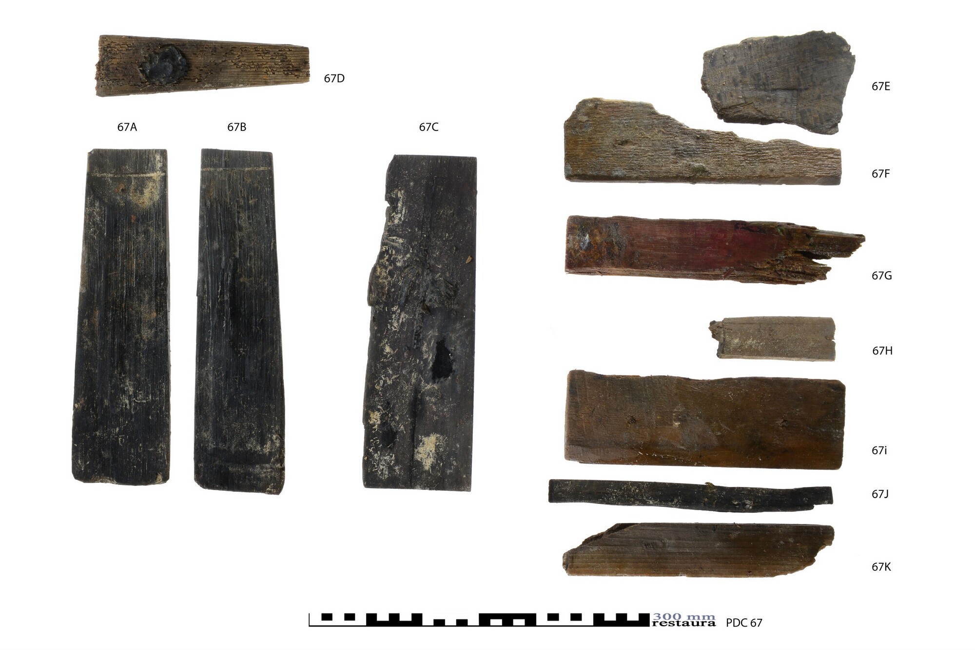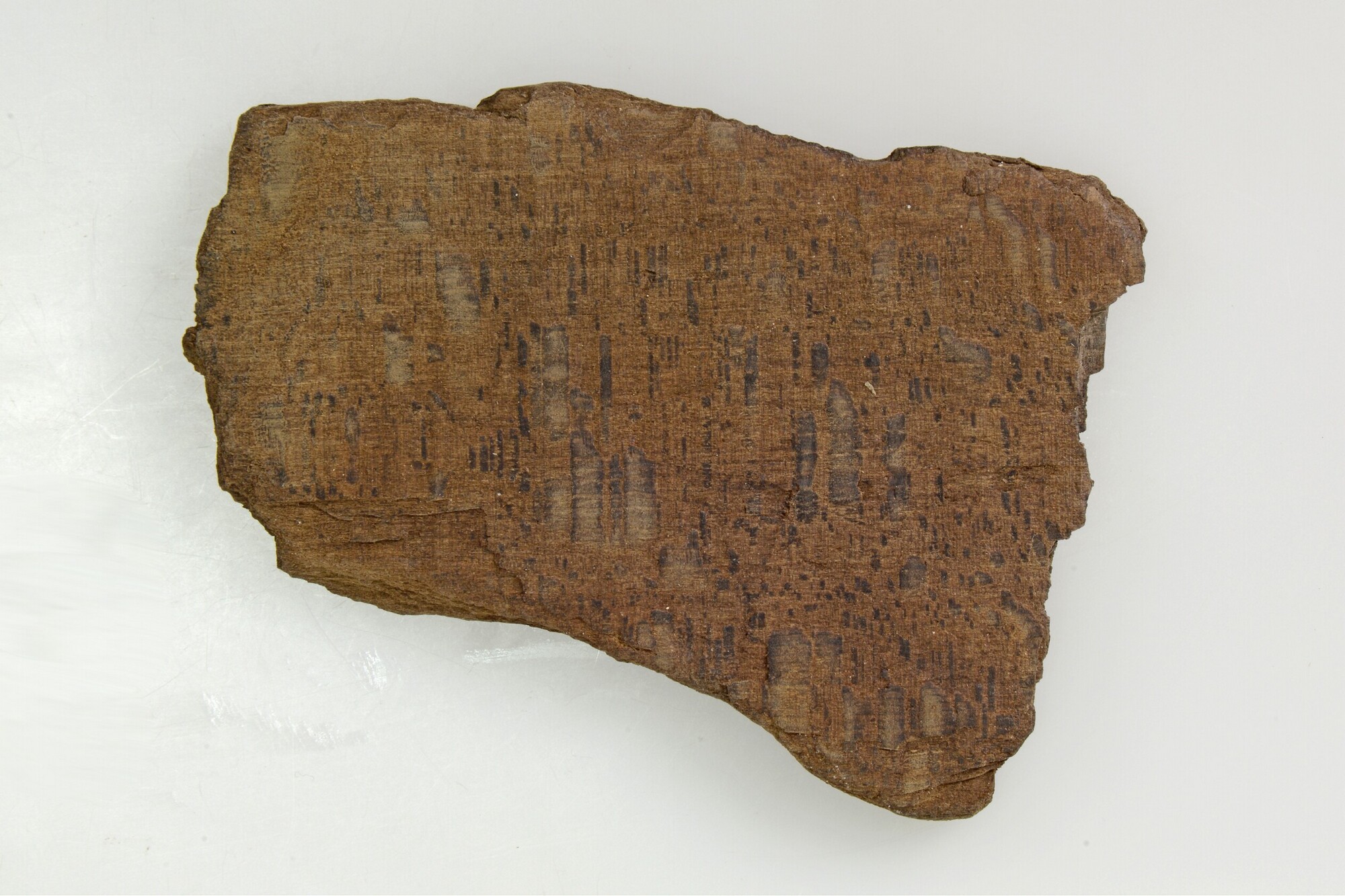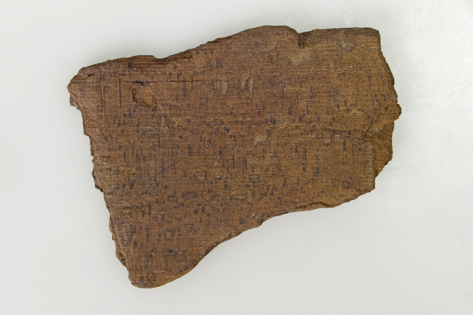 Fragment houten plat uit boekband?; rondom afgebroken, dun plankje