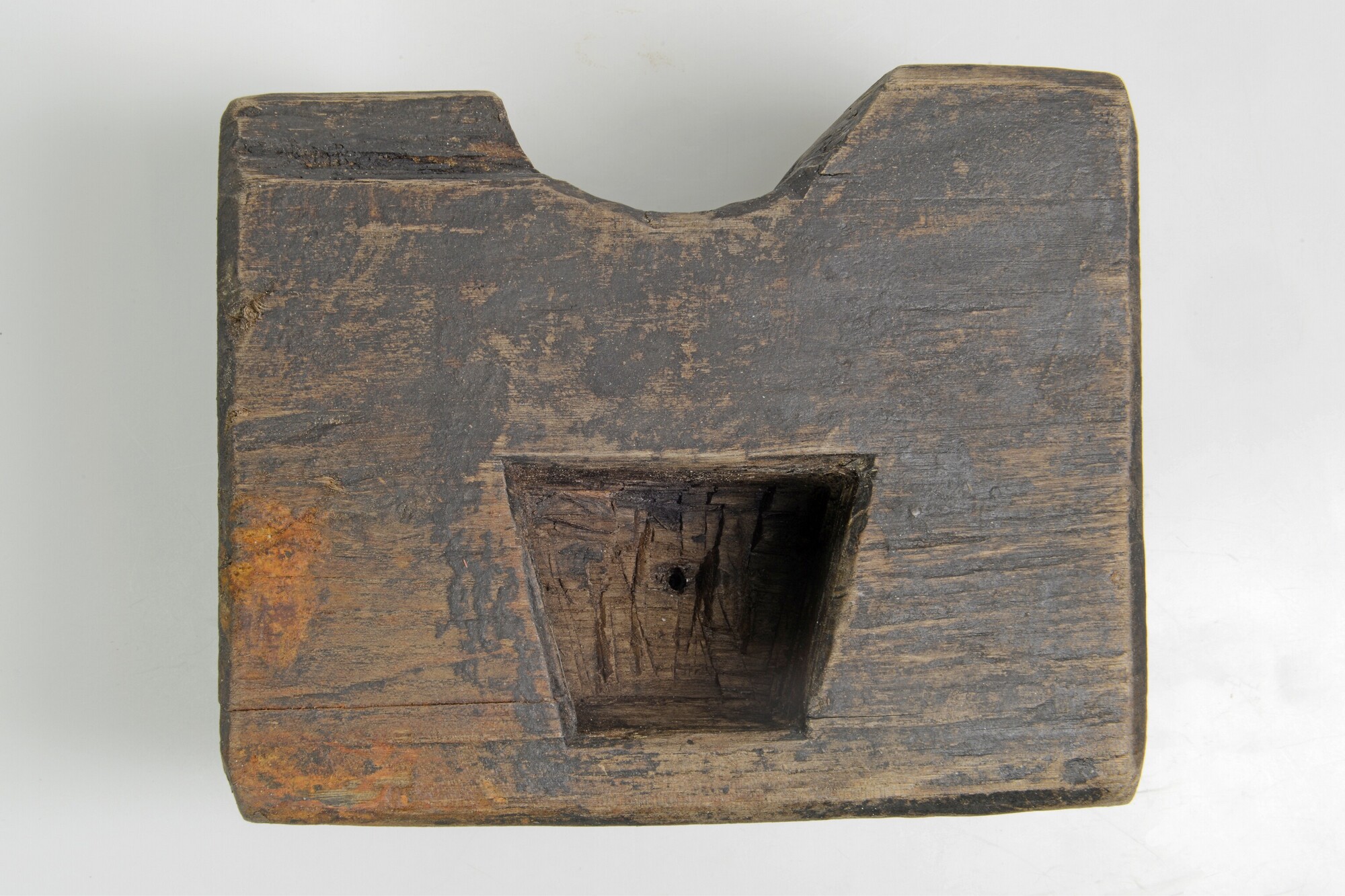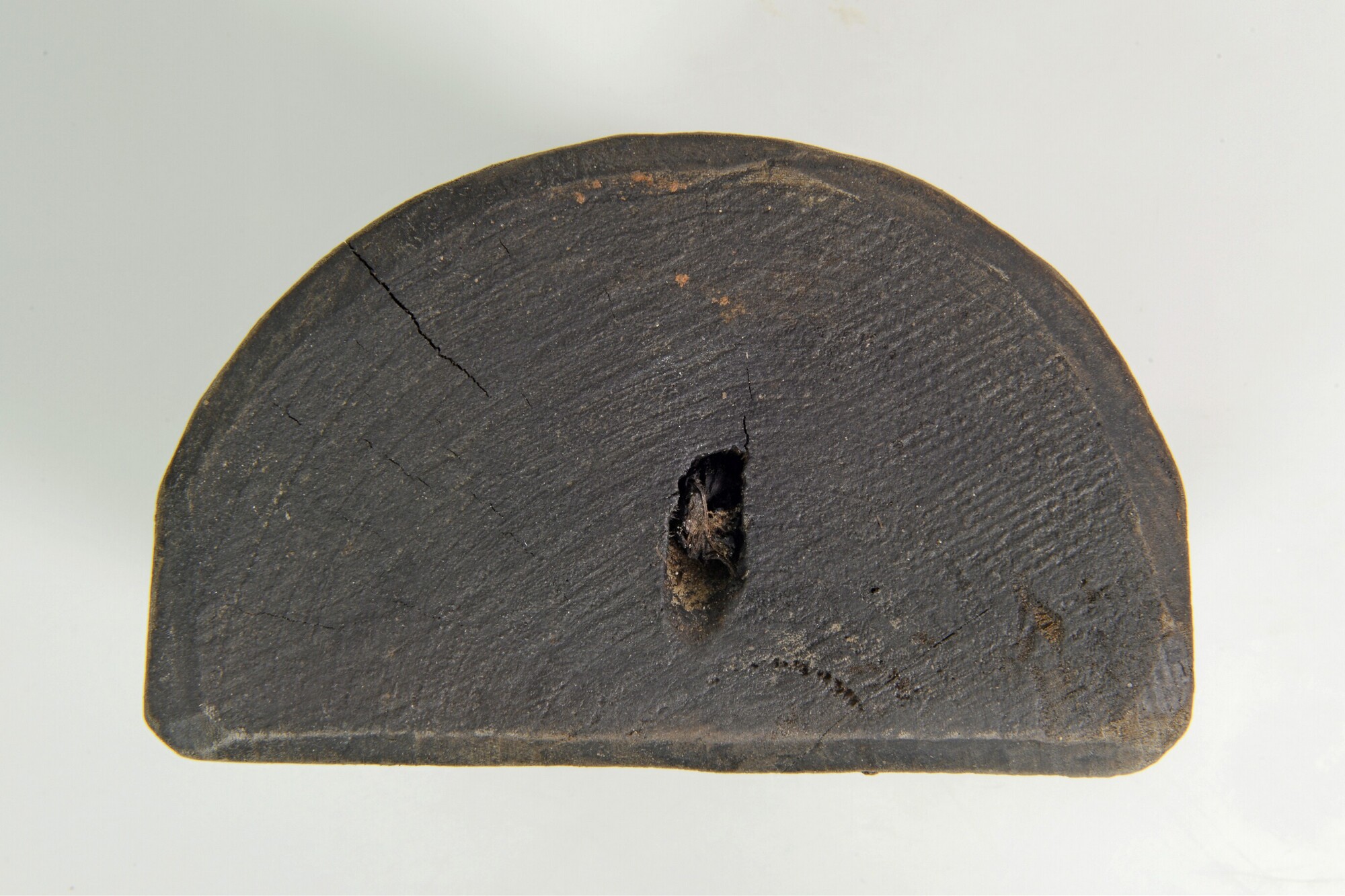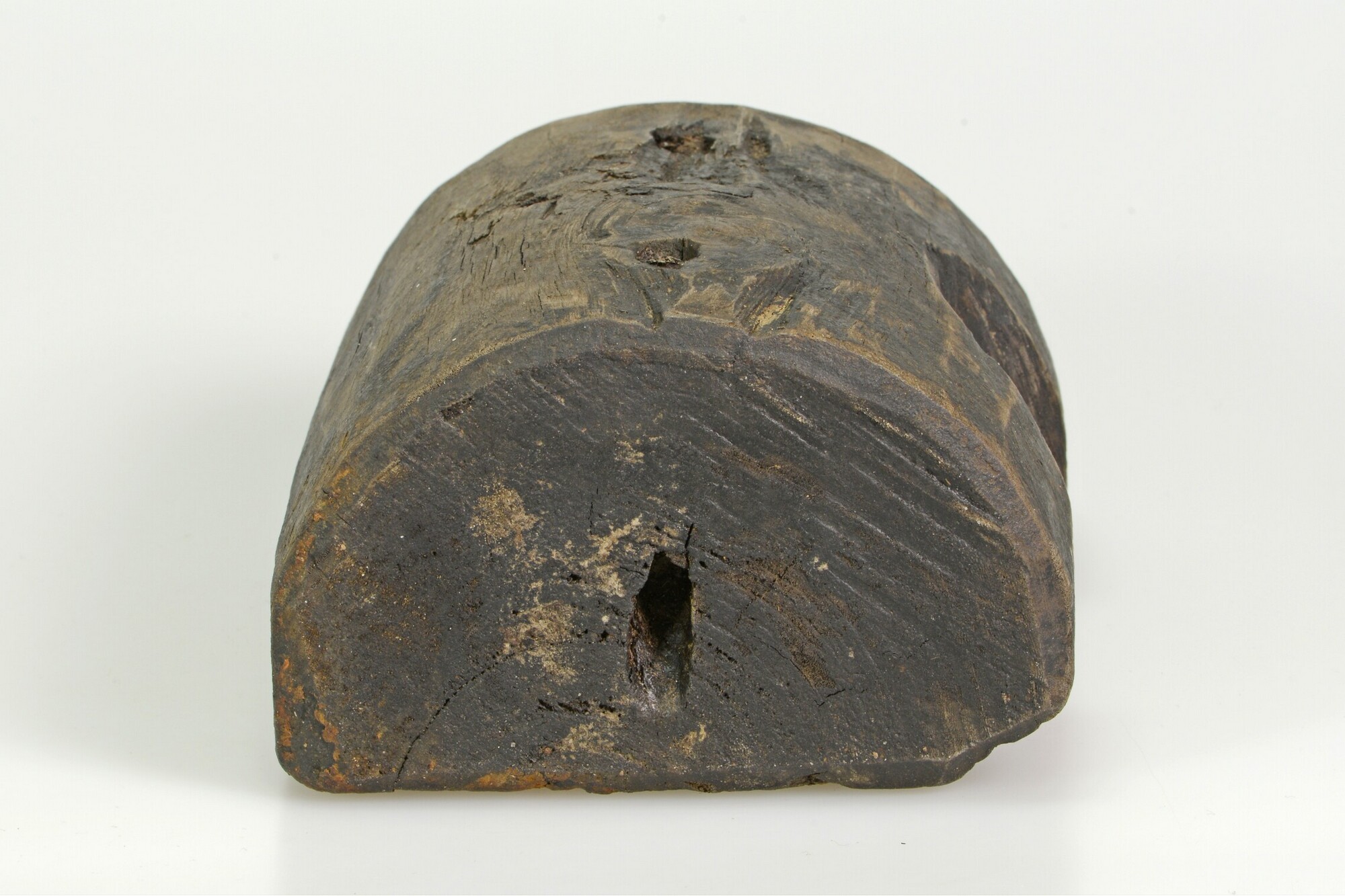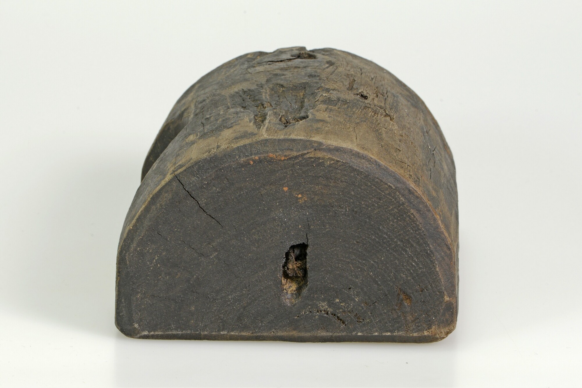 Ezelshoofd; halfrond met trapeziumvormige en ronde uitsparing; resten van touw in twee gaten aan de bovenkant en aan elk van beide zijkanten; klein spijkergat middenboven
