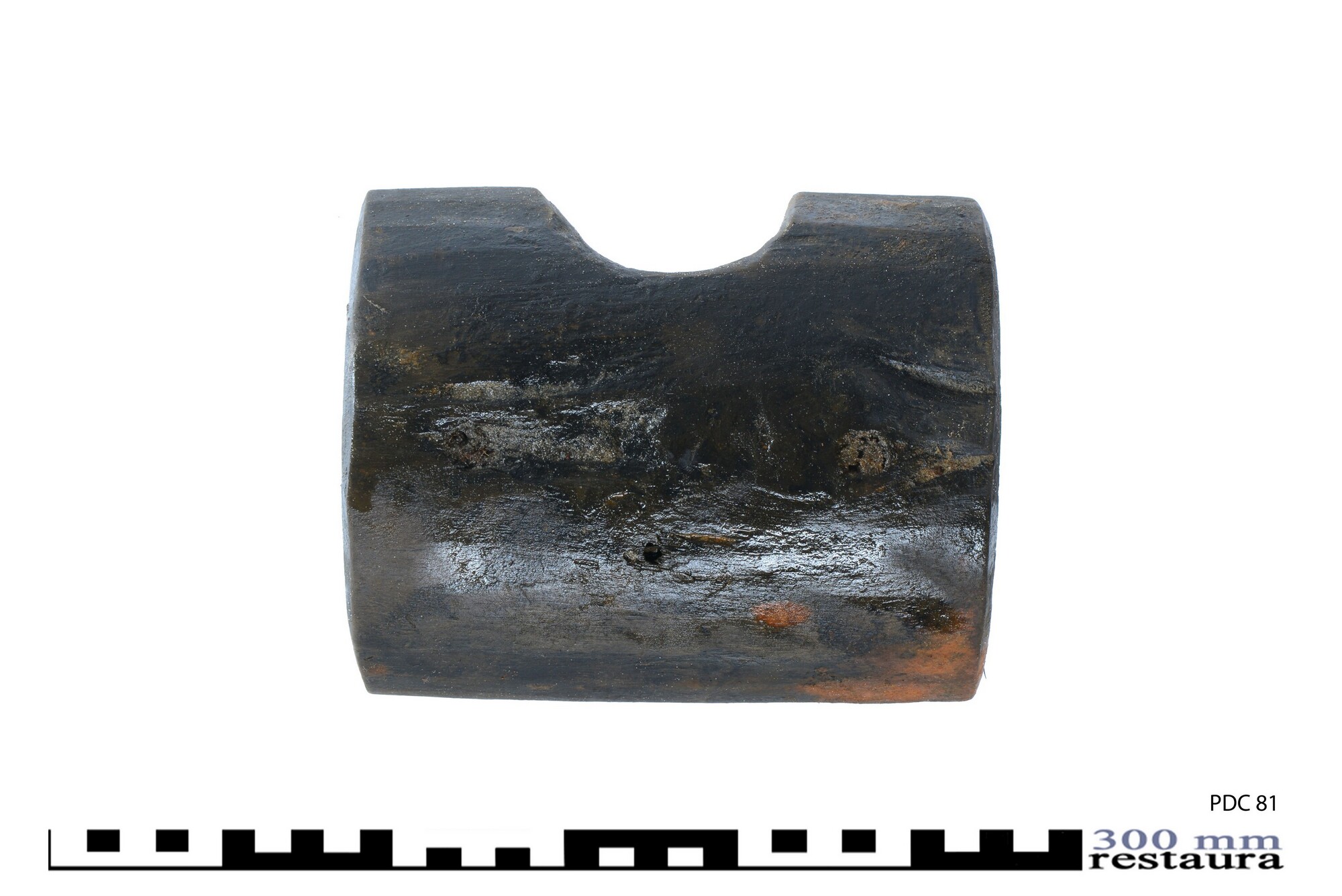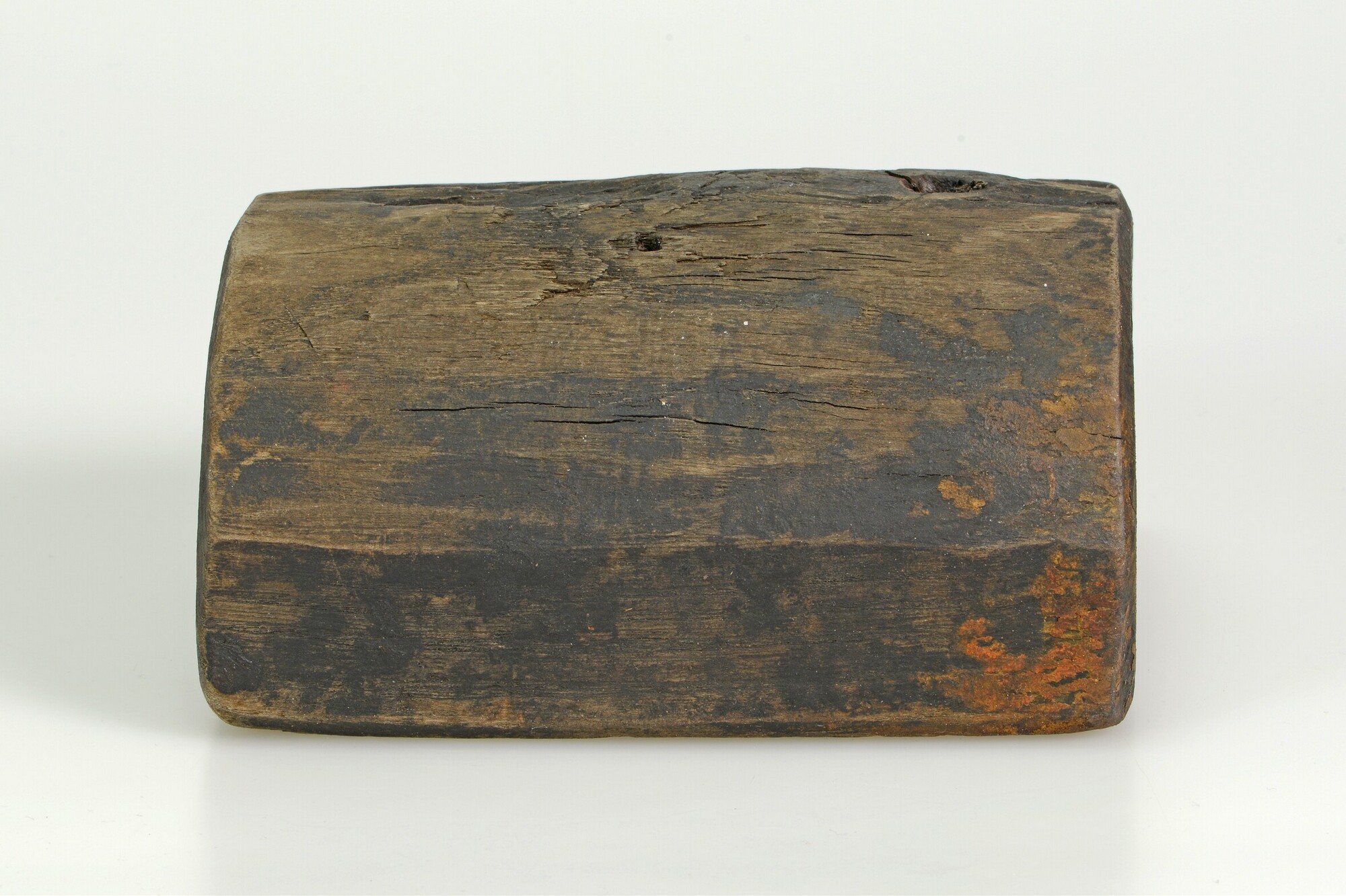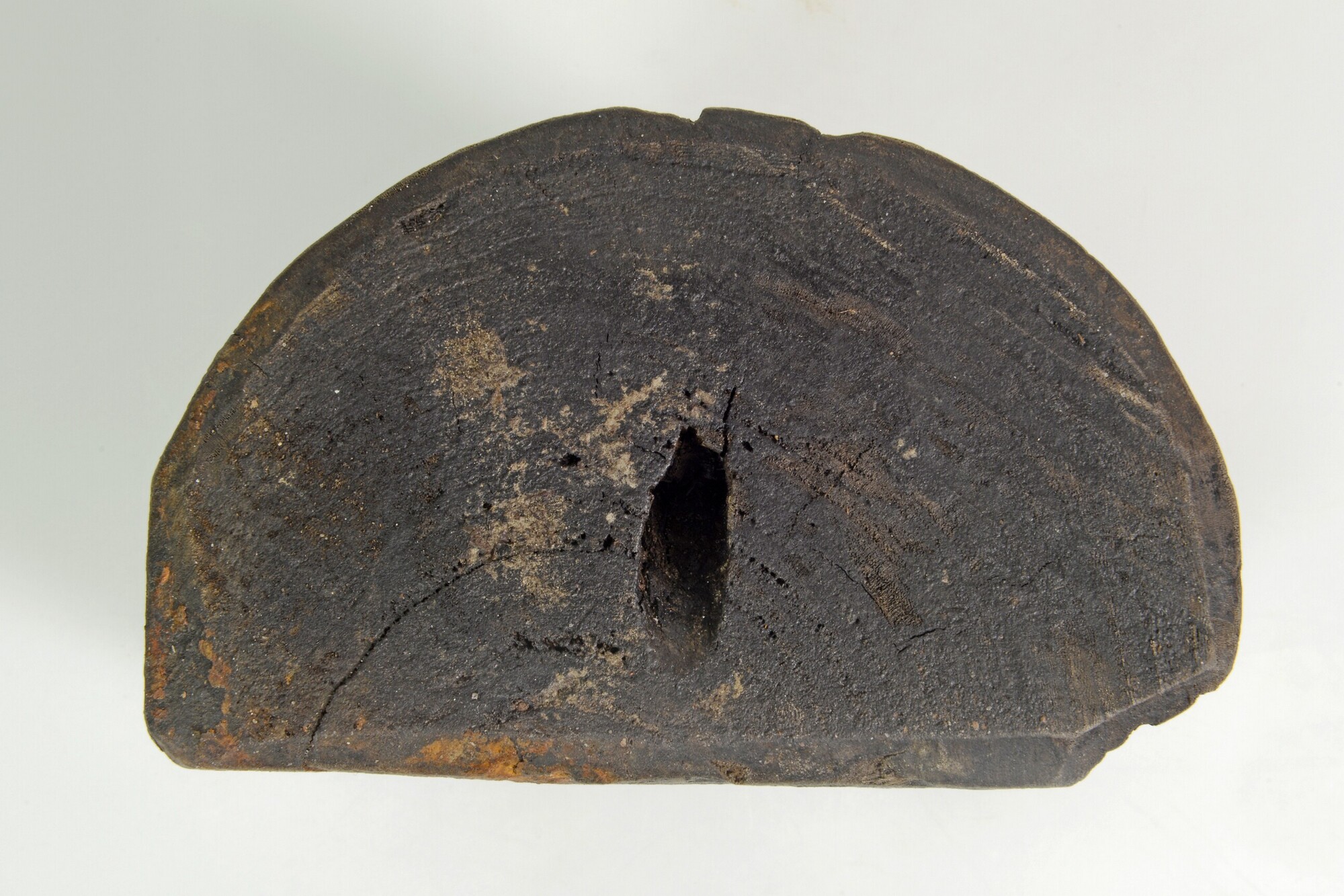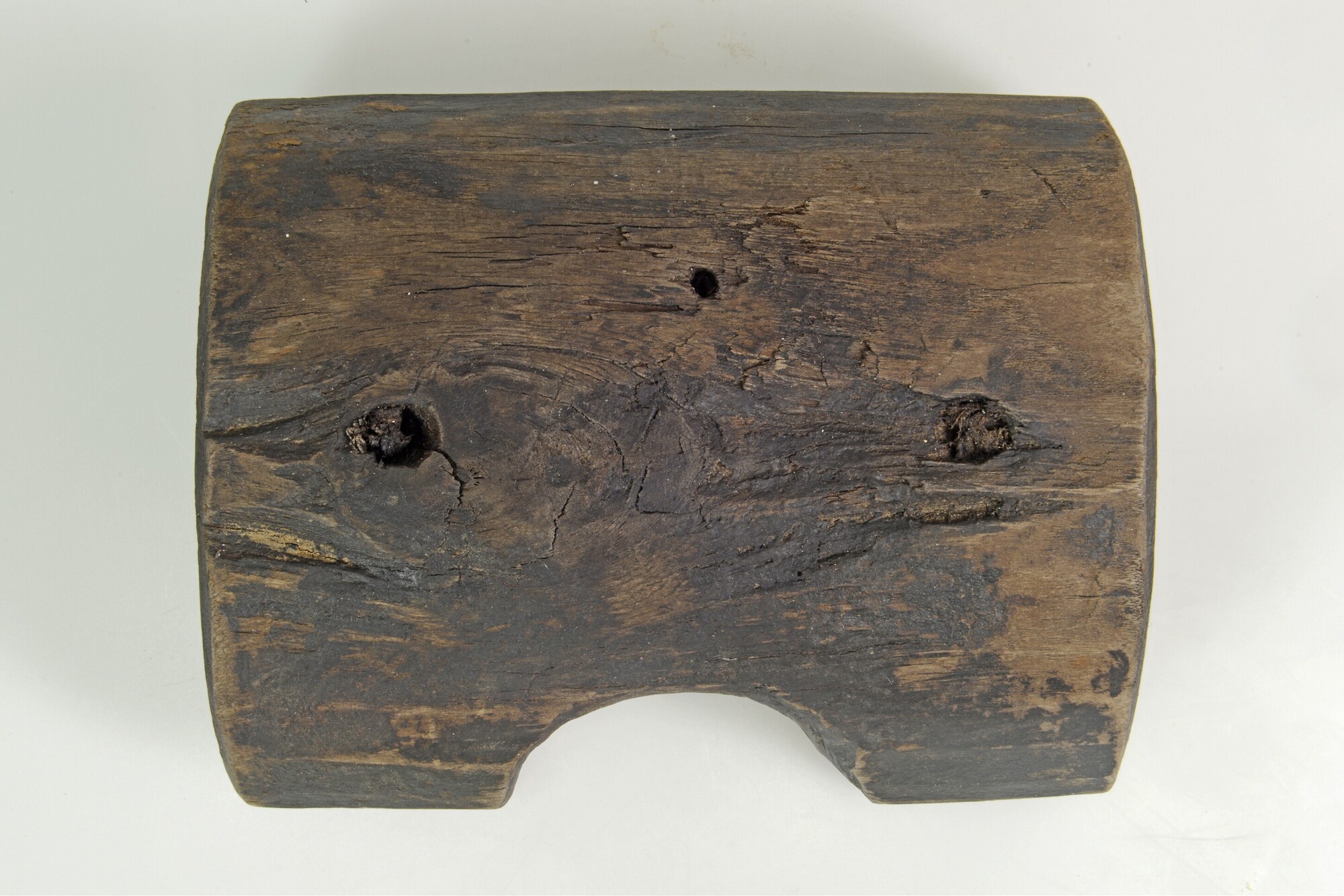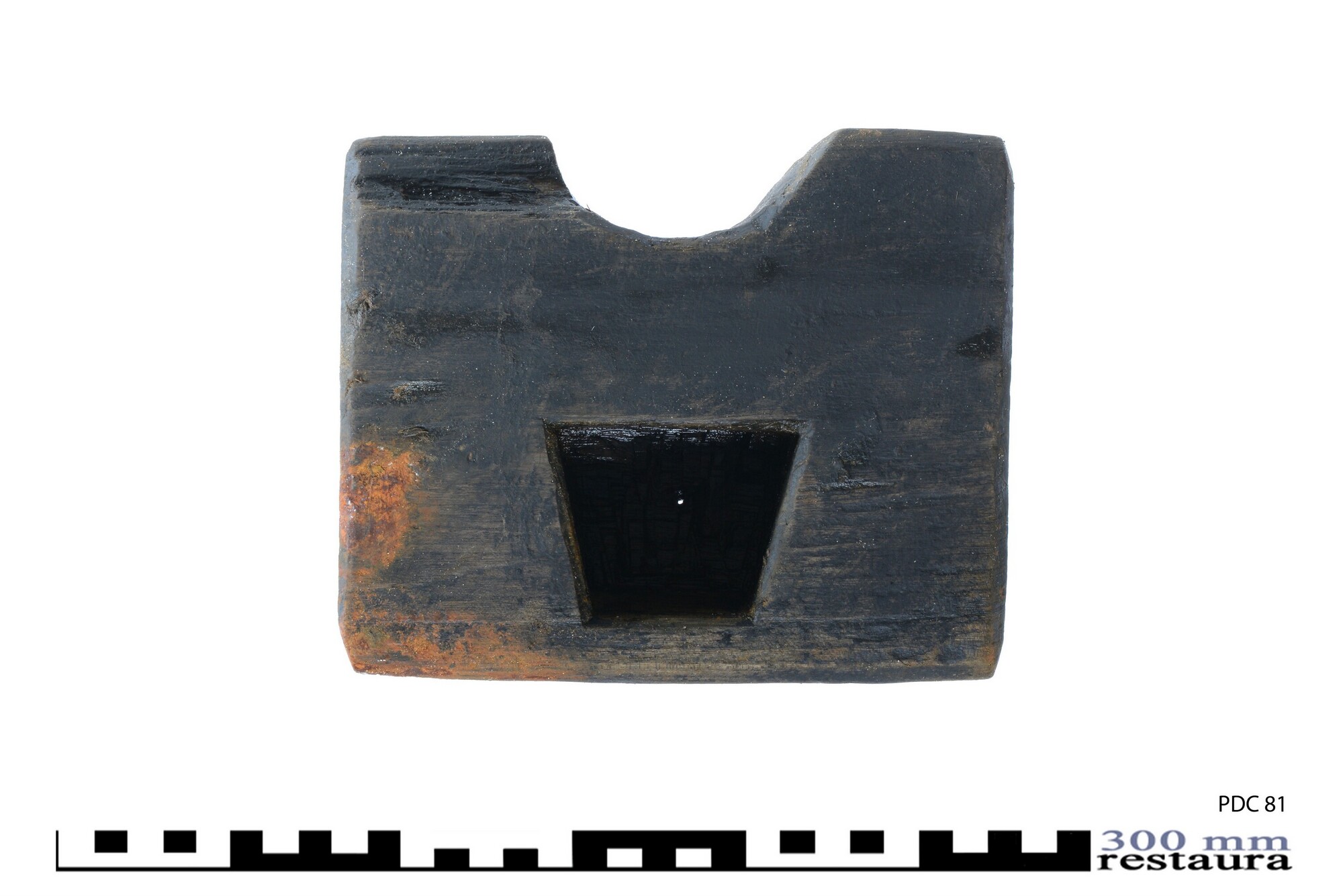 Ezelshoofd; halfrond met trapeziumvormige en ronde uitsparing; resten van touw in twee gaten aan de bovenkant en aan elk van beide zijkanten; klein spijkergat middenboven