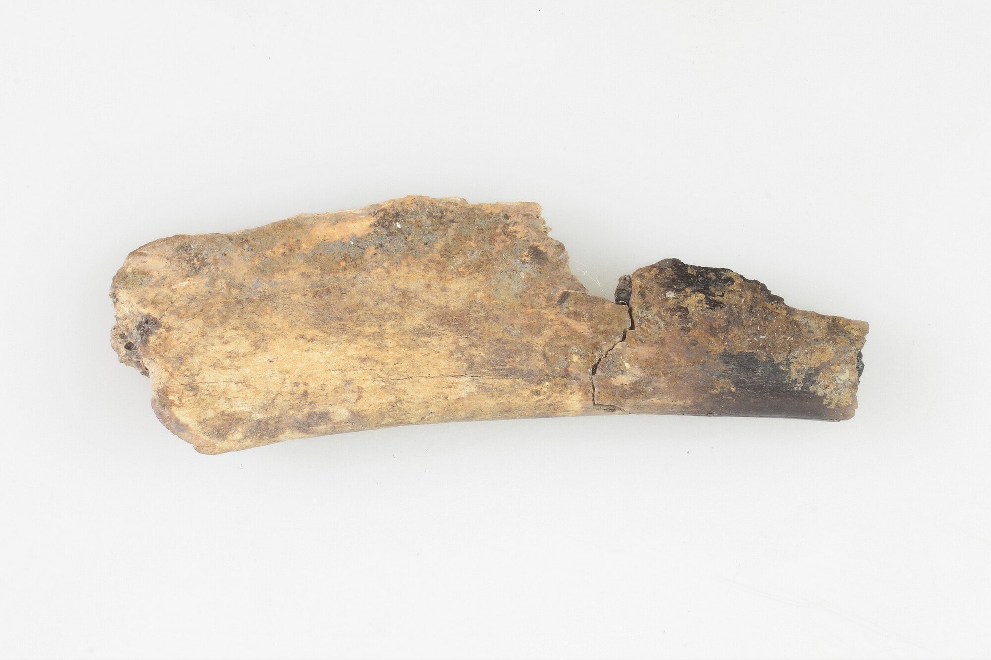 Bobbelkam; bot; rib van een groot zoogdier aan één zijde bewerkt tot een bobbelig oppervlak; deels gepolijst; deels verbrand; met gebruikssporen