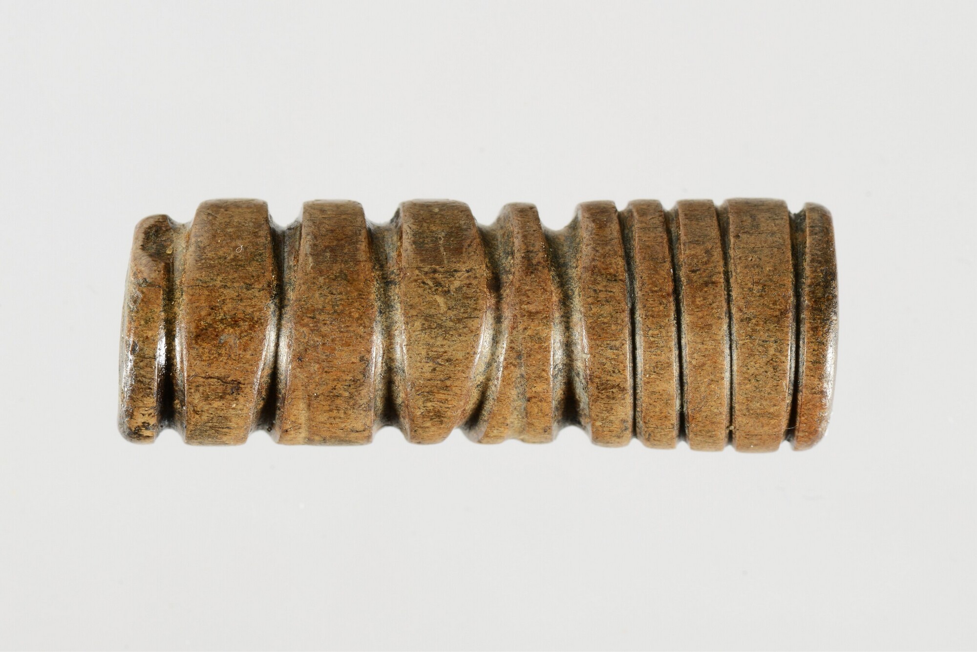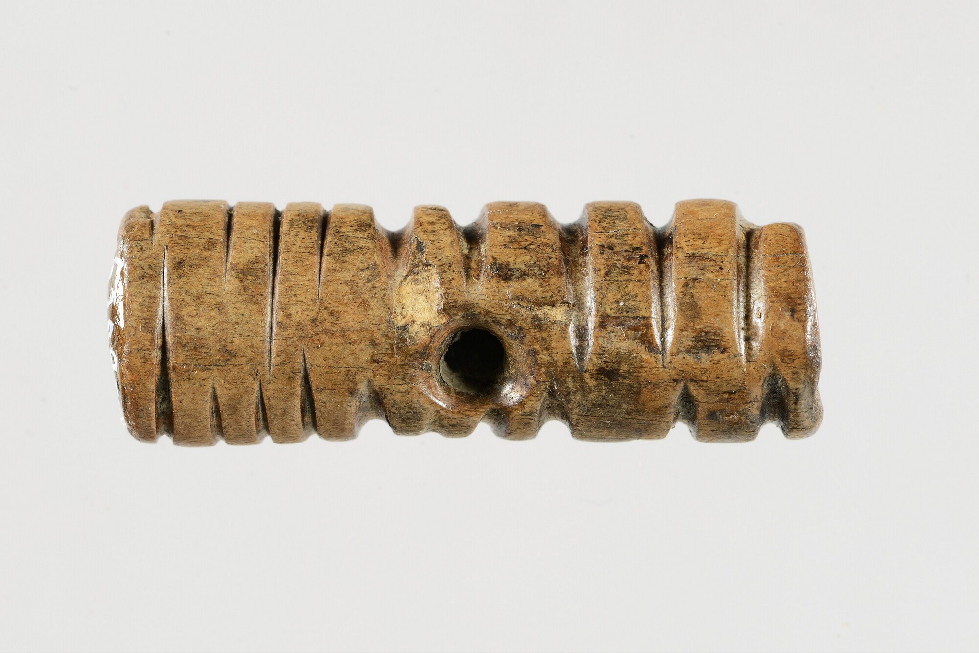 Kraal; gemaakt uit het middenstuk (diafyse) van de tibia van een schaap/geit; versierd met lange parallelle groeven, waarschijnlijk aangebracht met een vuurstenen werktuig; in het midden een doorboring; gepolijst; vondstdatum: 20-4-1993