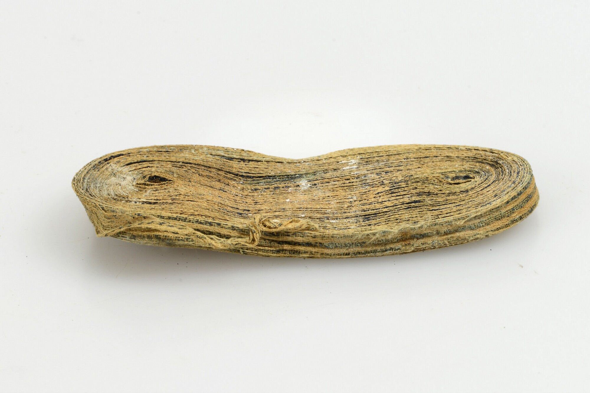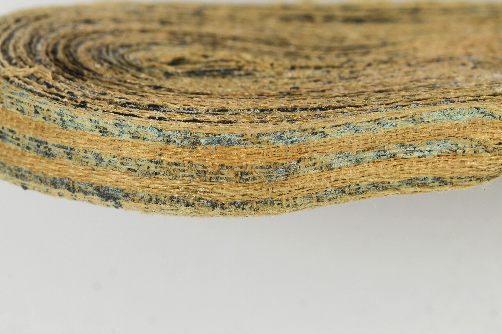Band, opgerold; goudkleurig met drie donkere banen (metaaldraad?) erin geweven; aan elkaar geplakt tot een geheel met een los uiteinde