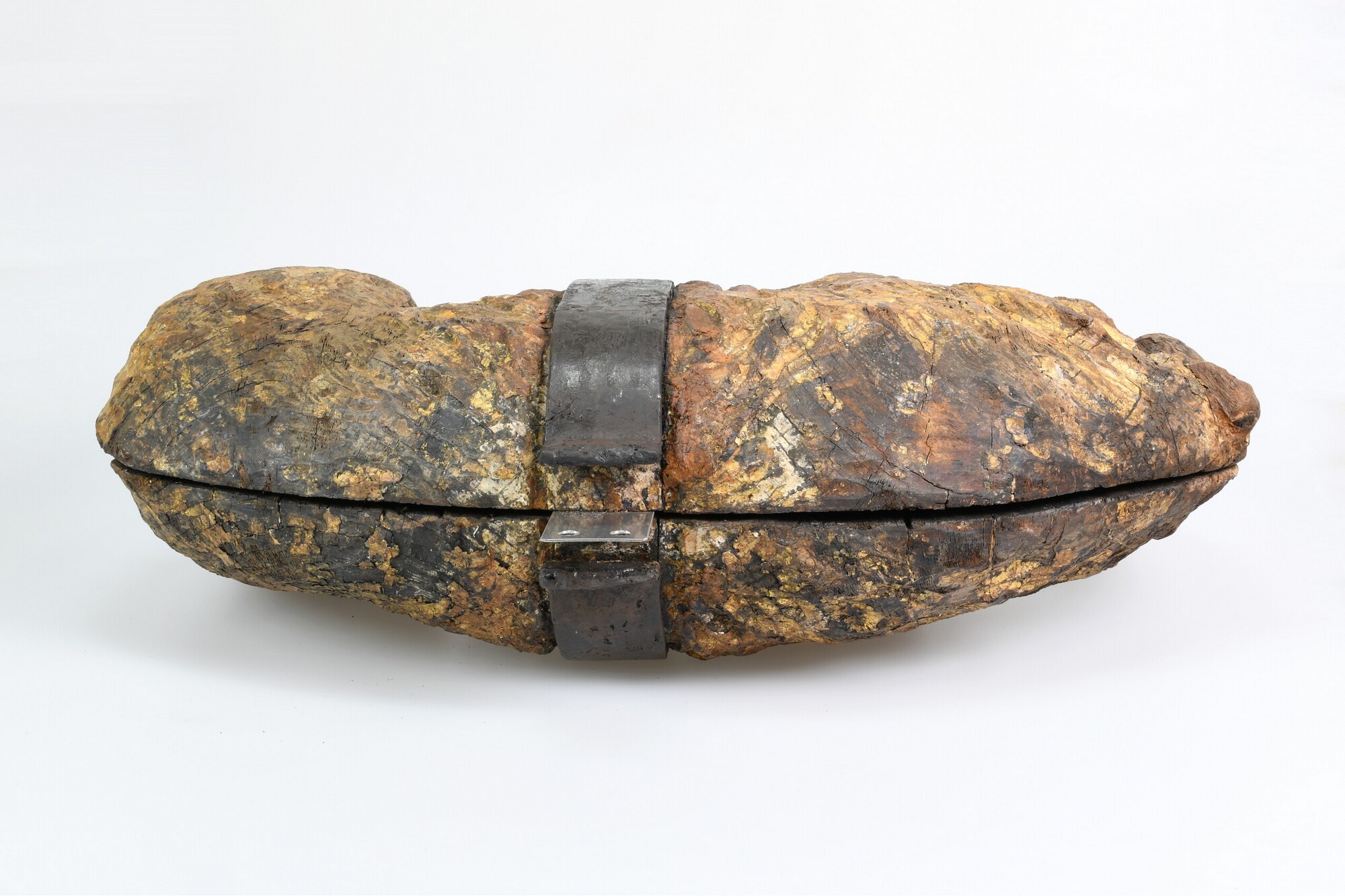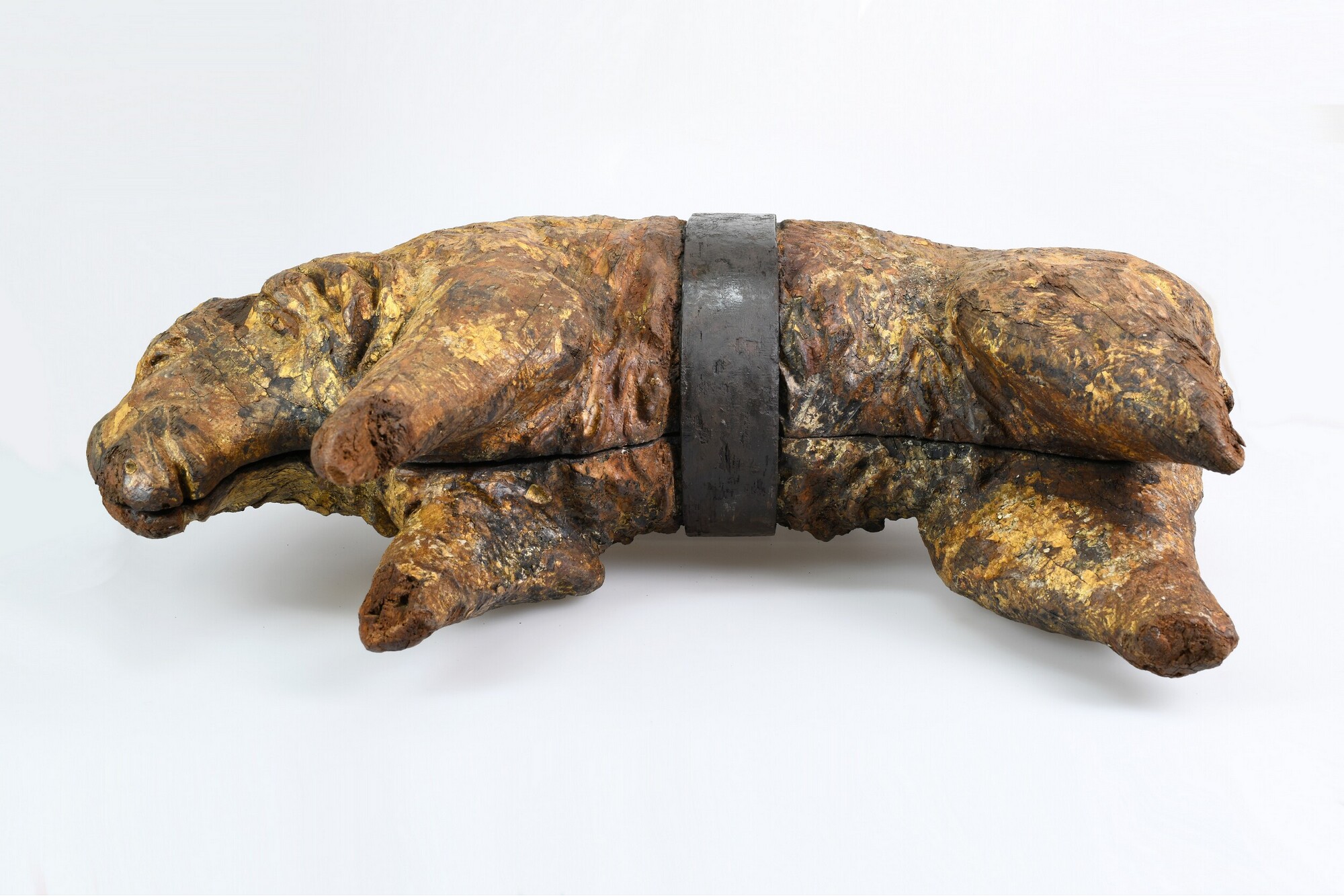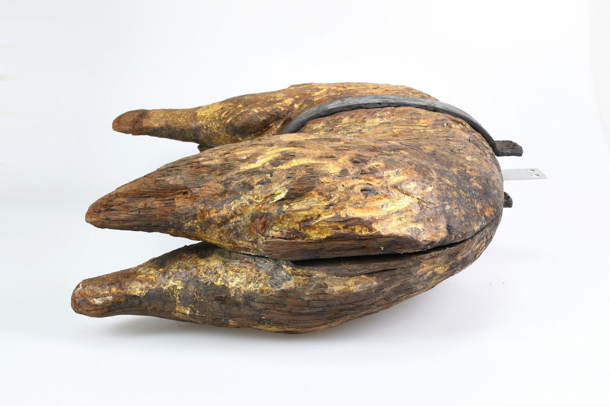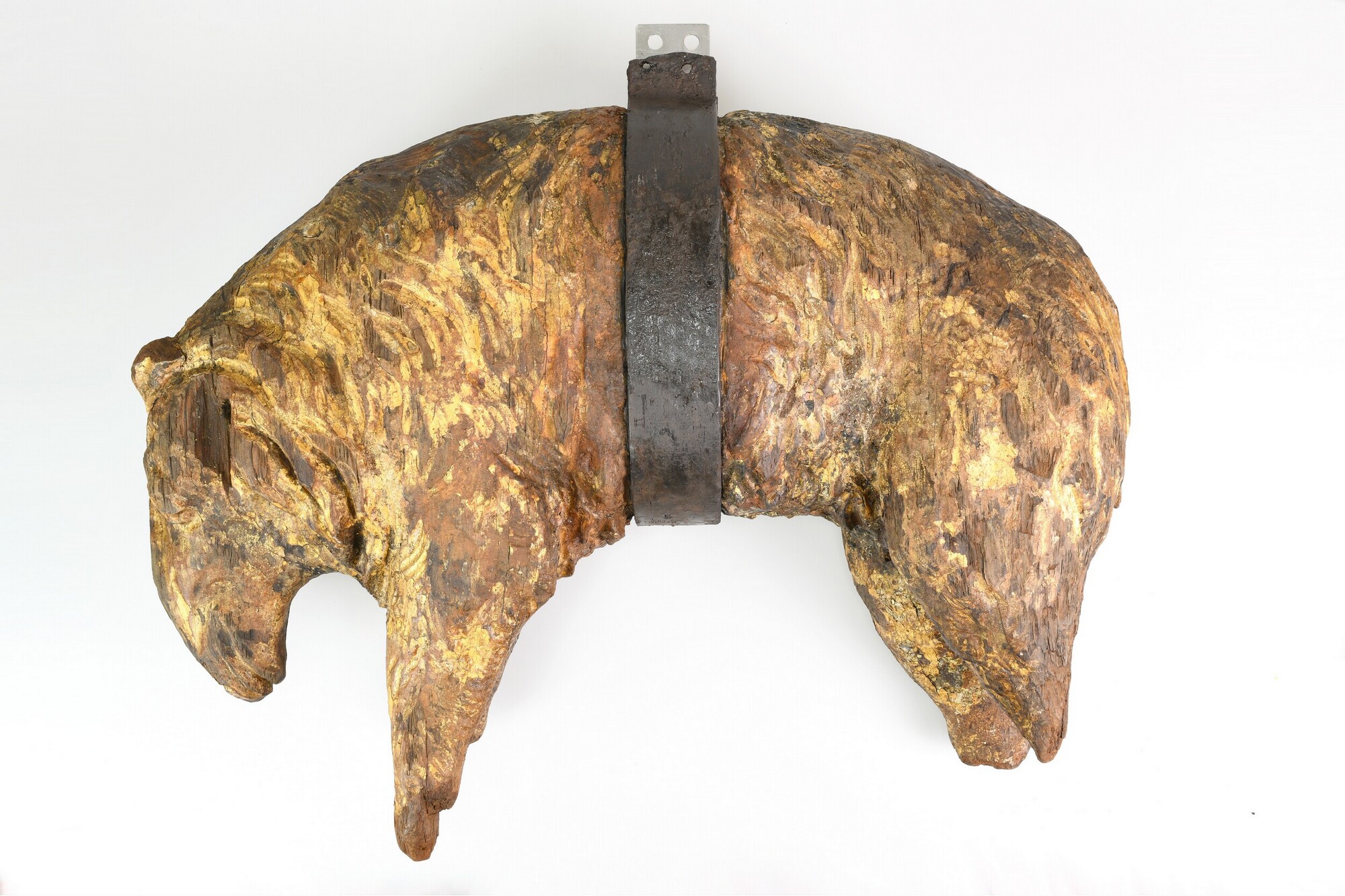 Beeld schaap; hangende ram van hout met ijzeren band om het middel; bedekt met bladgoud; bestaat uit twee helften die door de ijzeren band bijeen worden gehouden; de ontbrekende ramshoorns waren apart aangezet. Symbool van de Orde van het Gulden Vlies.
