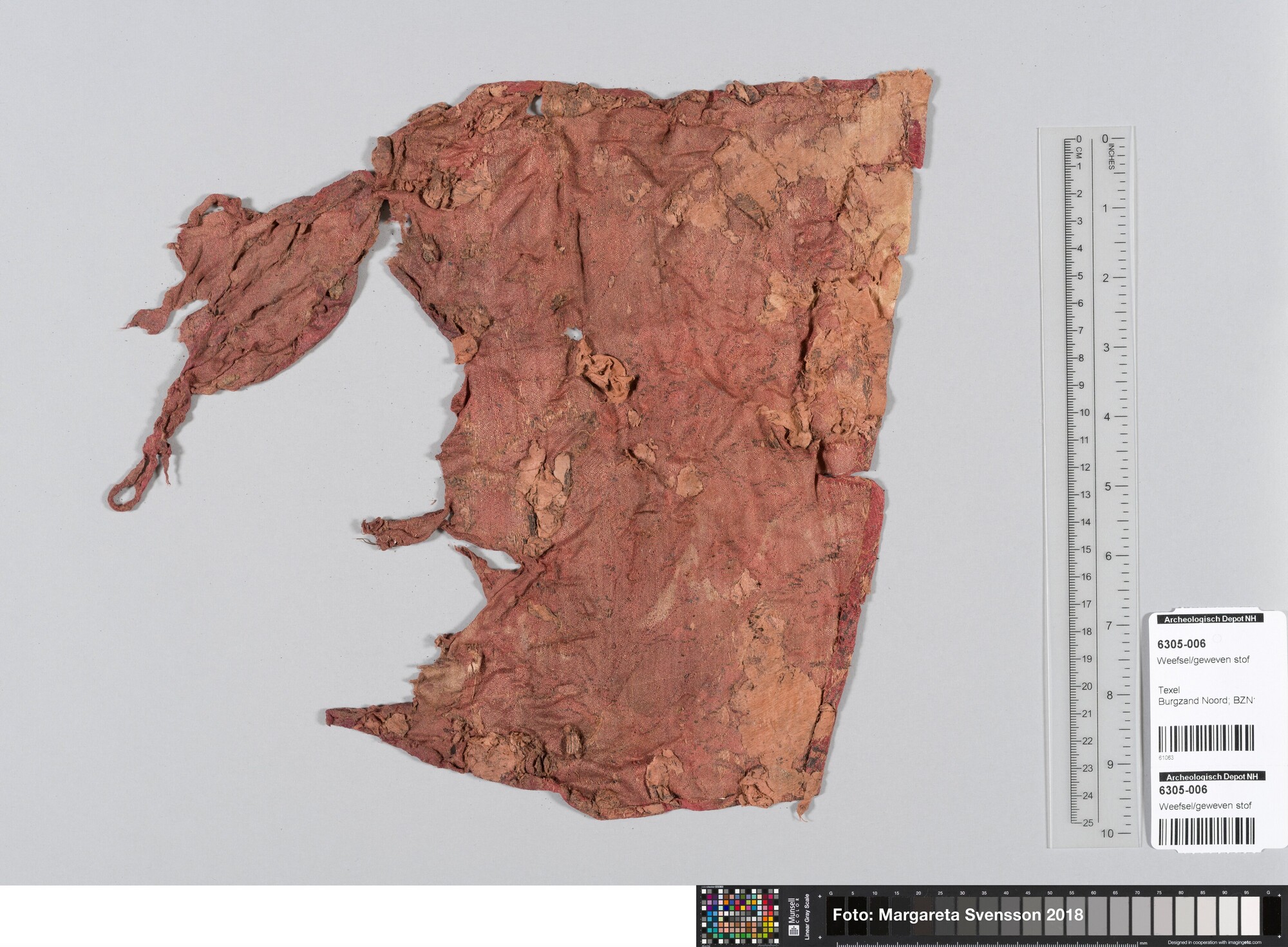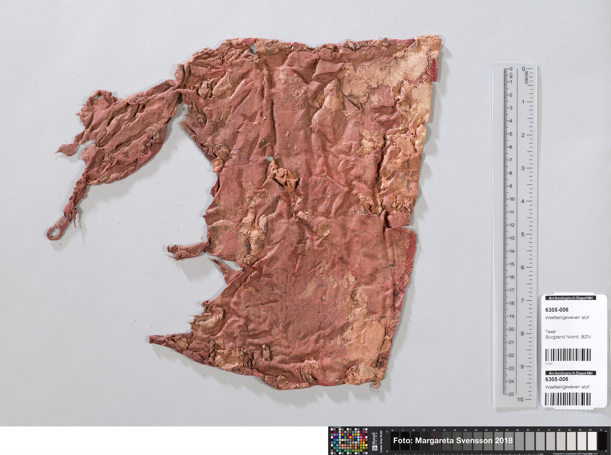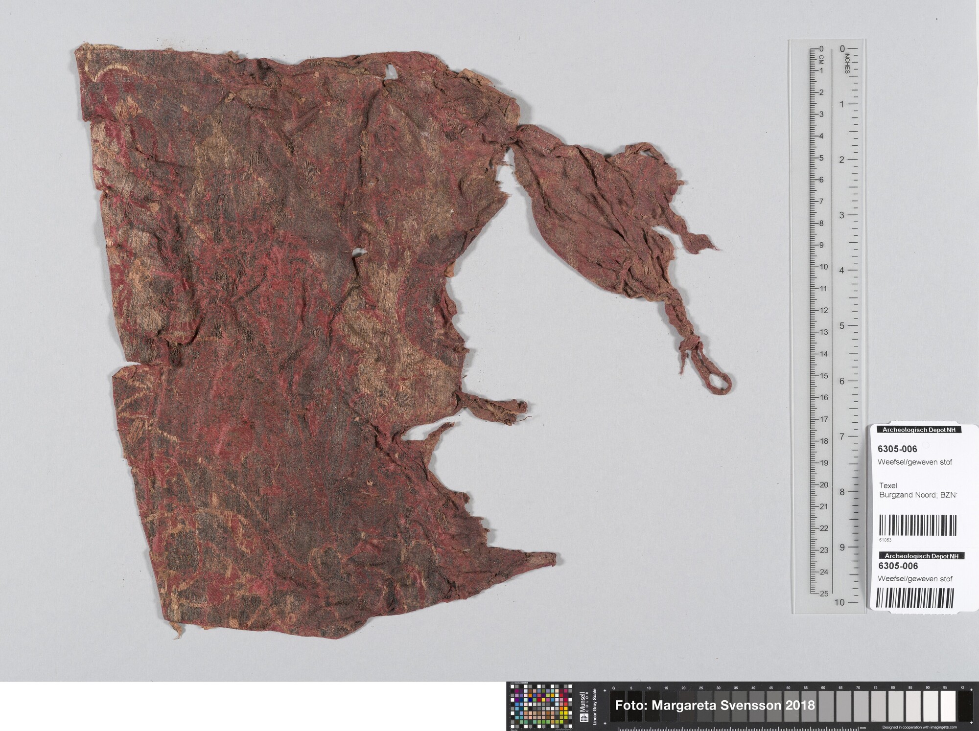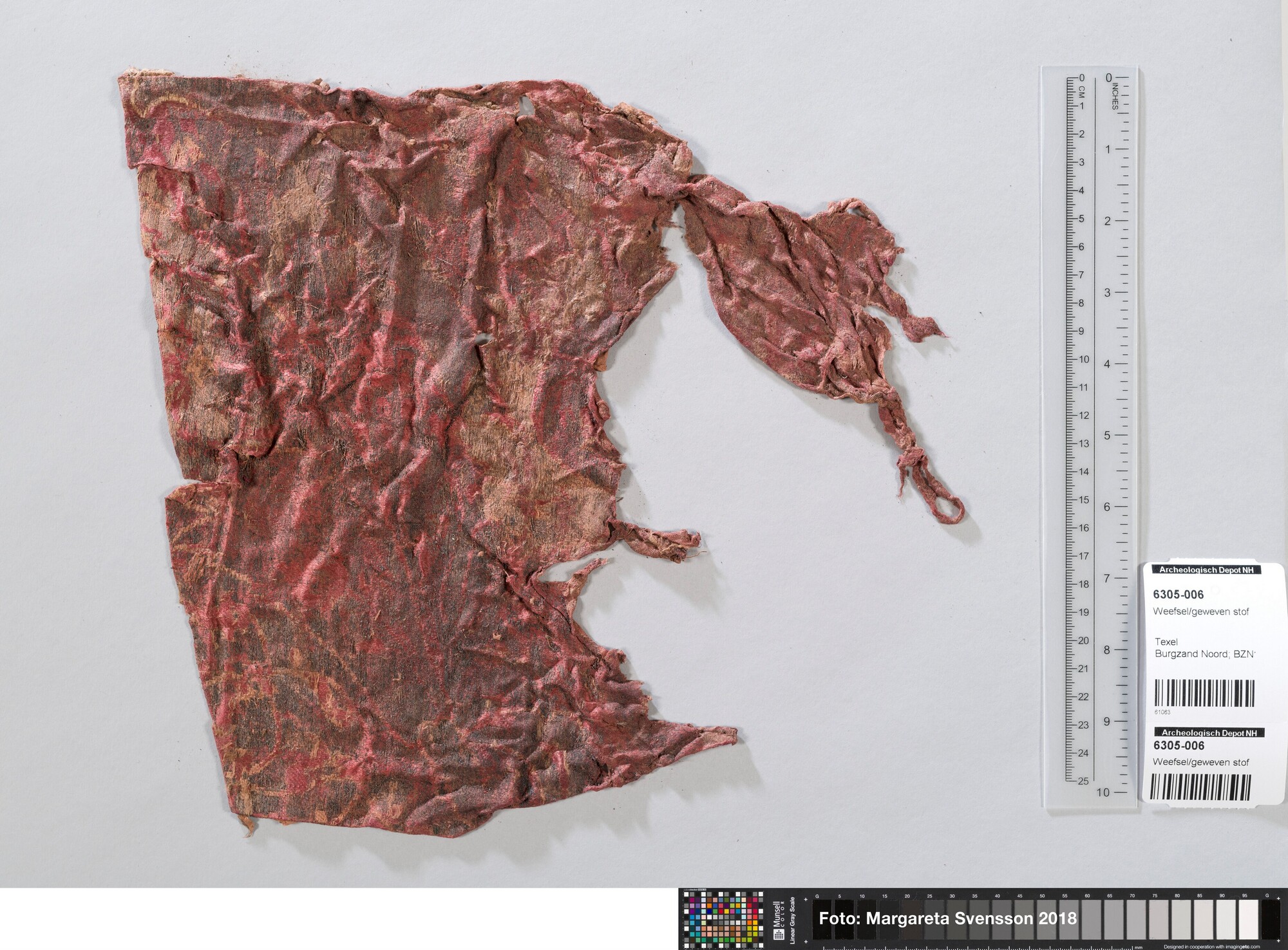 Basisweefsel van satijngeweven zijde. Brokaat weefsel met ingeweven patronen van metaaldraad; naden en/of zomen/randen; waarschijnlijk zat 6305-007 hier aan vast.
