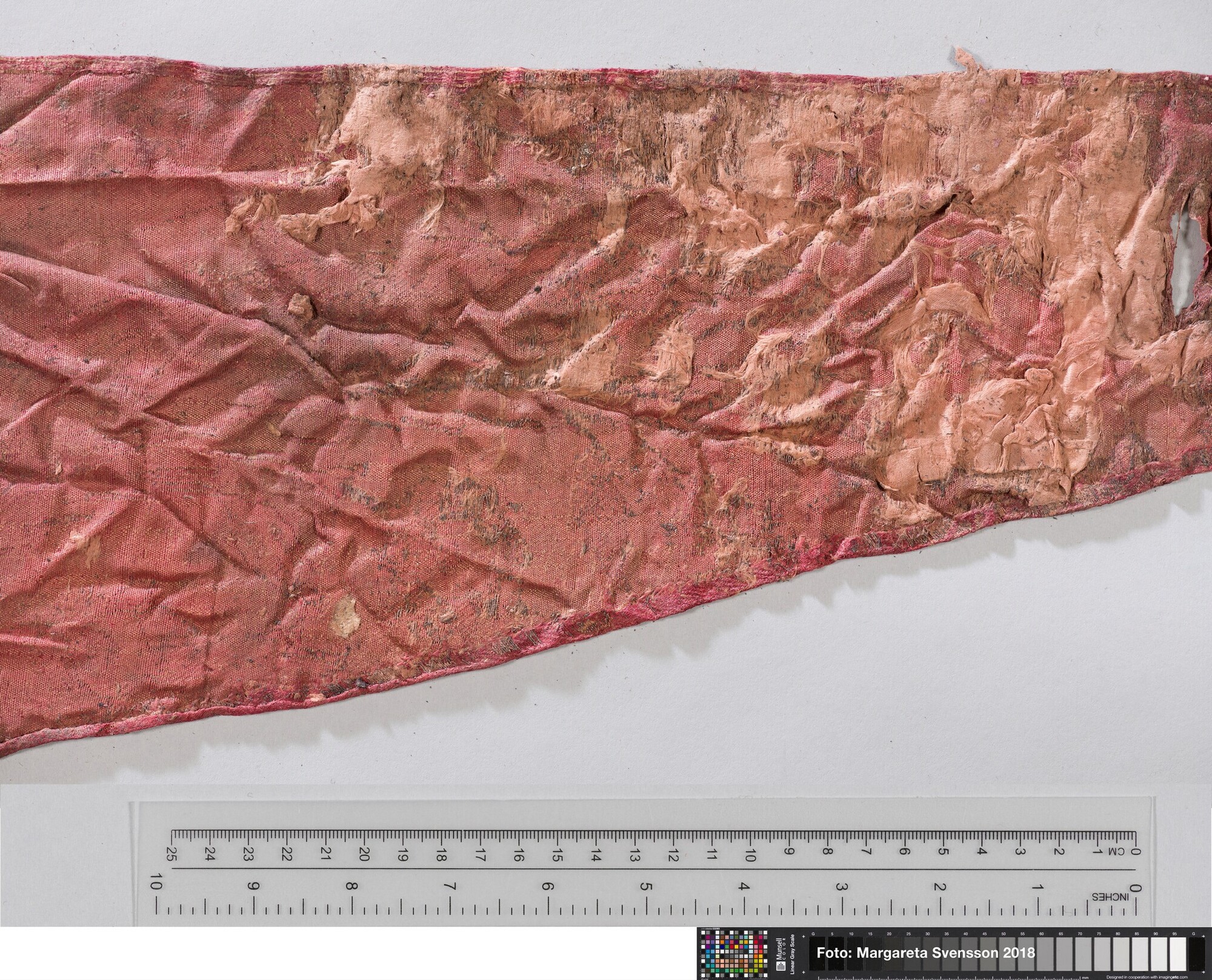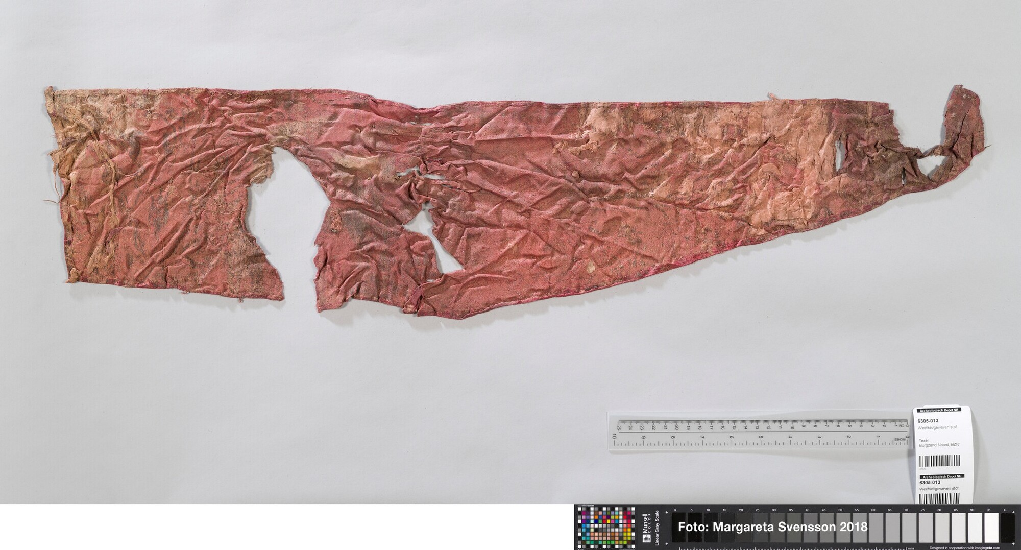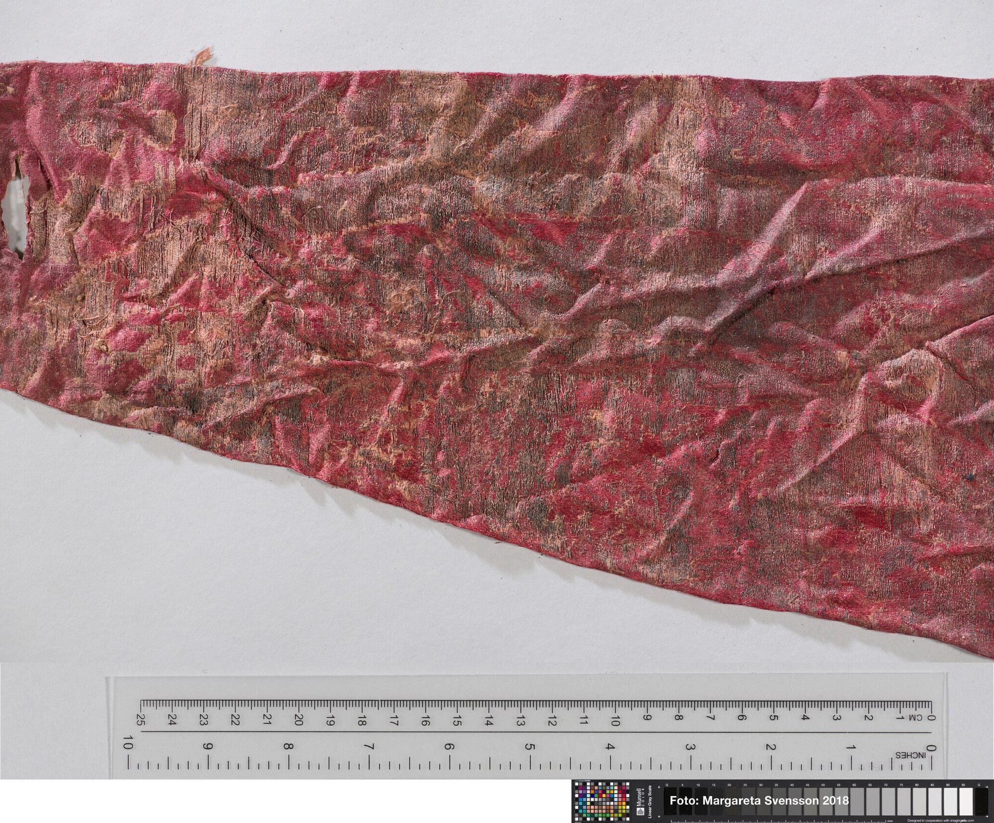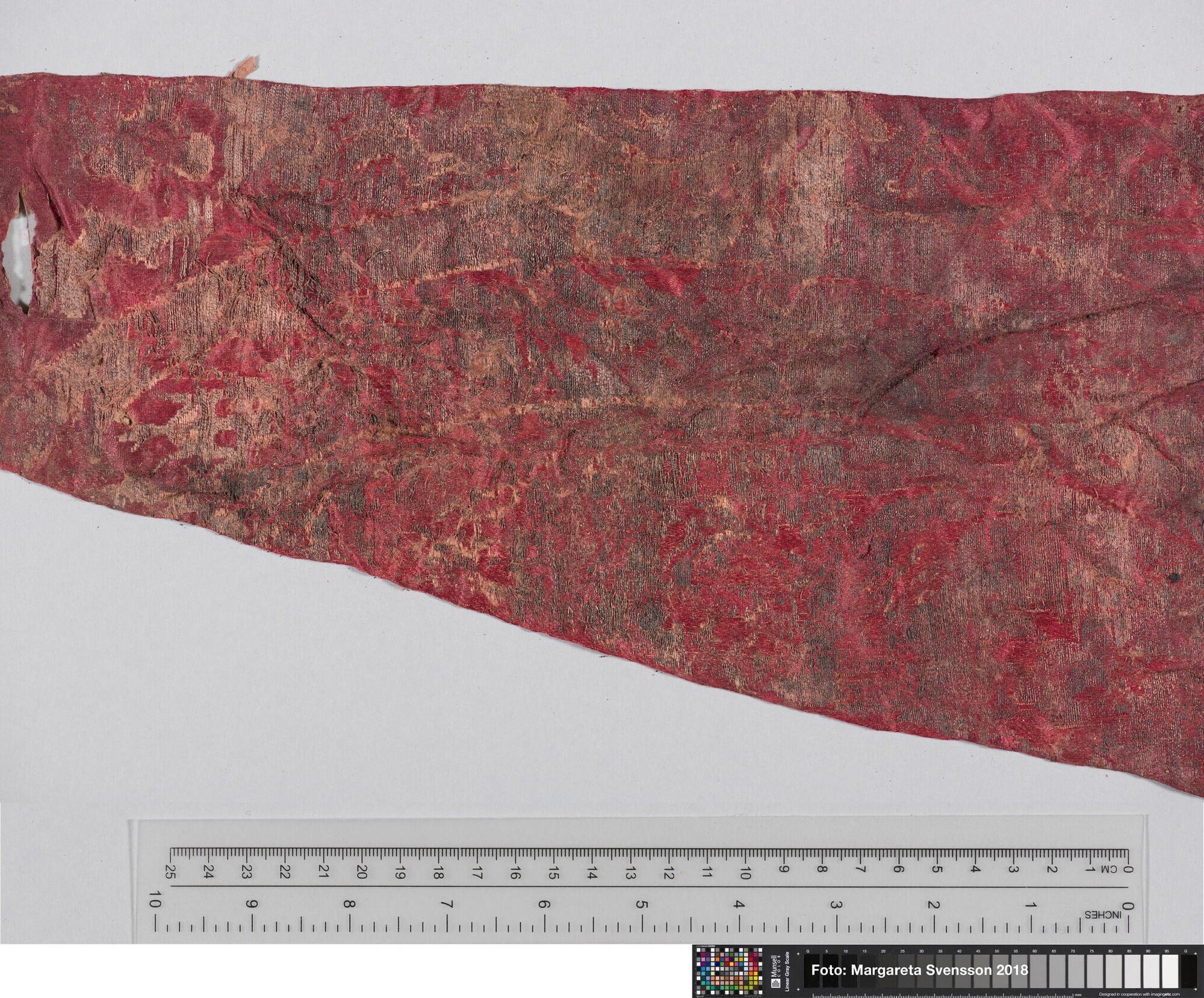 Basisweefsel van satijngeweven zijde. Brokaat weefsel met ingeweven patronen van metaaldraad; alle vier de randen hebben zomen/naden; fragment heeft specifieke vorm, mogelijk onderdeel van een kostuum