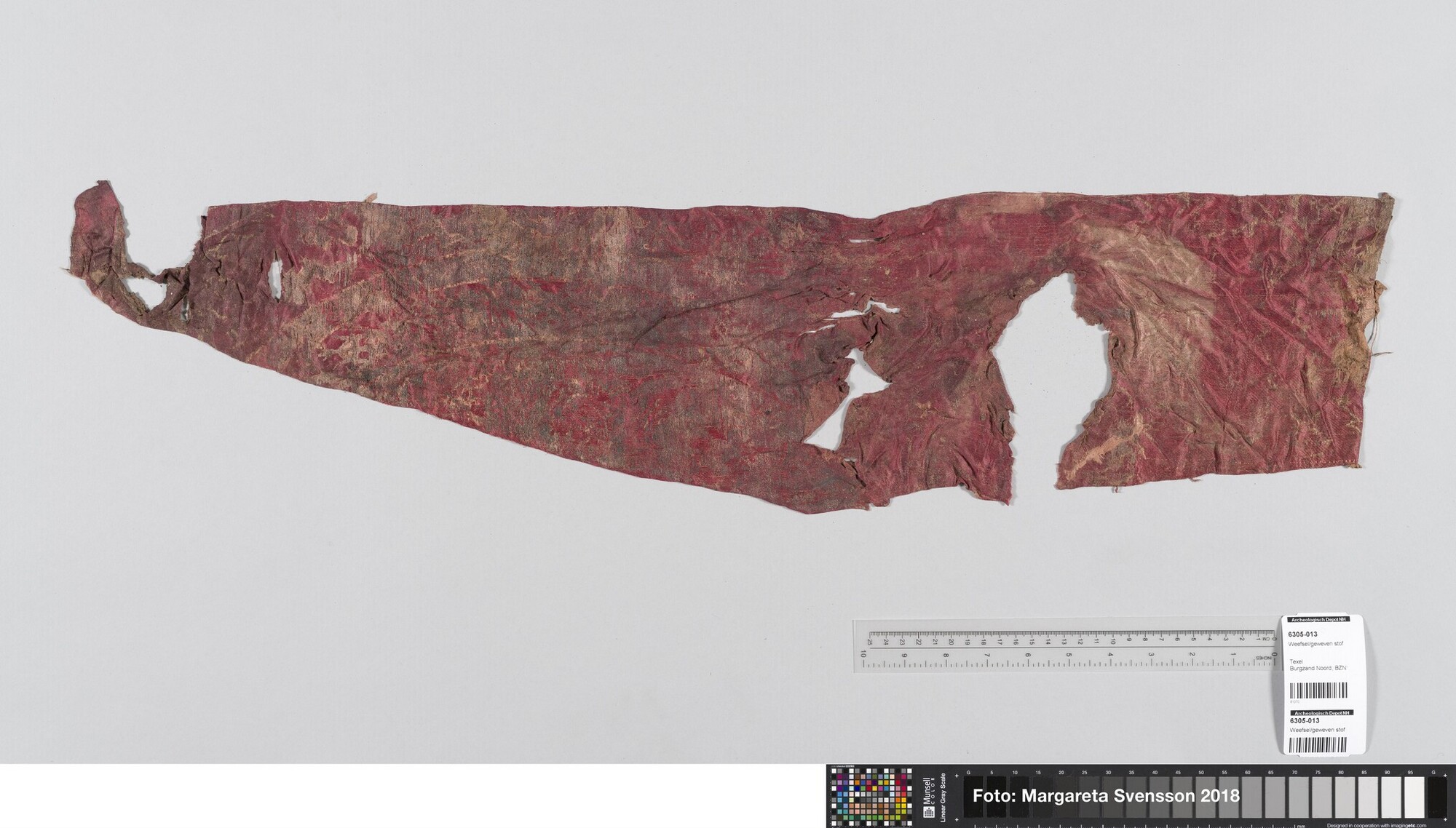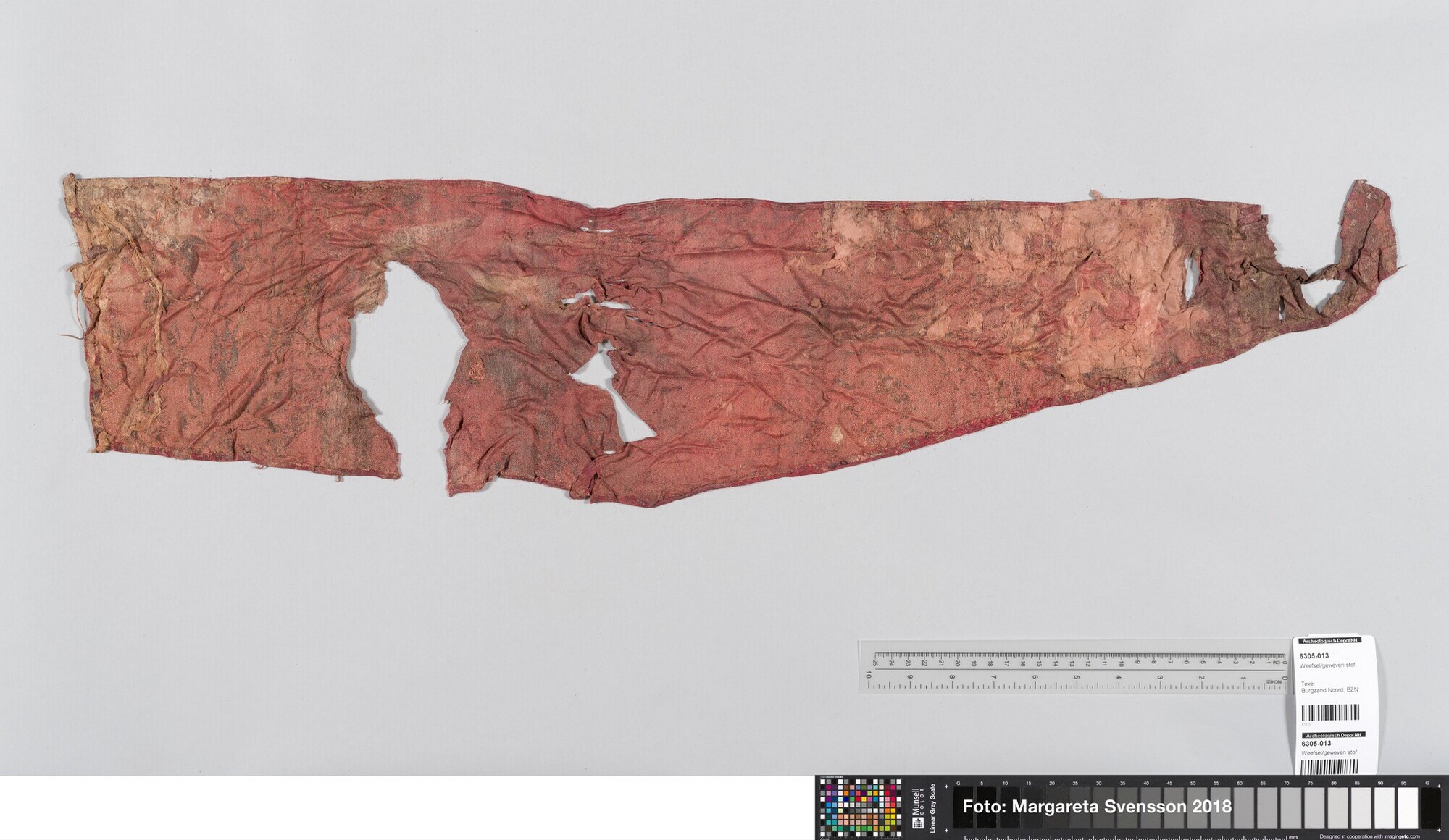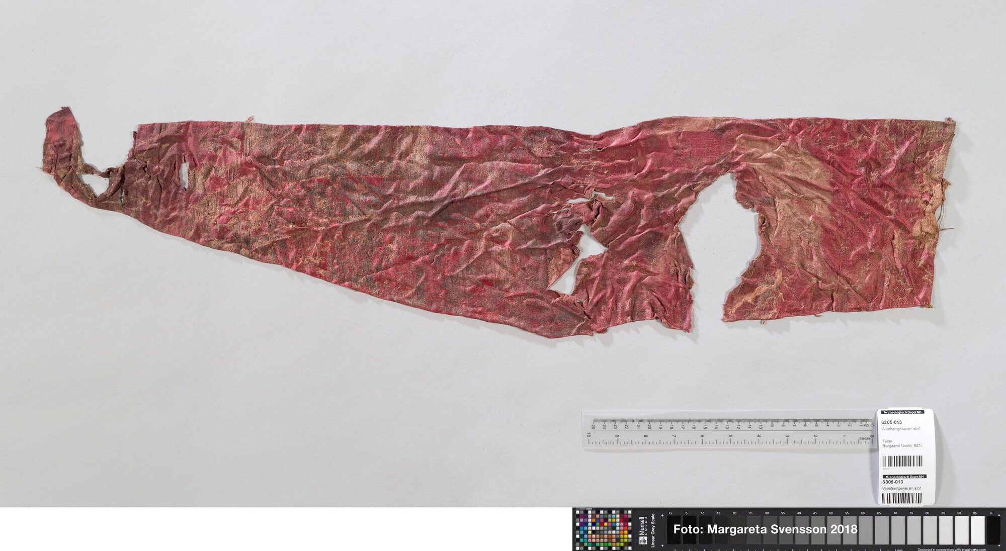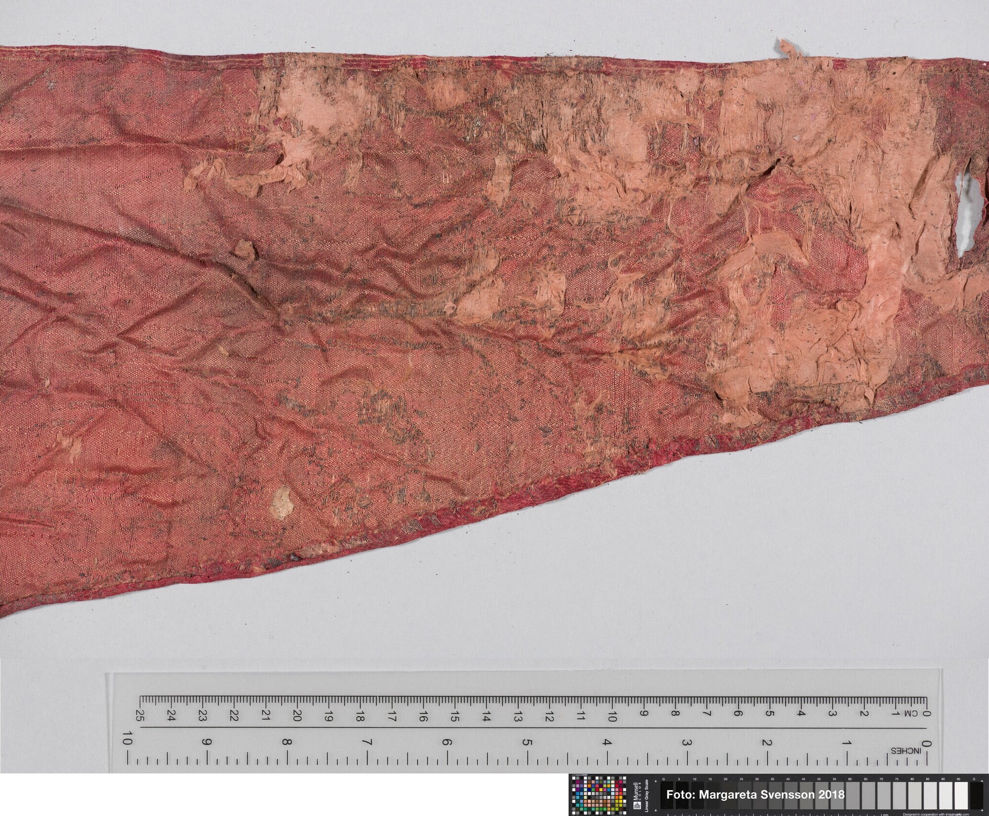 Basisweefsel van satijngeweven zijde. Brokaat weefsel met ingeweven patronen van metaaldraad; alle vier de randen hebben zomen/naden; fragment heeft specifieke vorm, mogelijk onderdeel van een kostuum