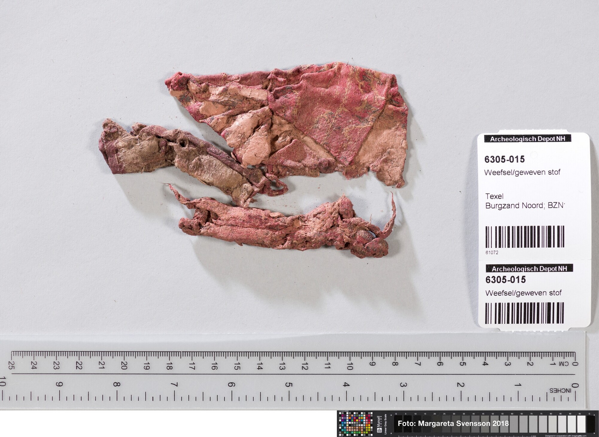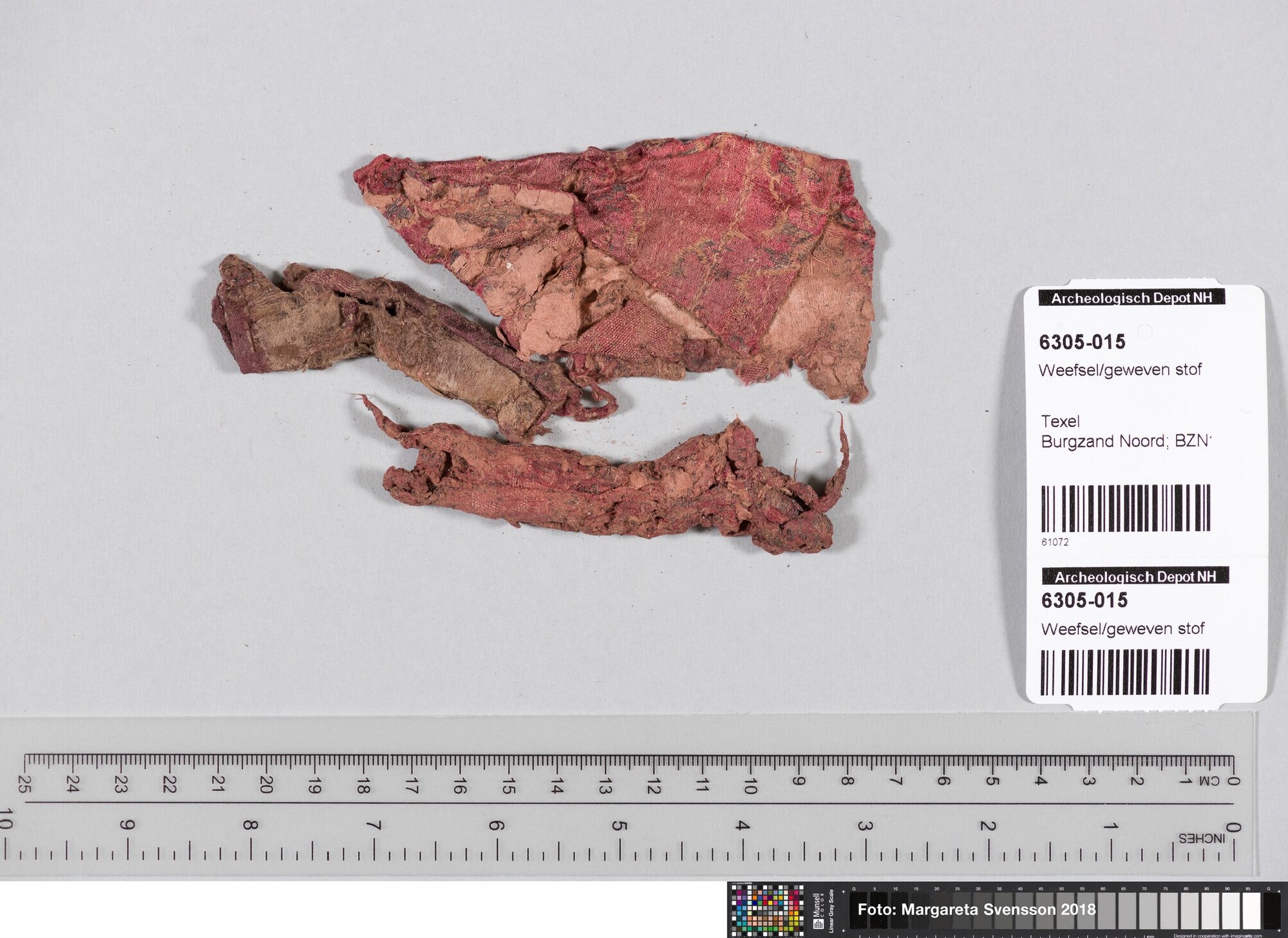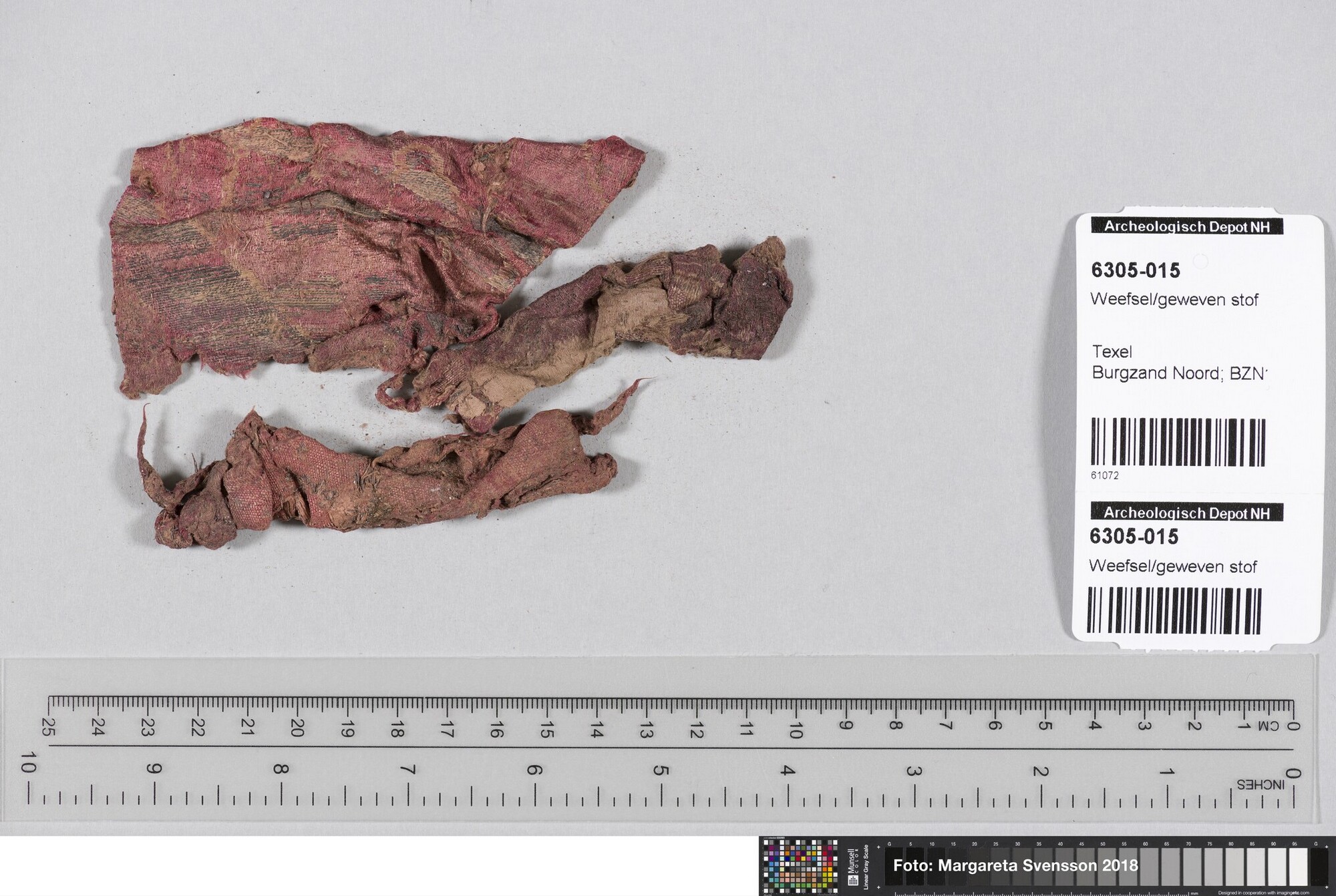 Basisweefsel van satijngeweven zijde. Brokaat weefsel met ingeweven patronen van metaaldraad; een deel van het fragment is dubbelgevouwen, maar is verkleefd