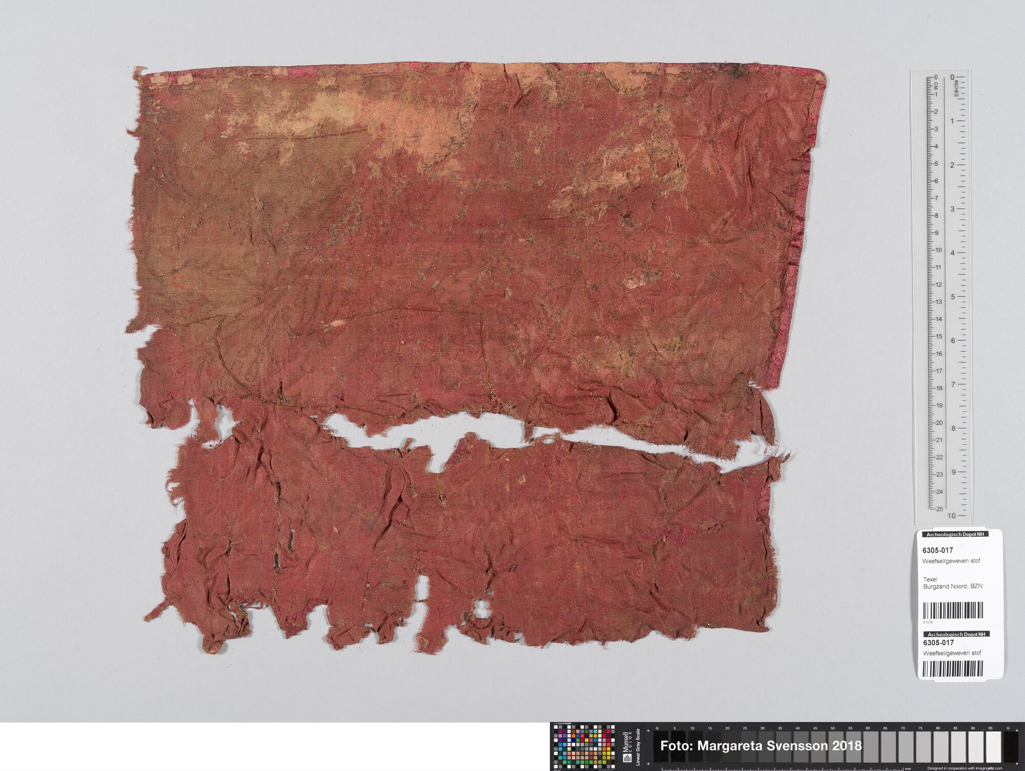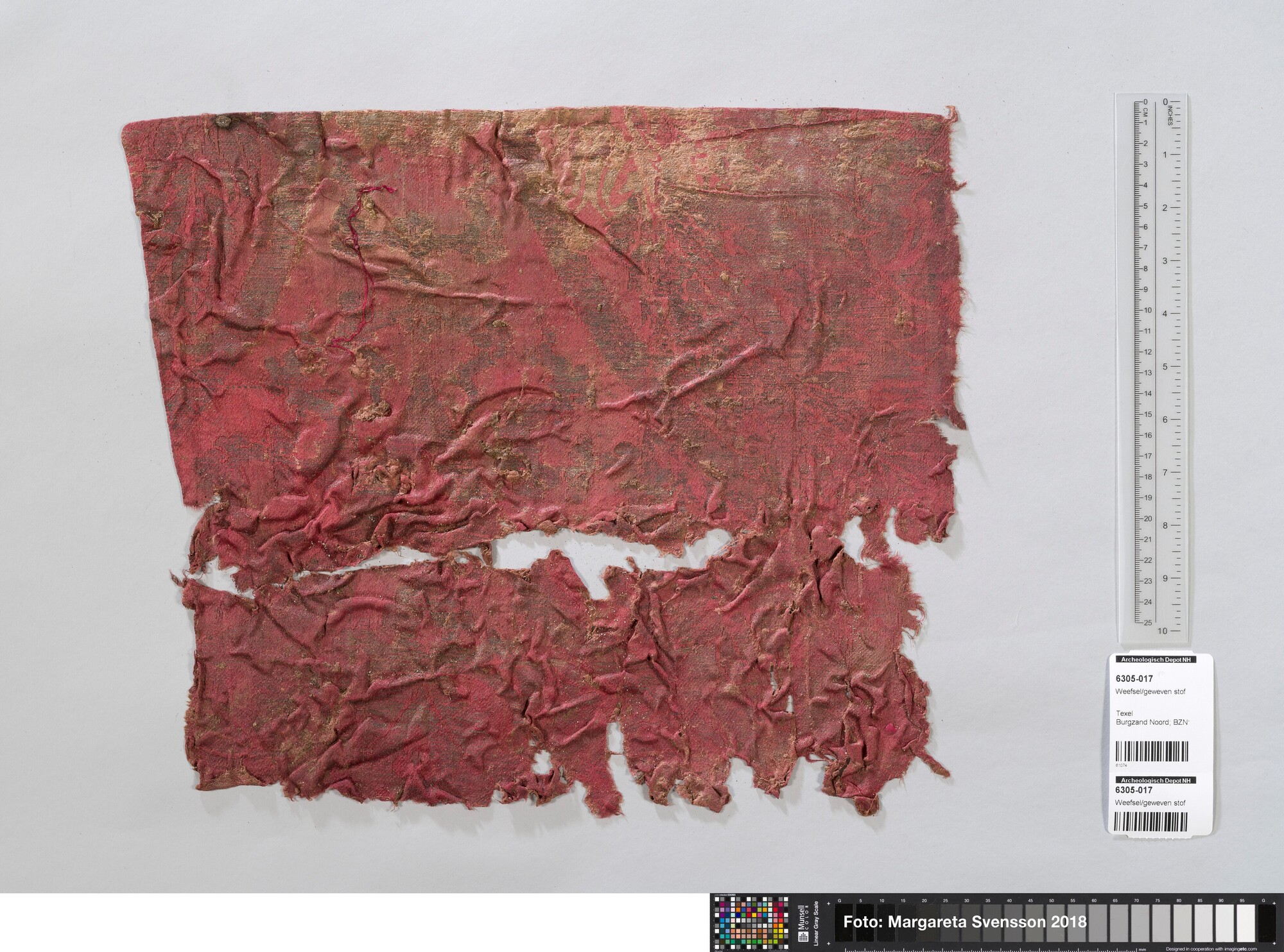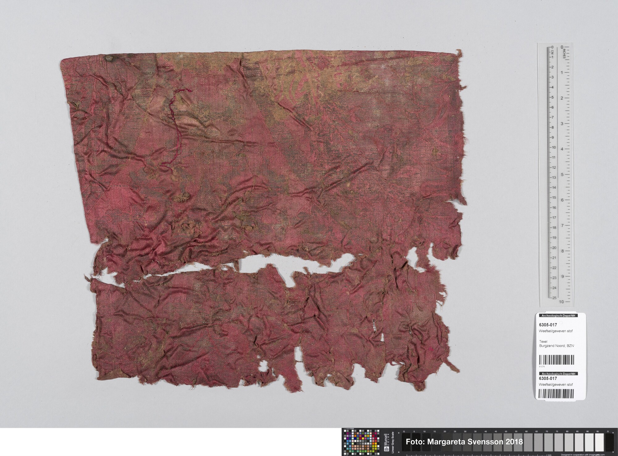 Basisweefsel van satijngeweven zijde. Brokaat weefsel met ingeweven patronen van metaaldraad; vermoedelijk floraal motief; minimaal twee afgewerkte randen/naden; mogelijk deel van een kostuum