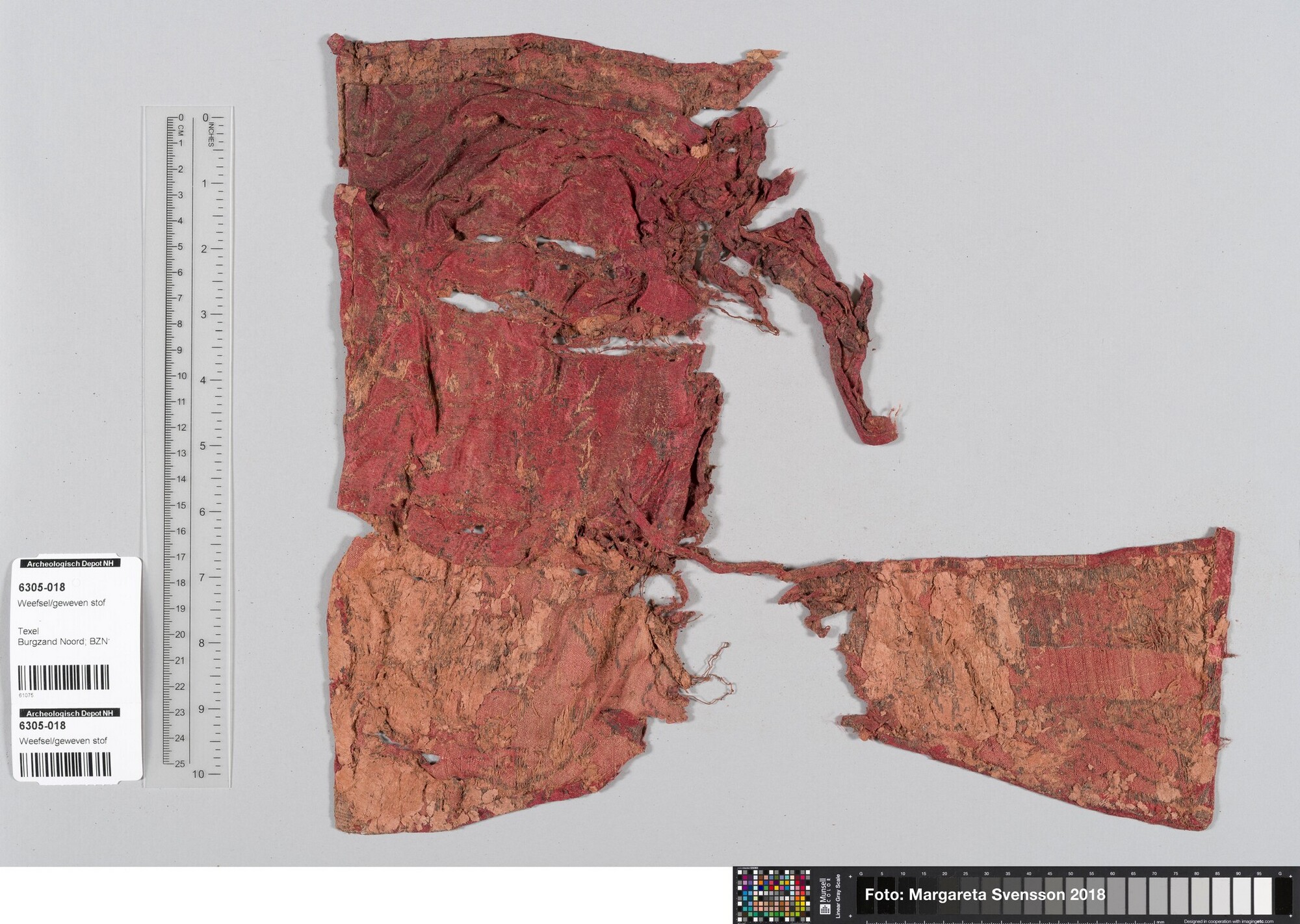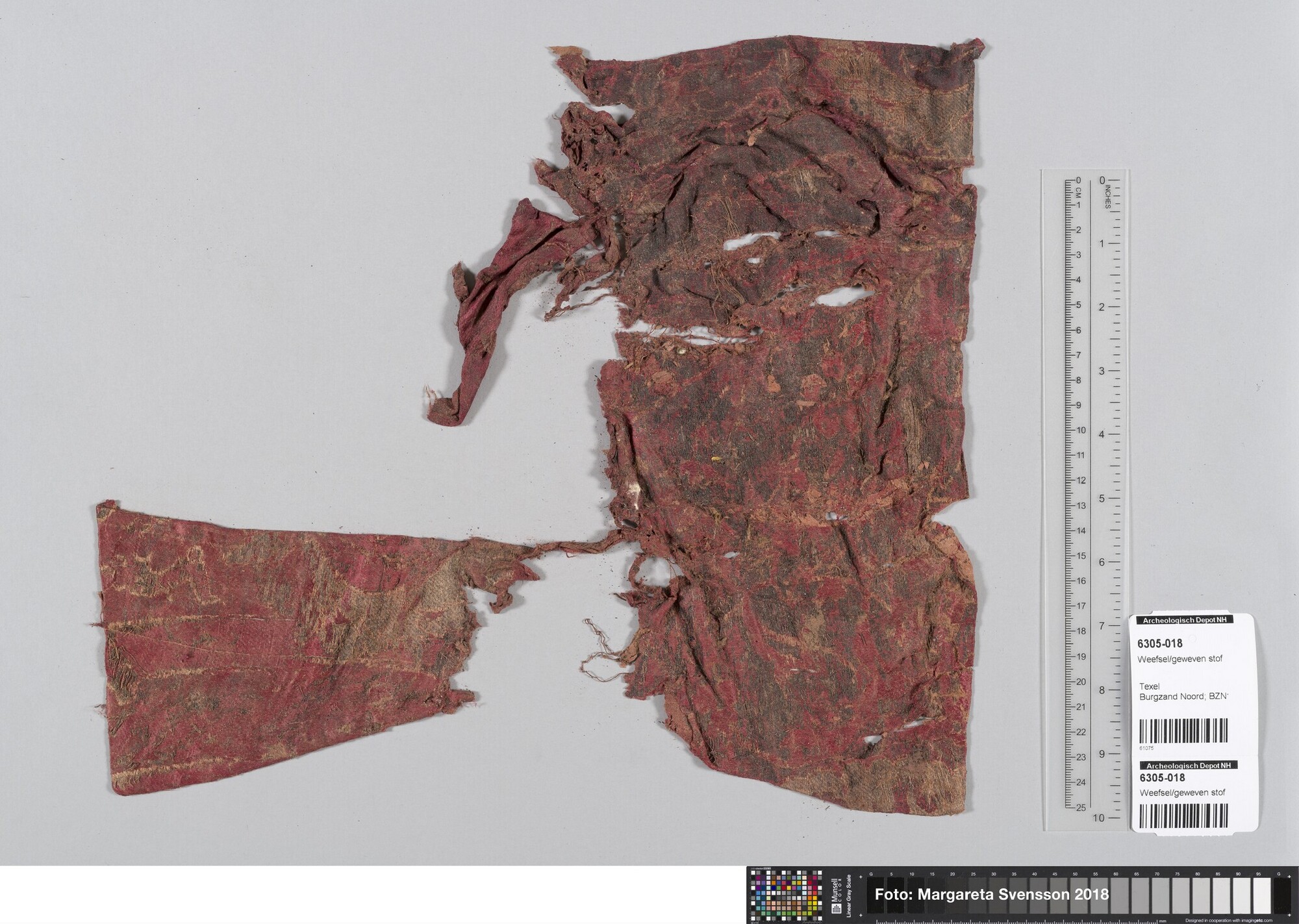 Basisweefsel van satijngeweven zijde, brokaat weefsel met ingeweven patronen van metaaldraad; bestaat uit twee lagen; vermoedelijk florale motieven; bijna alle randen zijn afgewerkt/hebben een naad