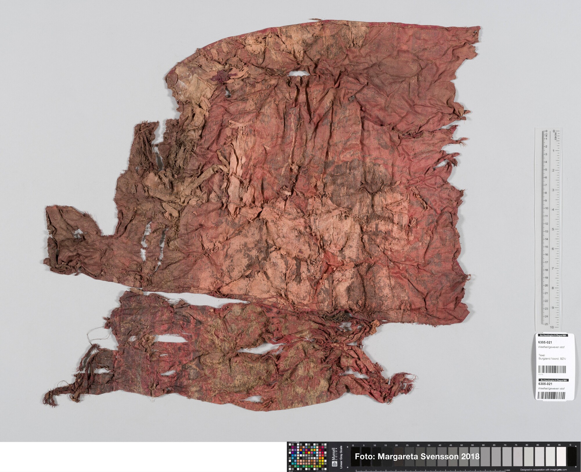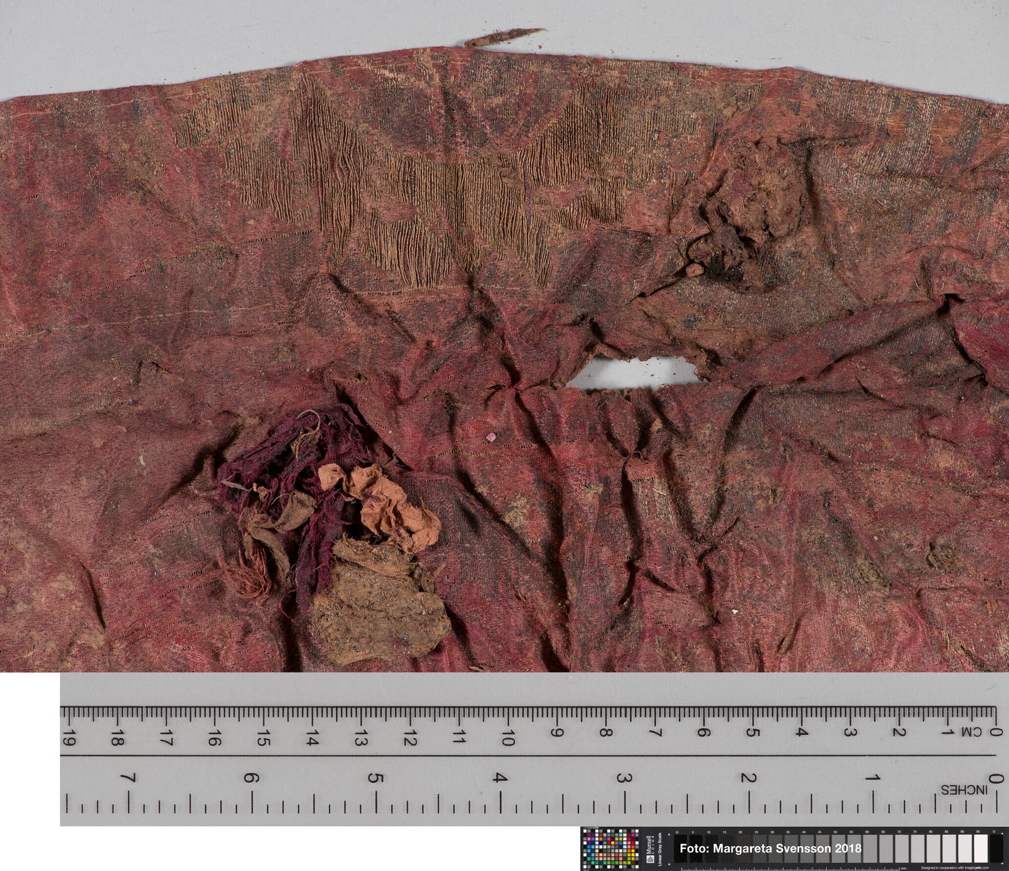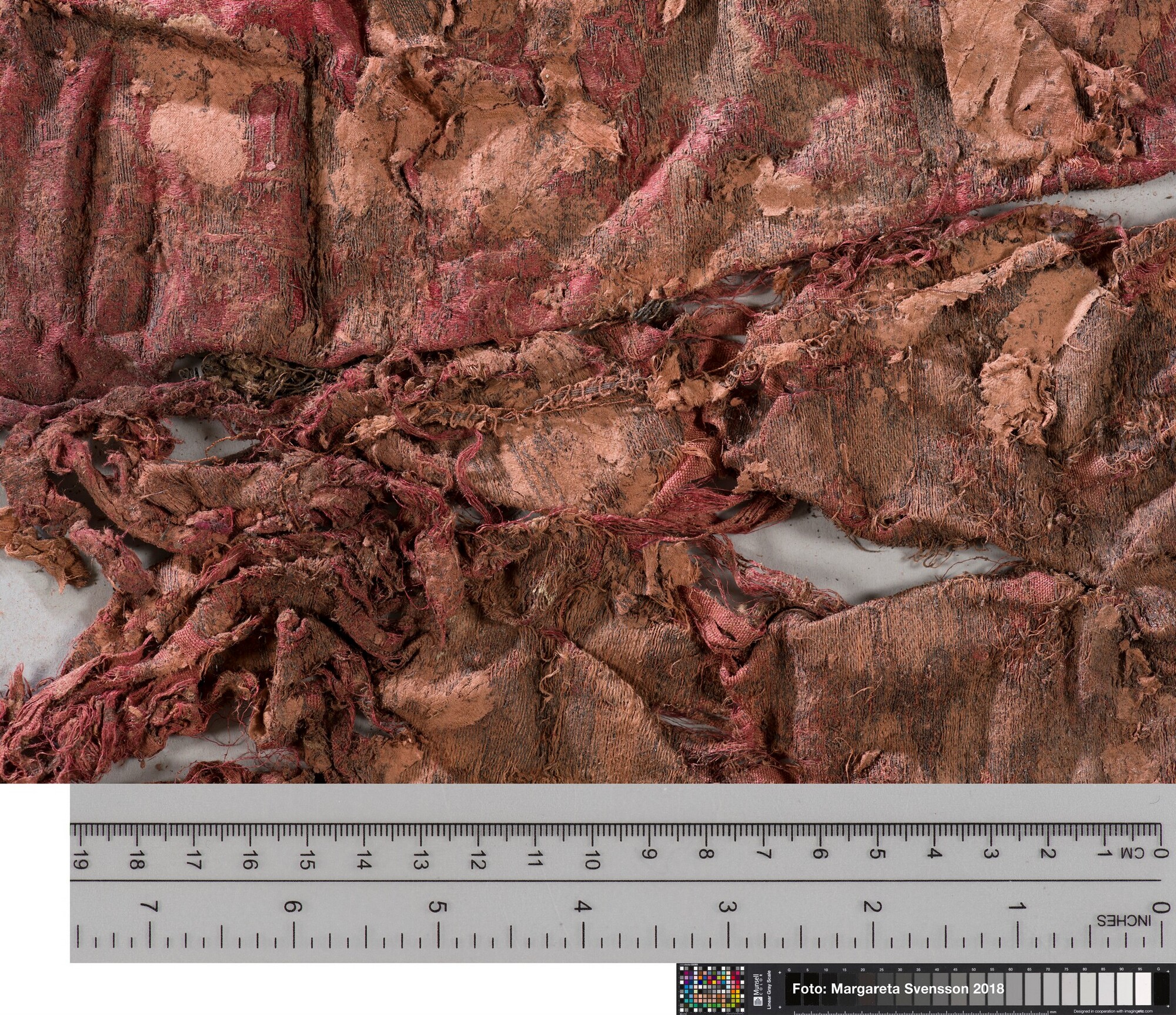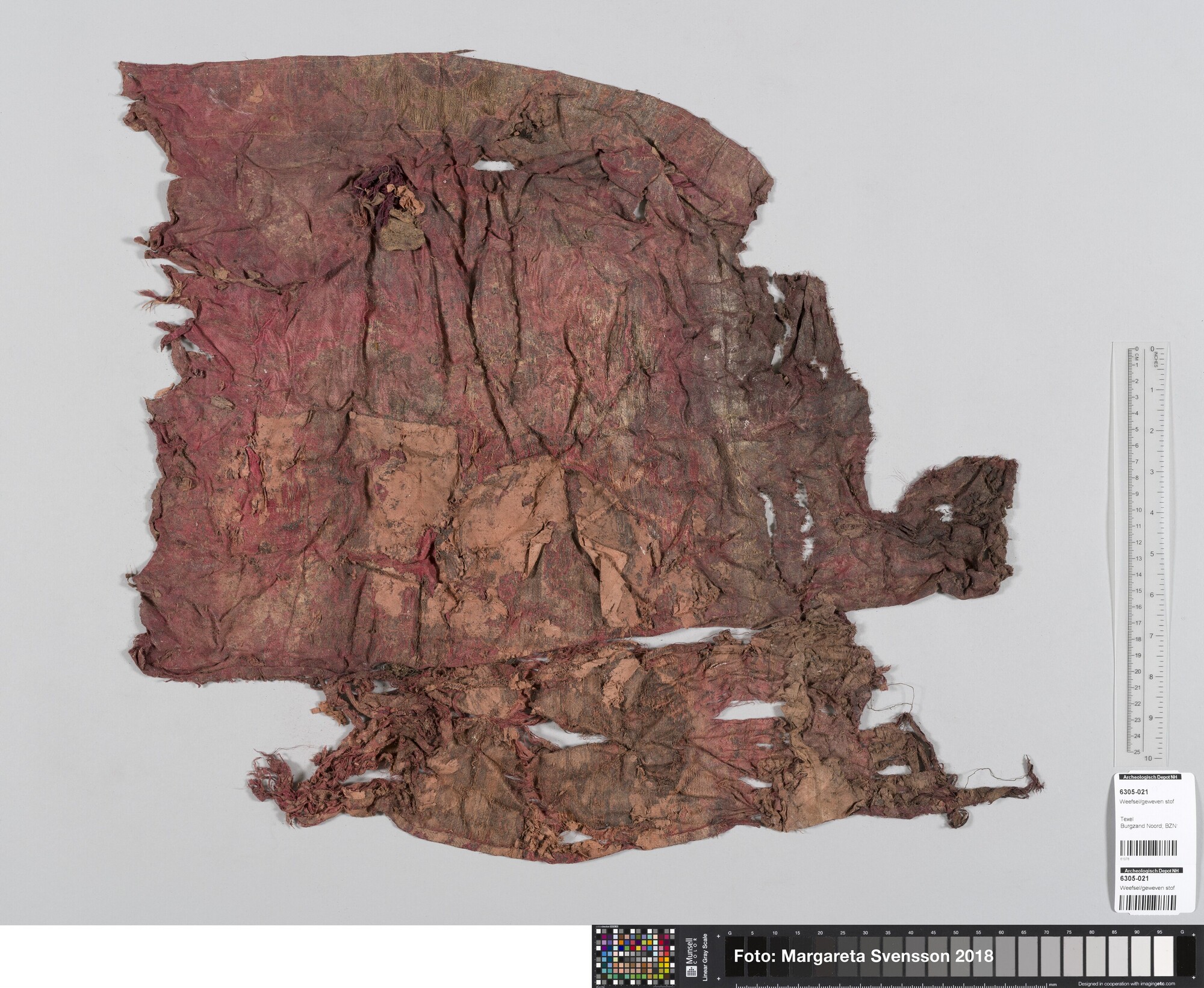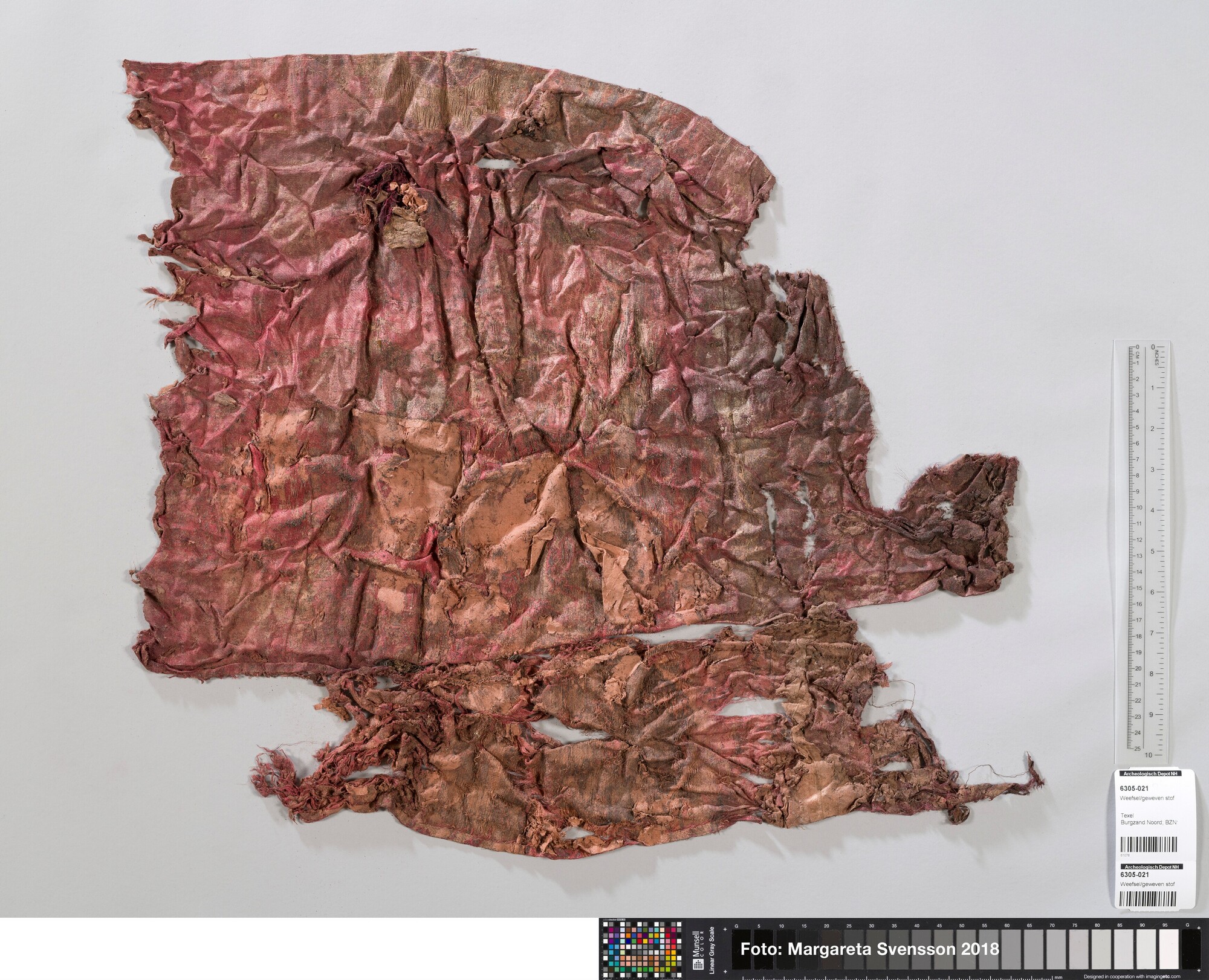 Basisweefsel van satijngeweven zijde, brokaat weefsel met ingeweven patronen van metaaldraad; naden/zomen zichtbaar aan twee zijden; voering met mogelijk een sierband of naad; mogelijk onderdeel van een kostuum