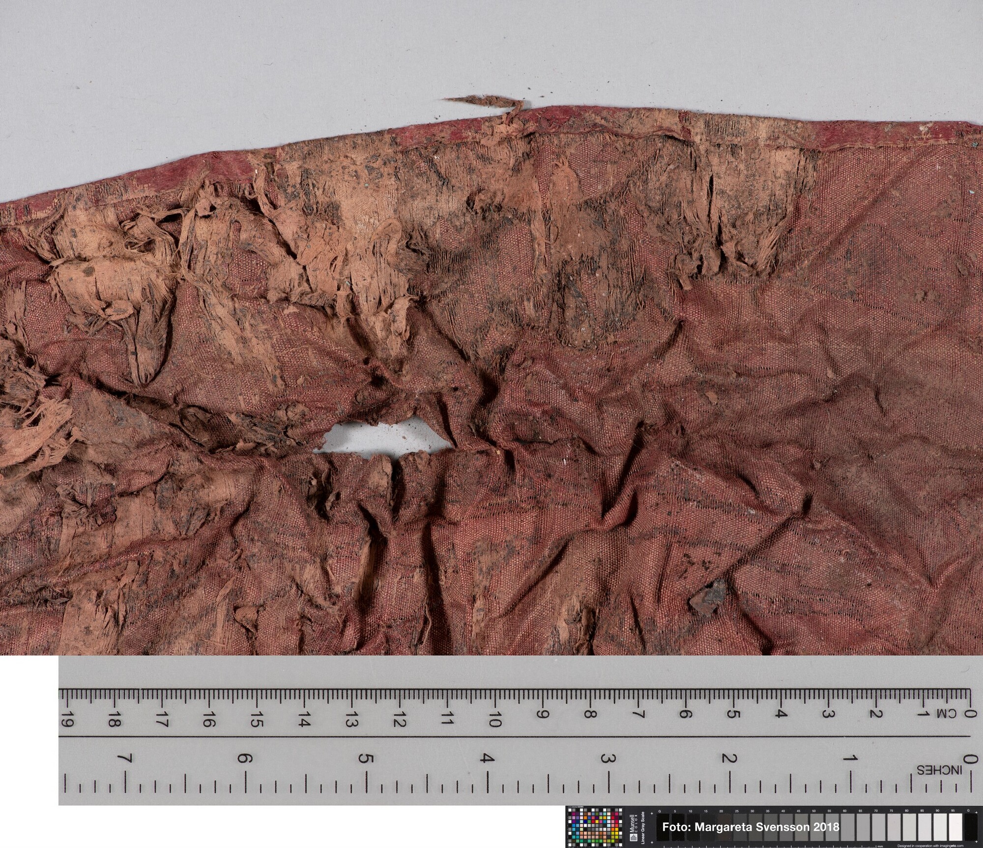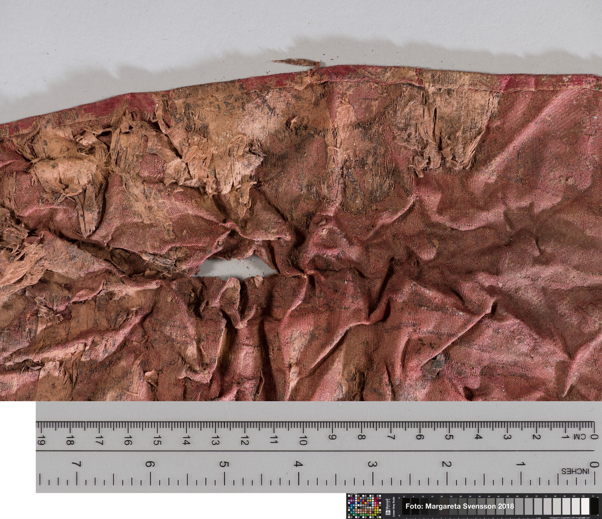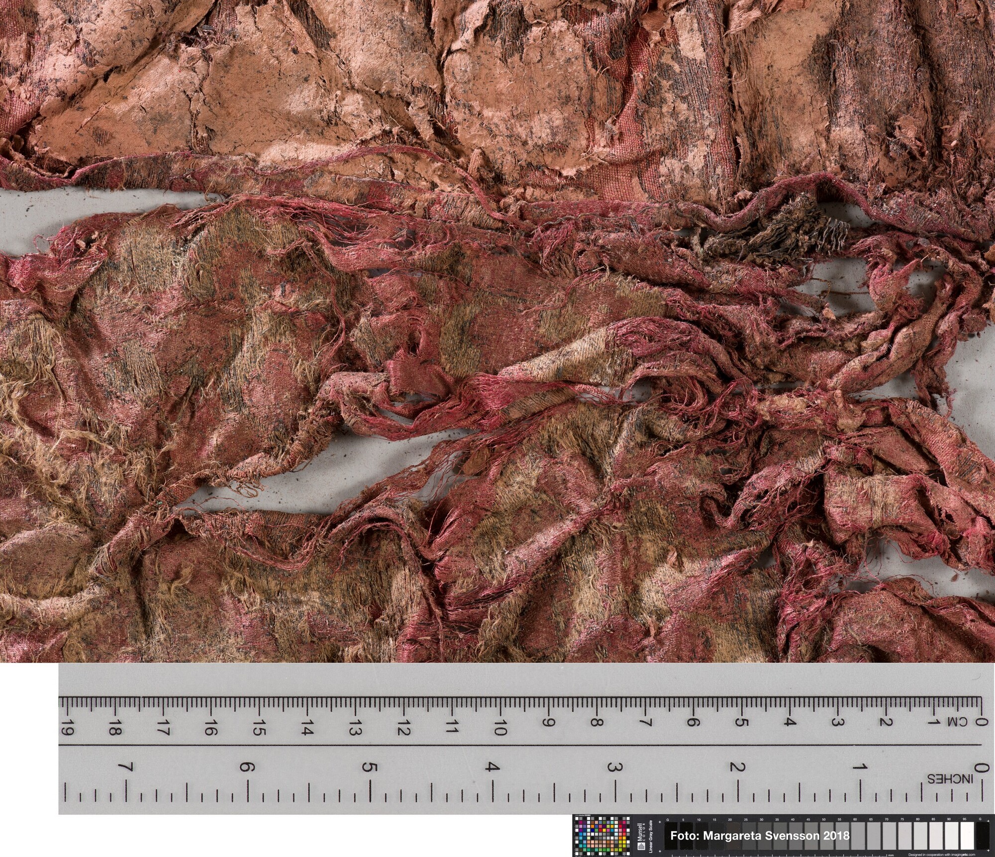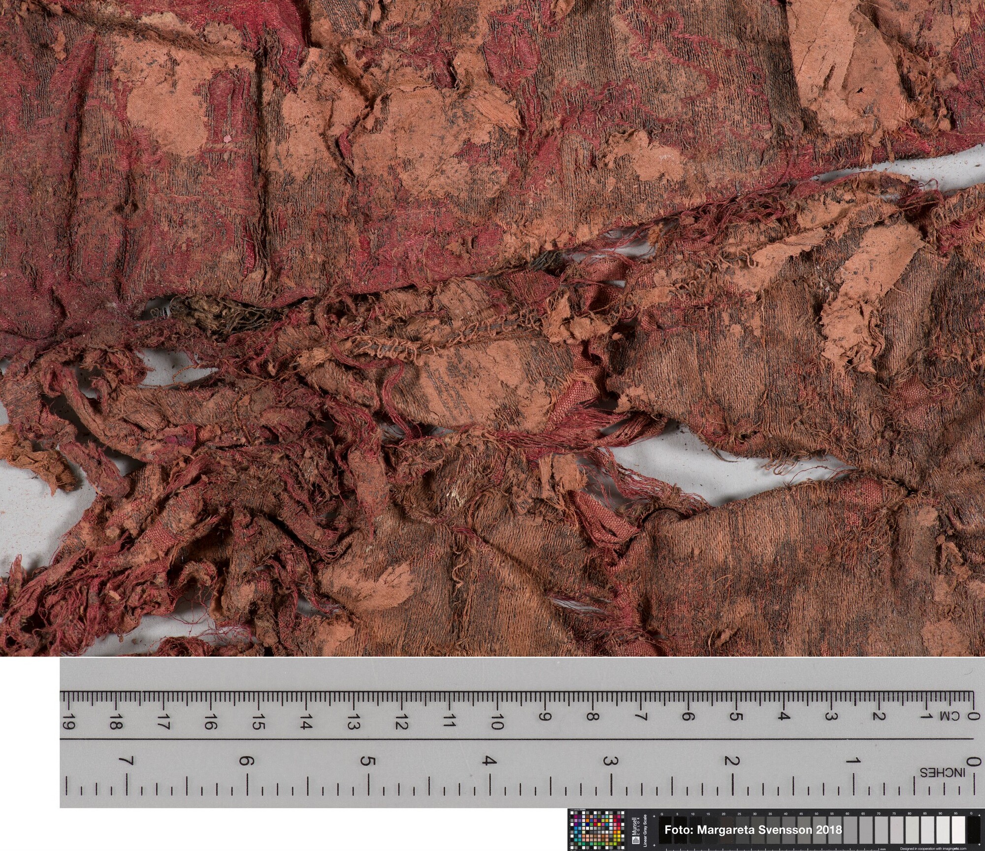 Basisweefsel van satijngeweven zijde, brokaat weefsel met ingeweven patronen van metaaldraad; naden/zomen zichtbaar aan twee zijden; voering met mogelijk een sierband of naad; mogelijk onderdeel van een kostuum