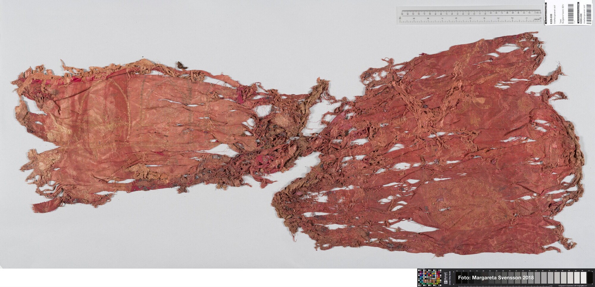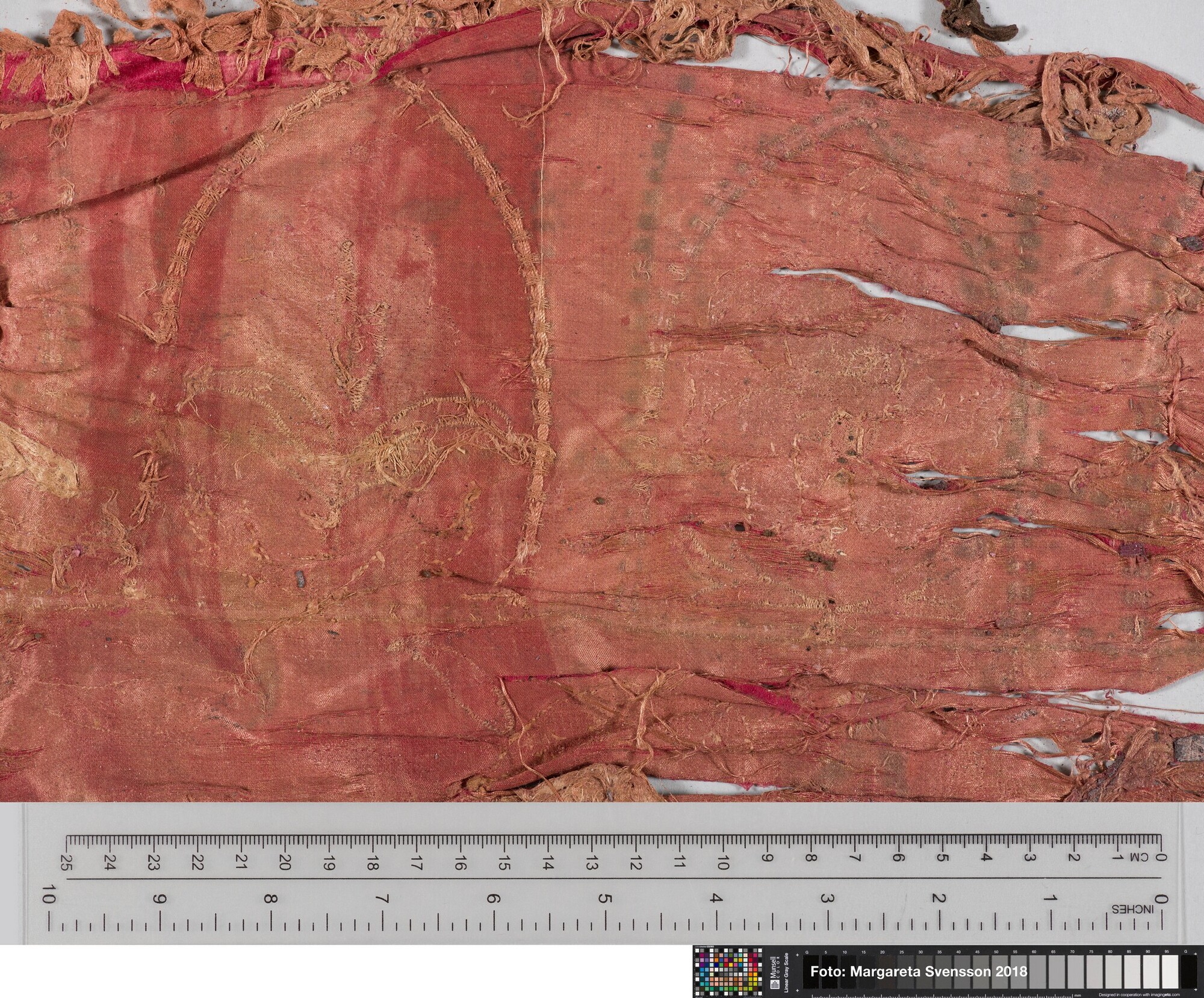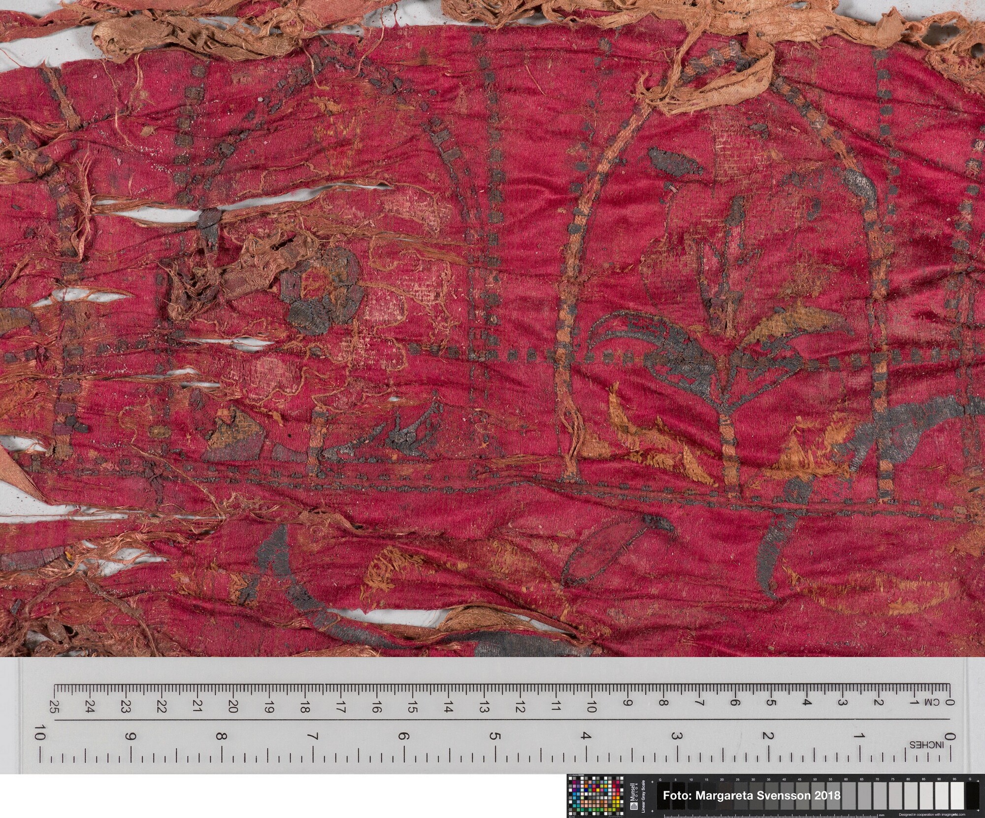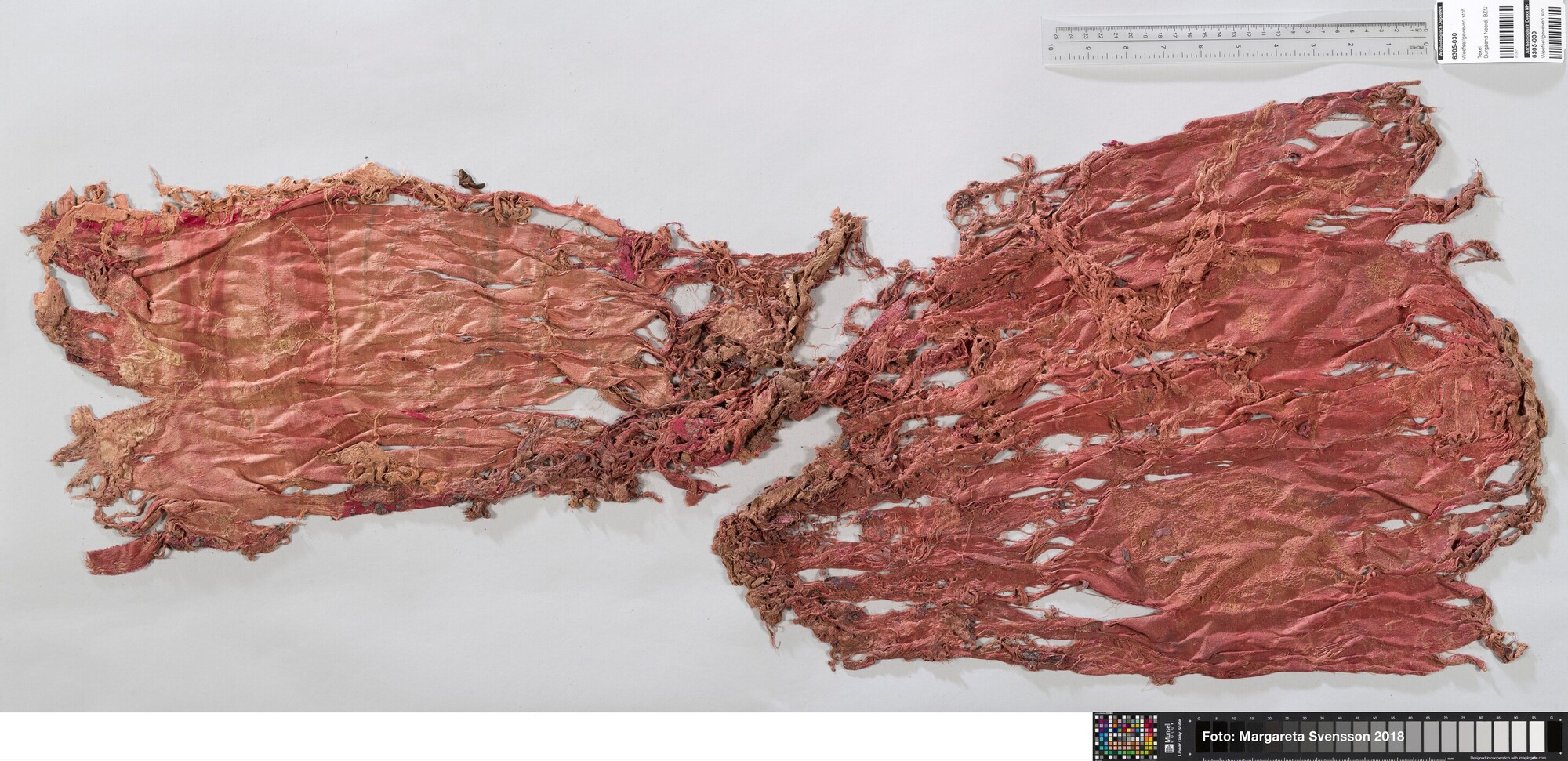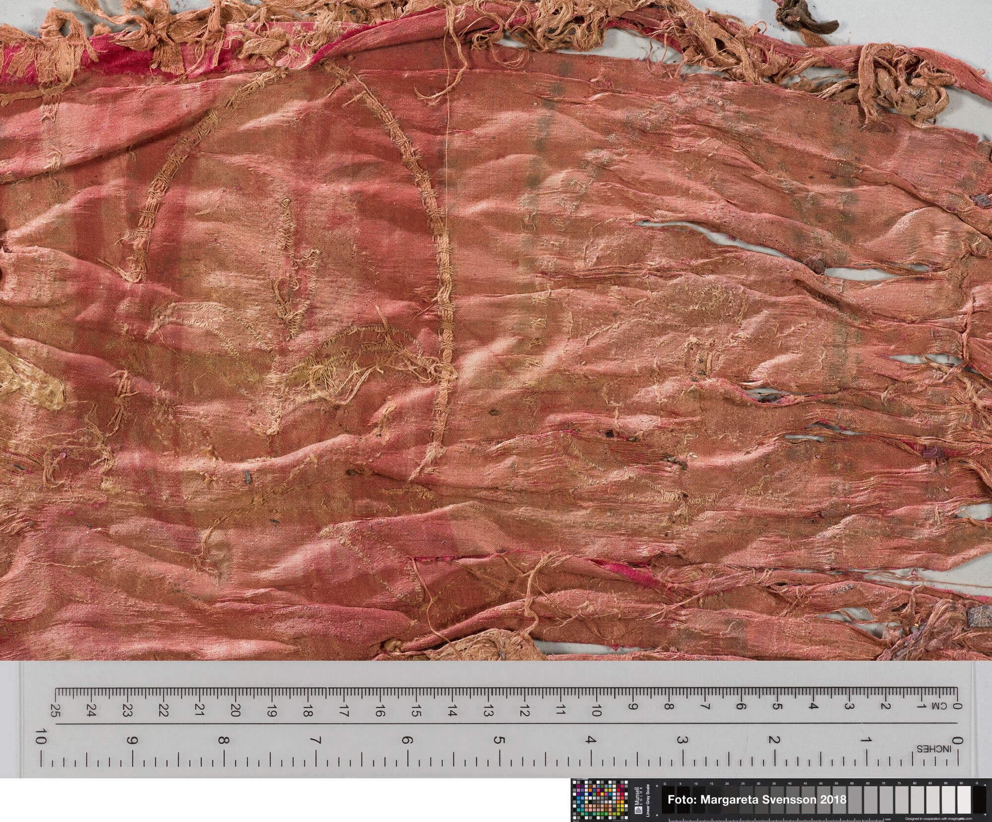Rechthoekig basisweefsel van satijngeweven zijde, versierd met dikke metaalborduursels en opgenaaide contourdraden; florale en moerab motieven; voering