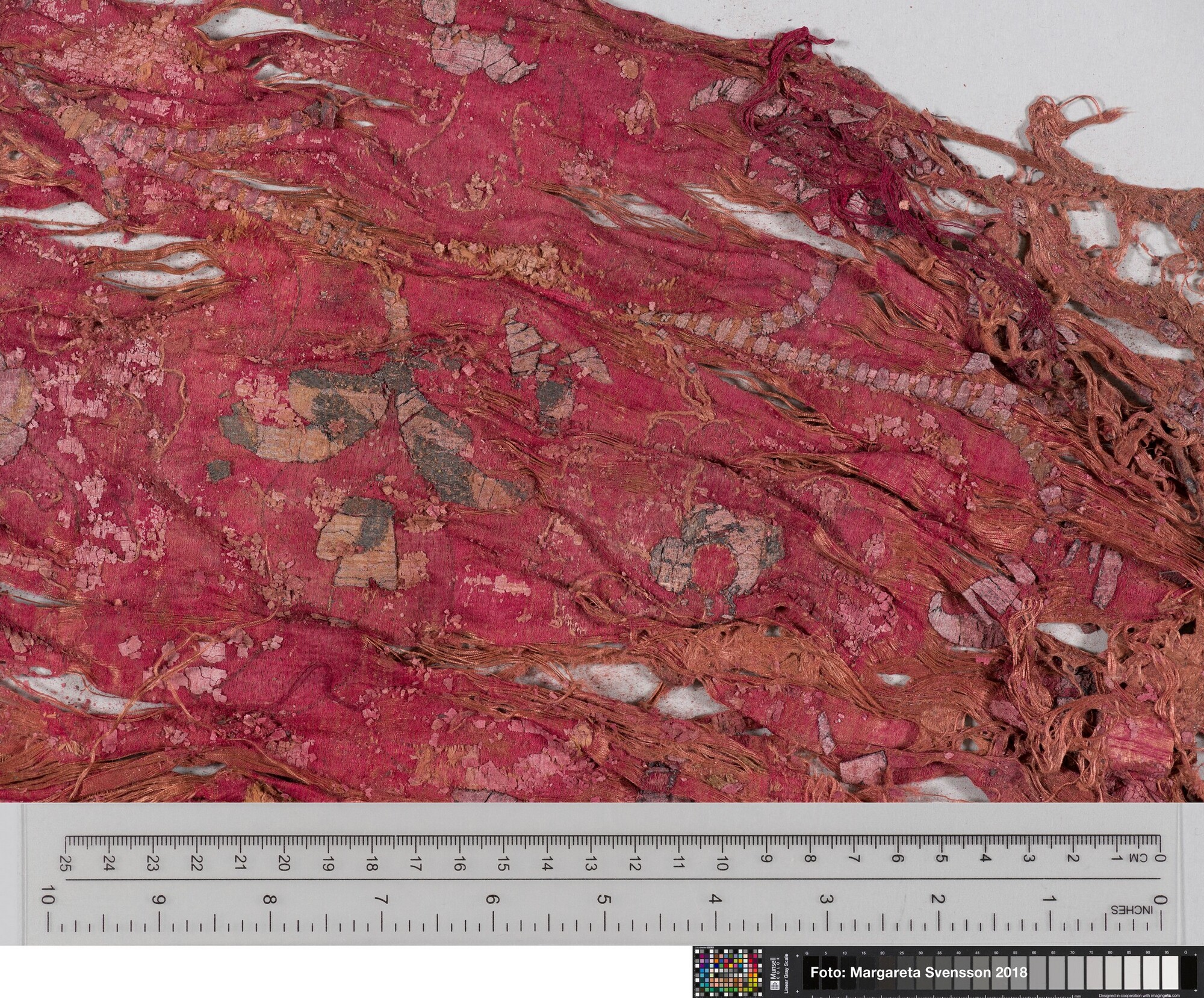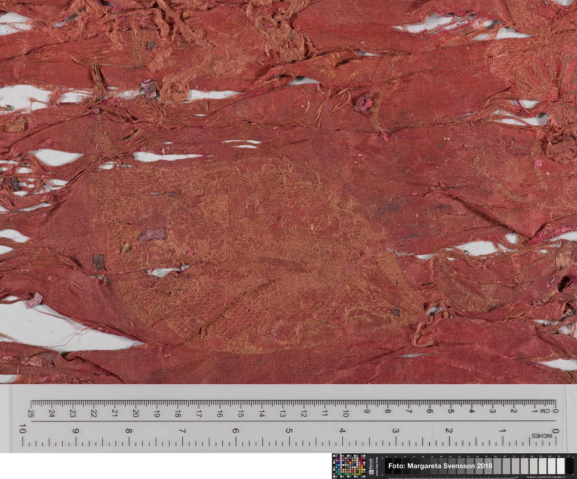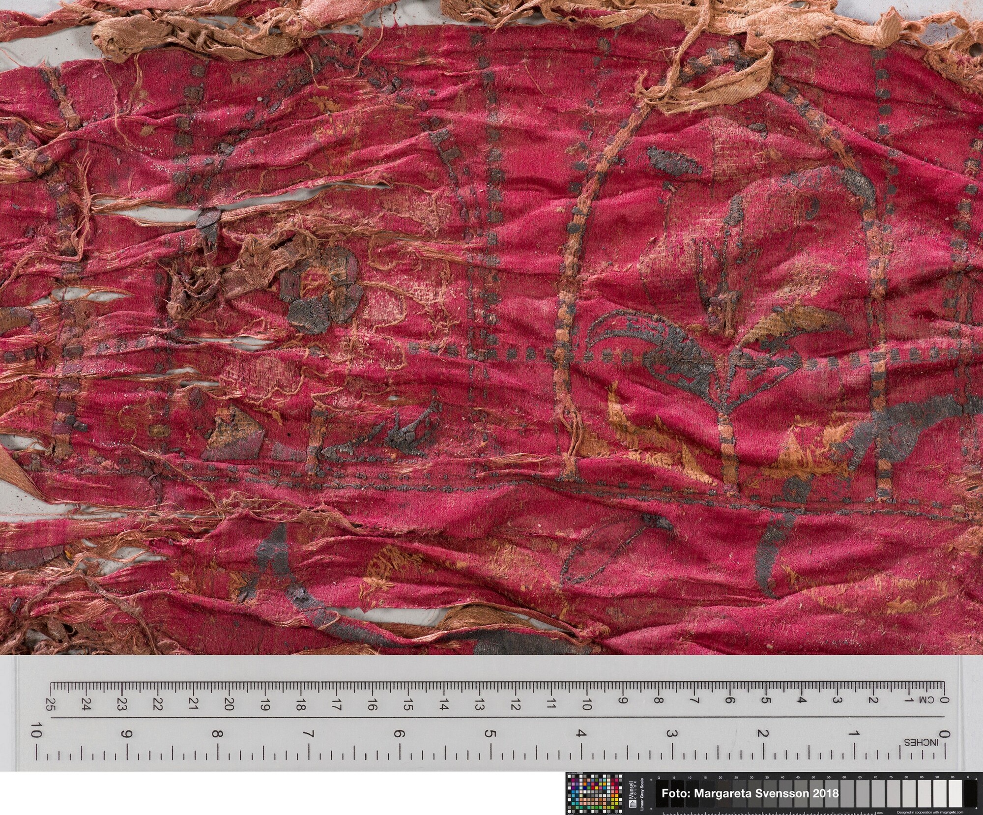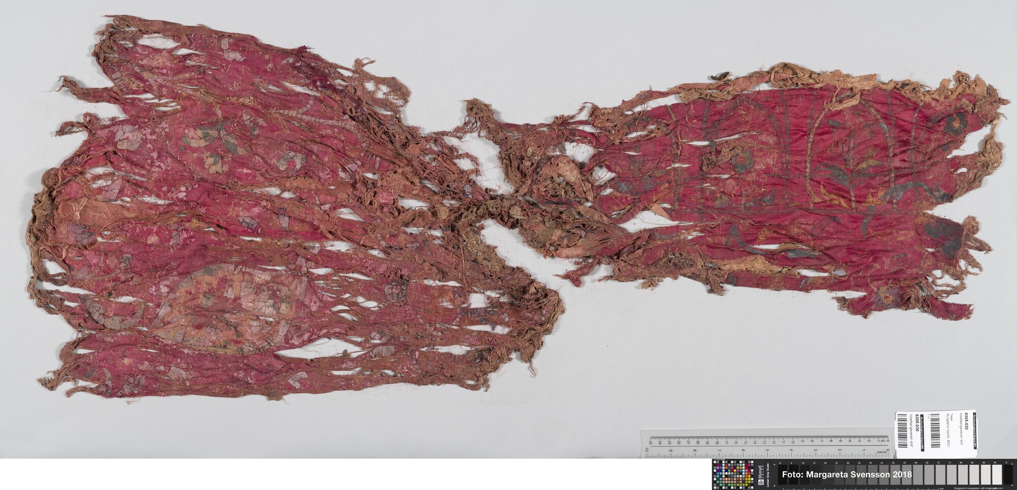 Rechthoekig basisweefsel van satijngeweven zijde, versierd met dikke metaalborduursels en opgenaaide contourdraden; florale en moerab motieven; voering