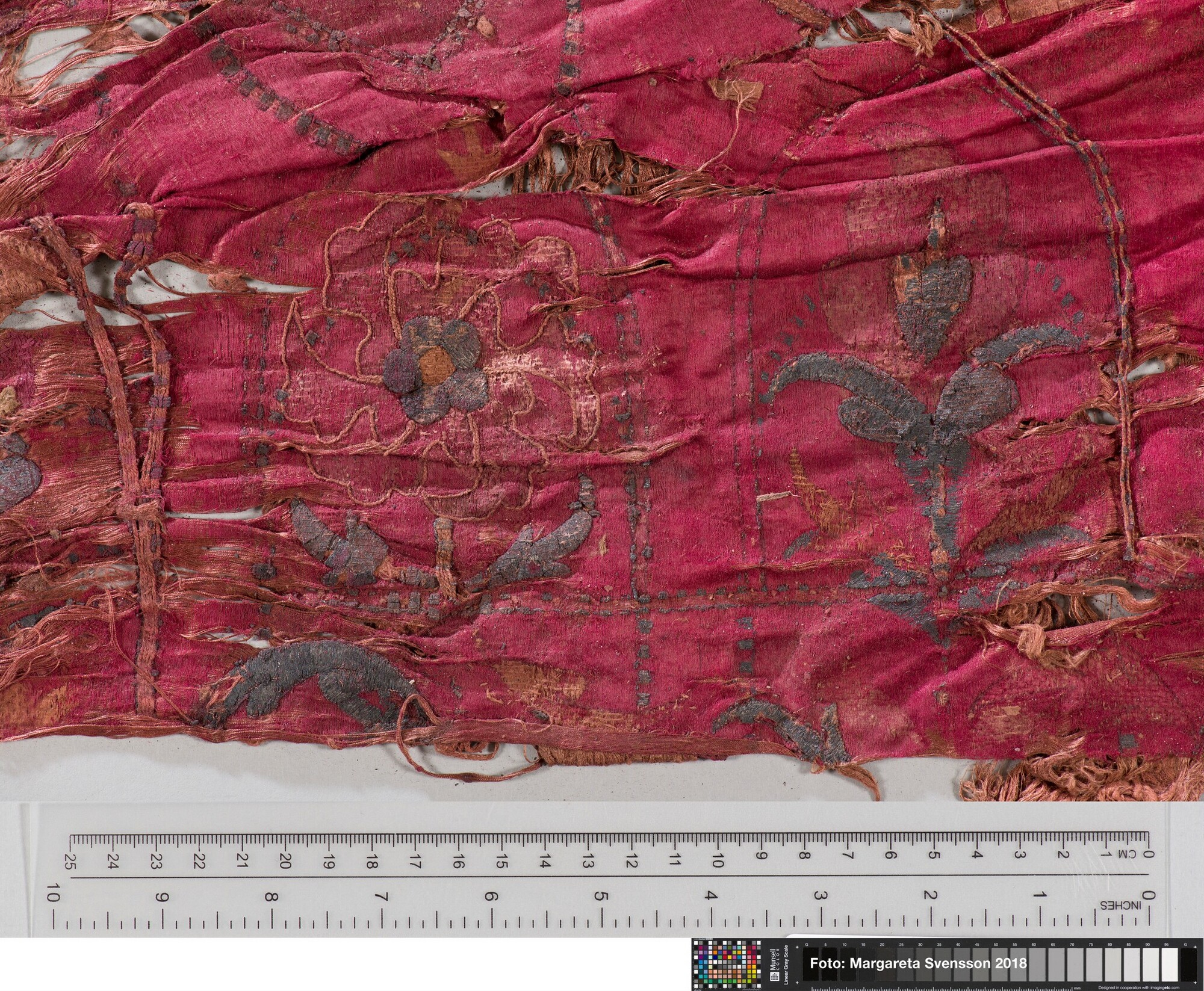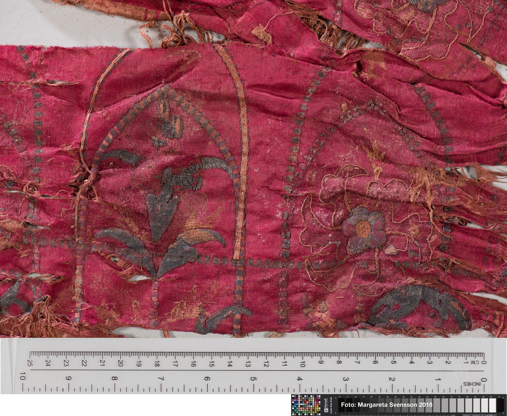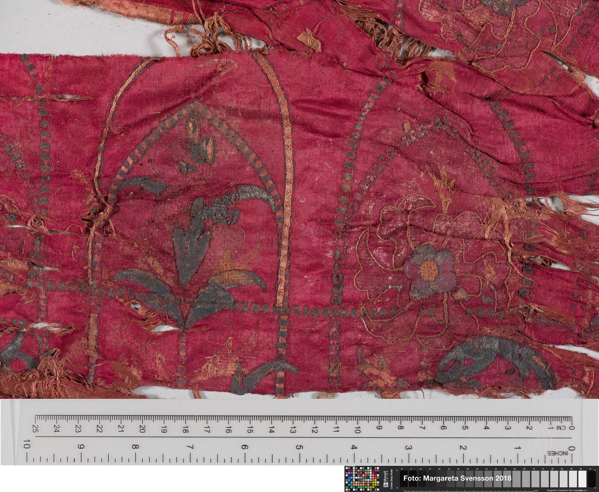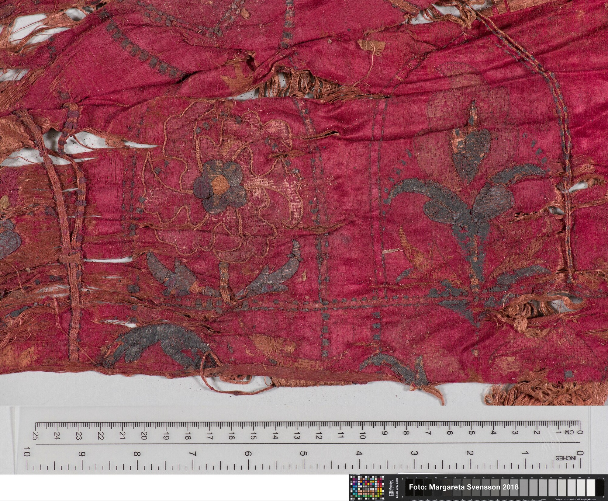Rechthoekig basisweefsel van satijngeweven zijde, versierd met dikke metaalborduursels en opgenaaide contourdraden; florale en moerab motieven; voering