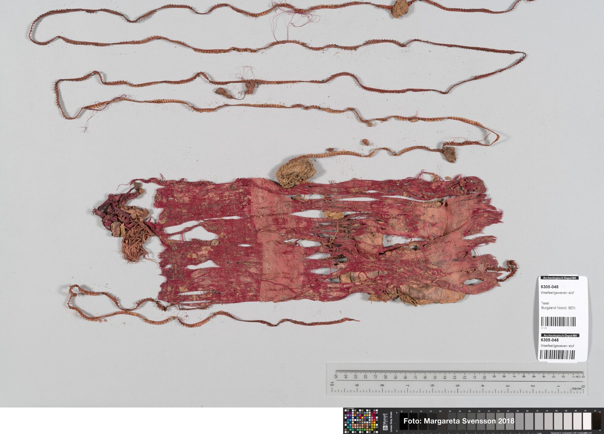 Rechthoekig damast geweven zijde met ingeweven metaaldraad (brokaat), aan de voorzijde satijnweefsel