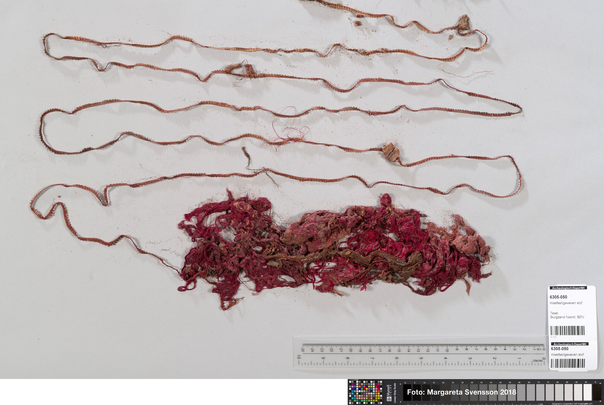 Damast geweven zijde met ingeweven metaaldraad (brokaat), aan de voorzijde satijnweefsel; passement