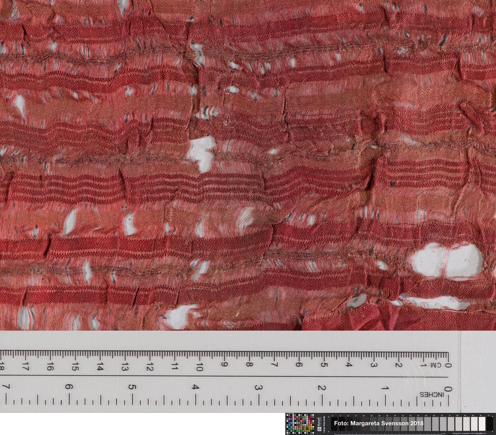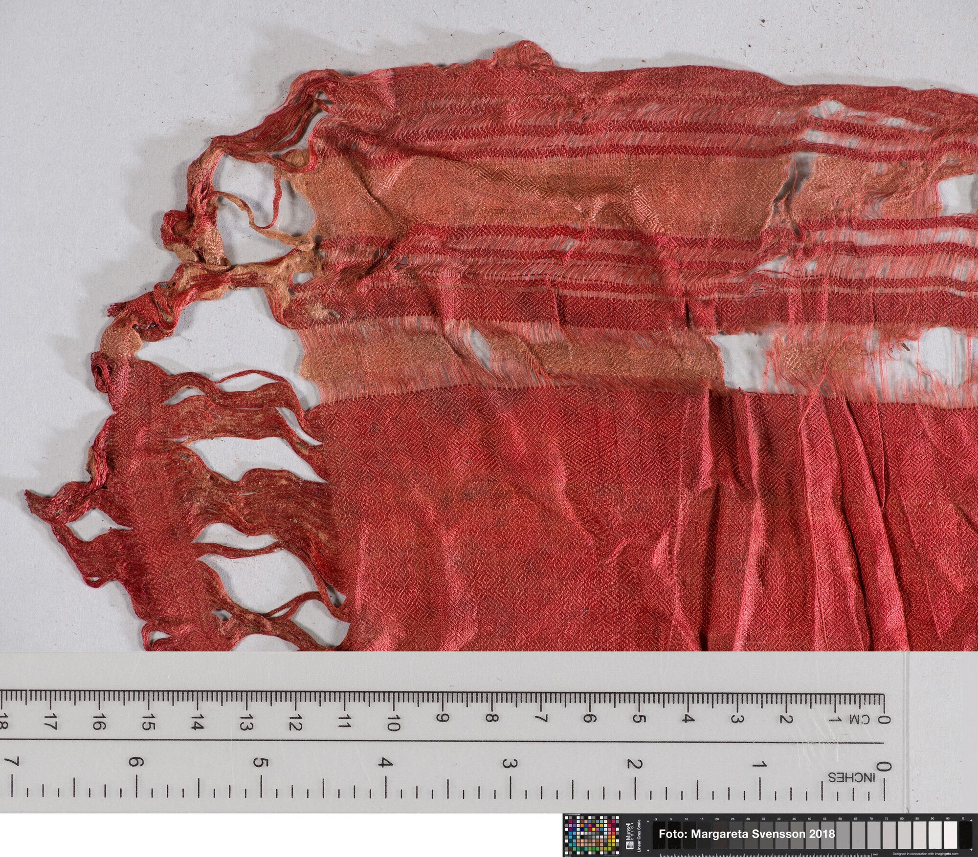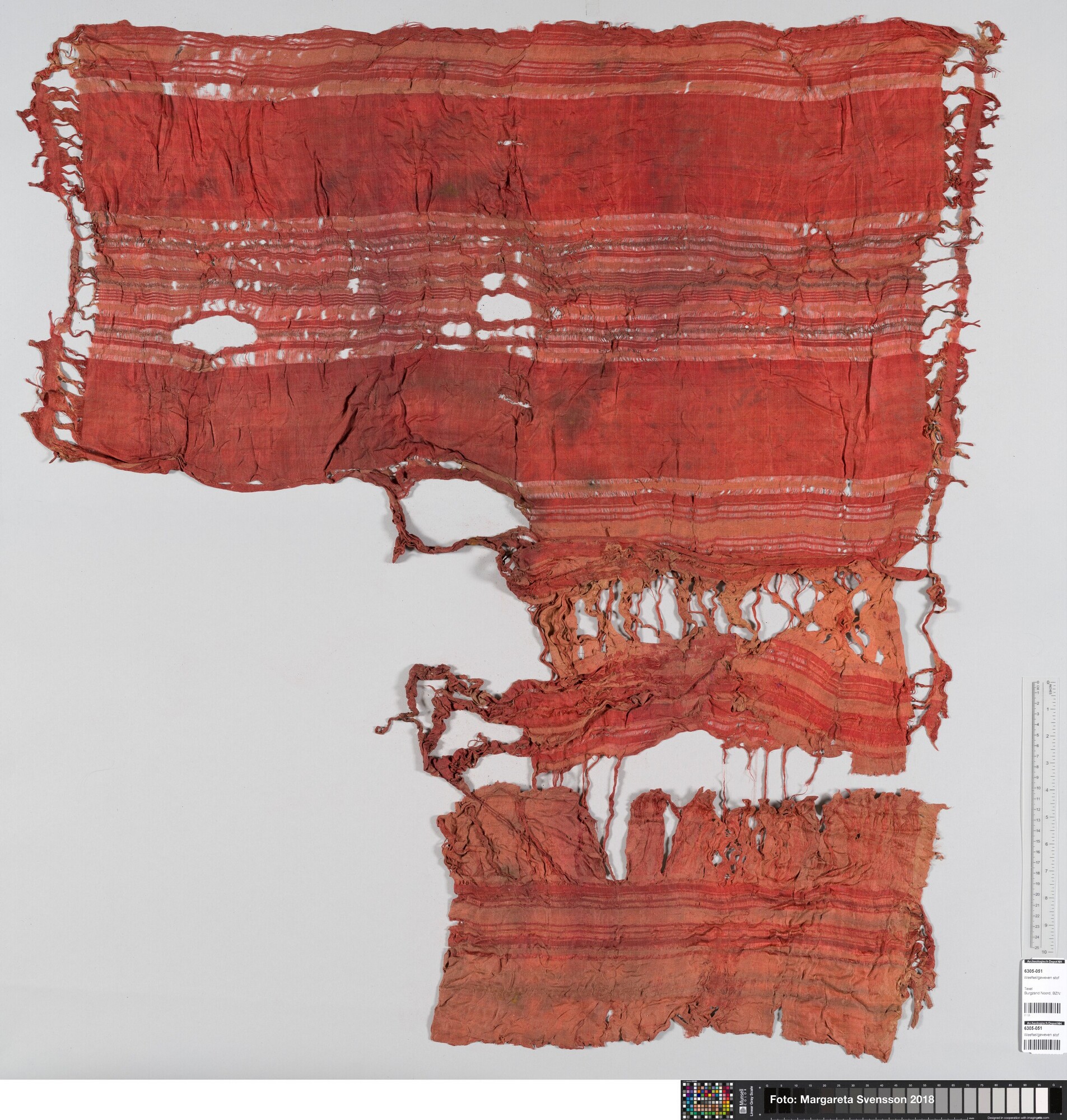 Basisweefsel van zijde met ingeweven strepenpatroon in afwijkende kleur; iIn het weefsel zitten telkens drie metaaldraden ingeweven die meewerken in het strepenpatroon; ingeweven geometrisch motief, zowel in het rode weefsel als in de (nog aanwezige) lichtere banen