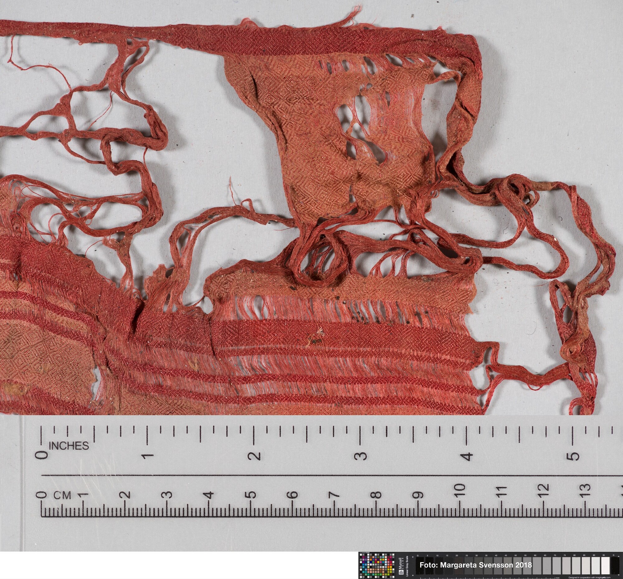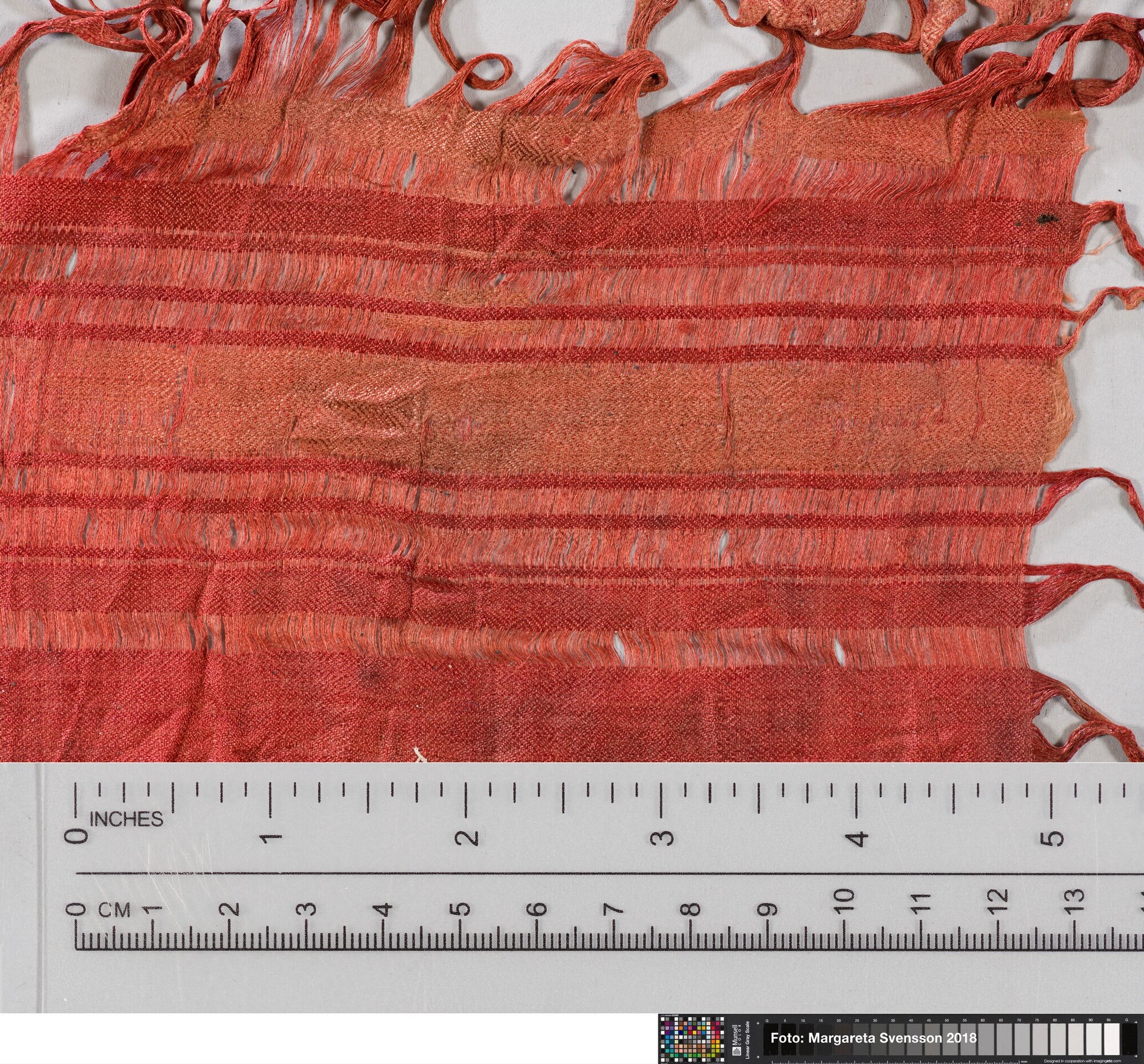 Basisweefsel van zijde met ingeweven strepenpatroon in afwijkende kleur. In het weefsel zitten telkens drie metaaldraden ingeweven die meewerken in het strepenpatroon. Ingeweven geometrisch motief, zowel in het rode weefsel als in de (nog aanwezige) lichtere banen