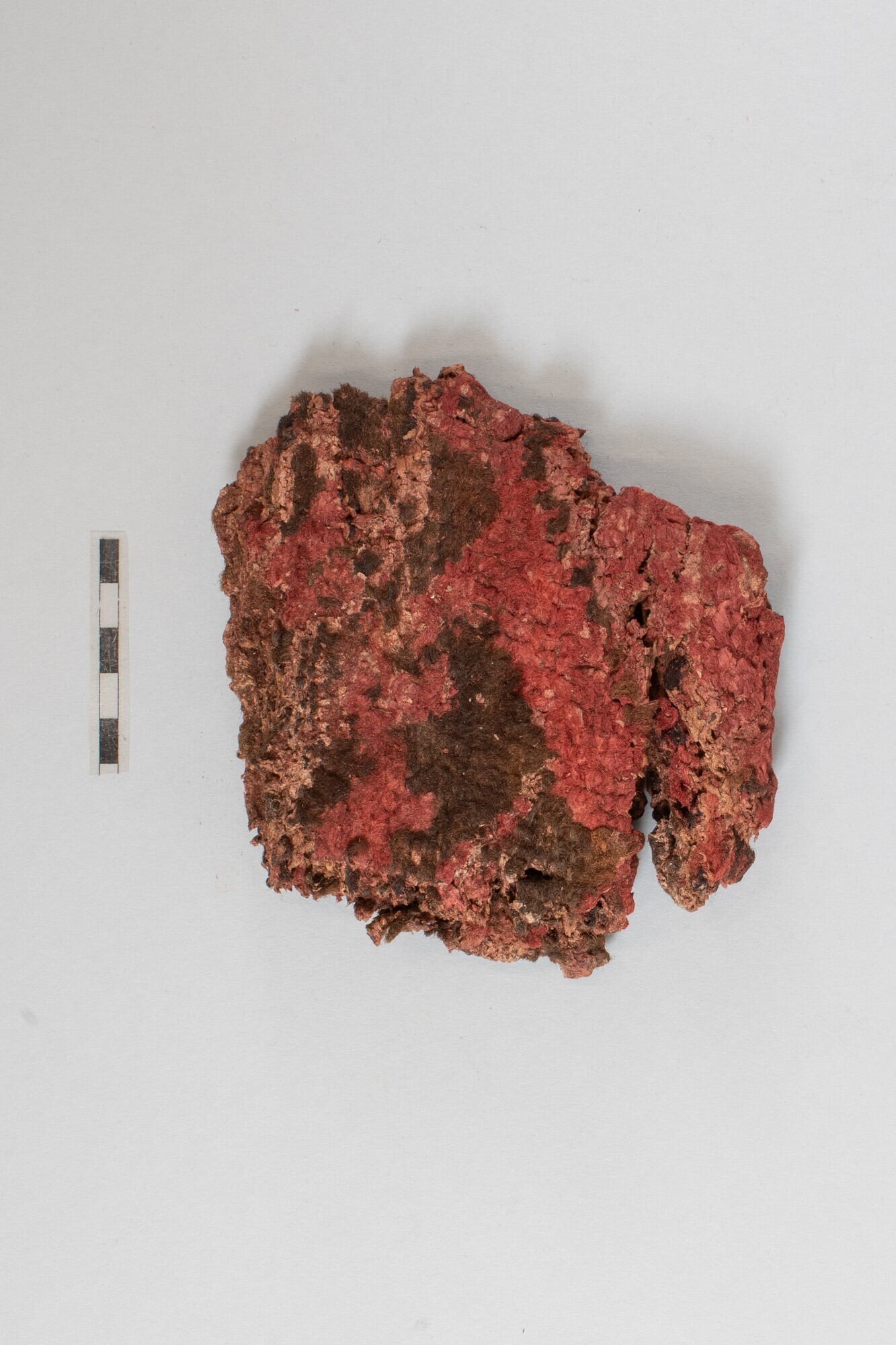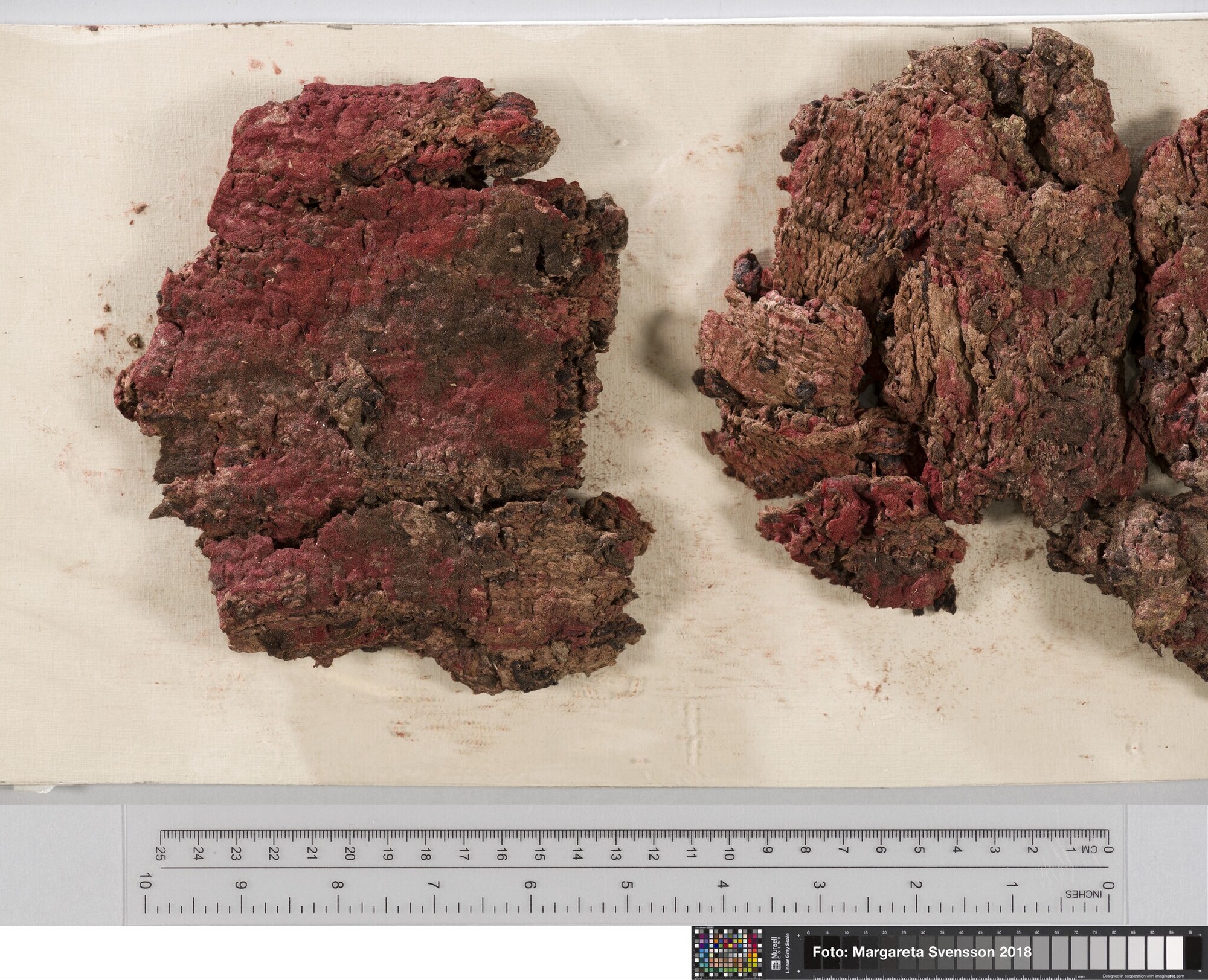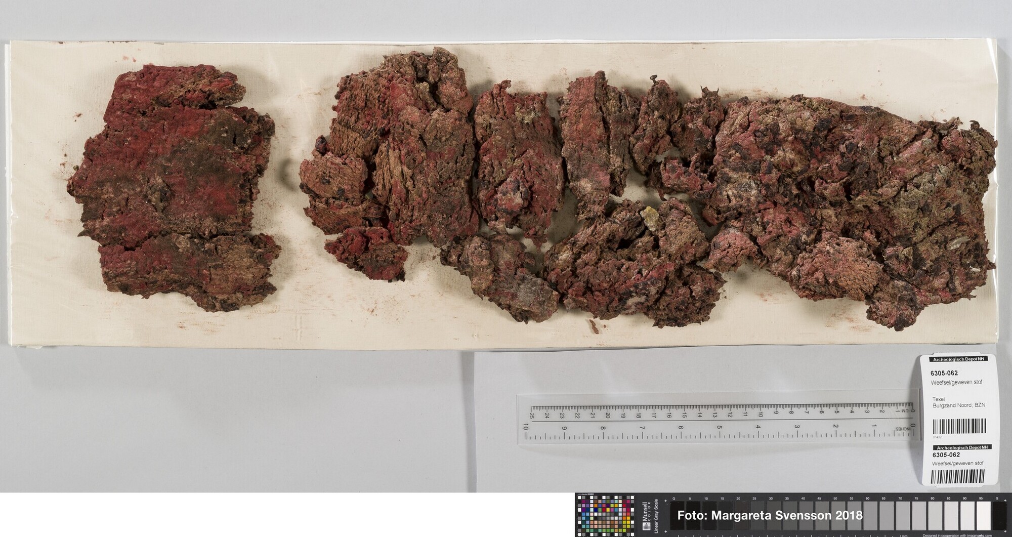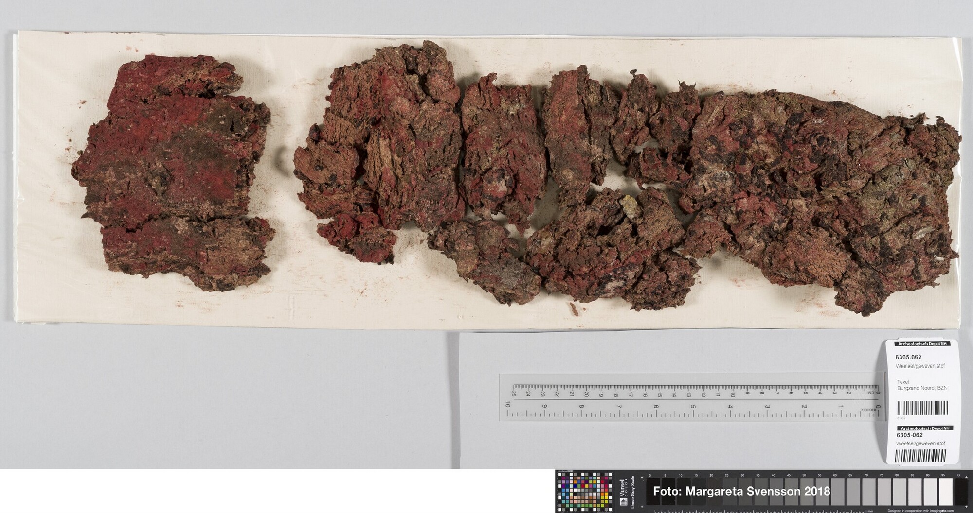 Fragmenten van een oorspronkelijk rood weefsel met patronen in een andere kleur. Er zijn lagen zichtbaar in het weefsel en ook is vaag het oorspronkelijke weefsel zichtbaar; tapijtfragmenten ?