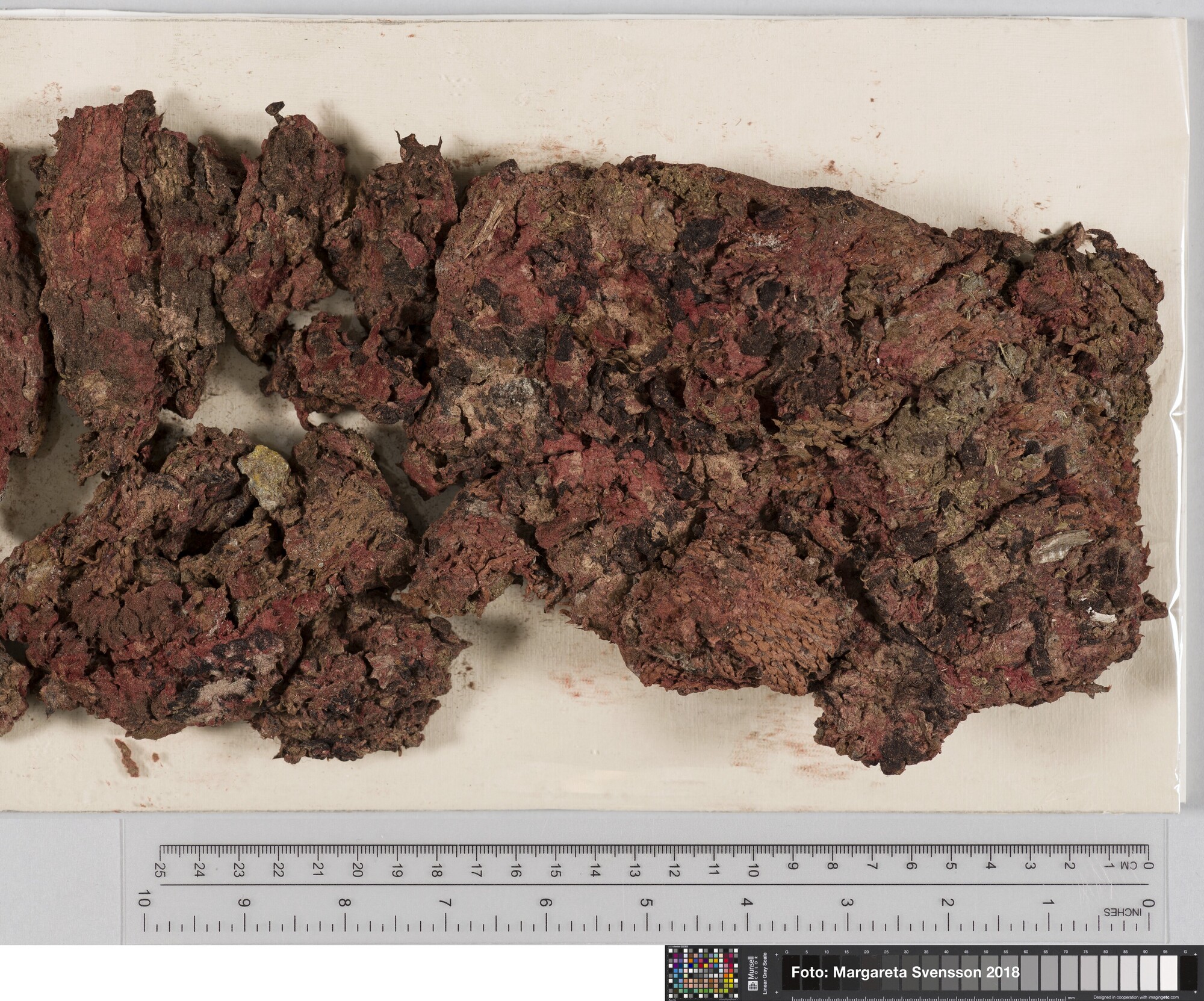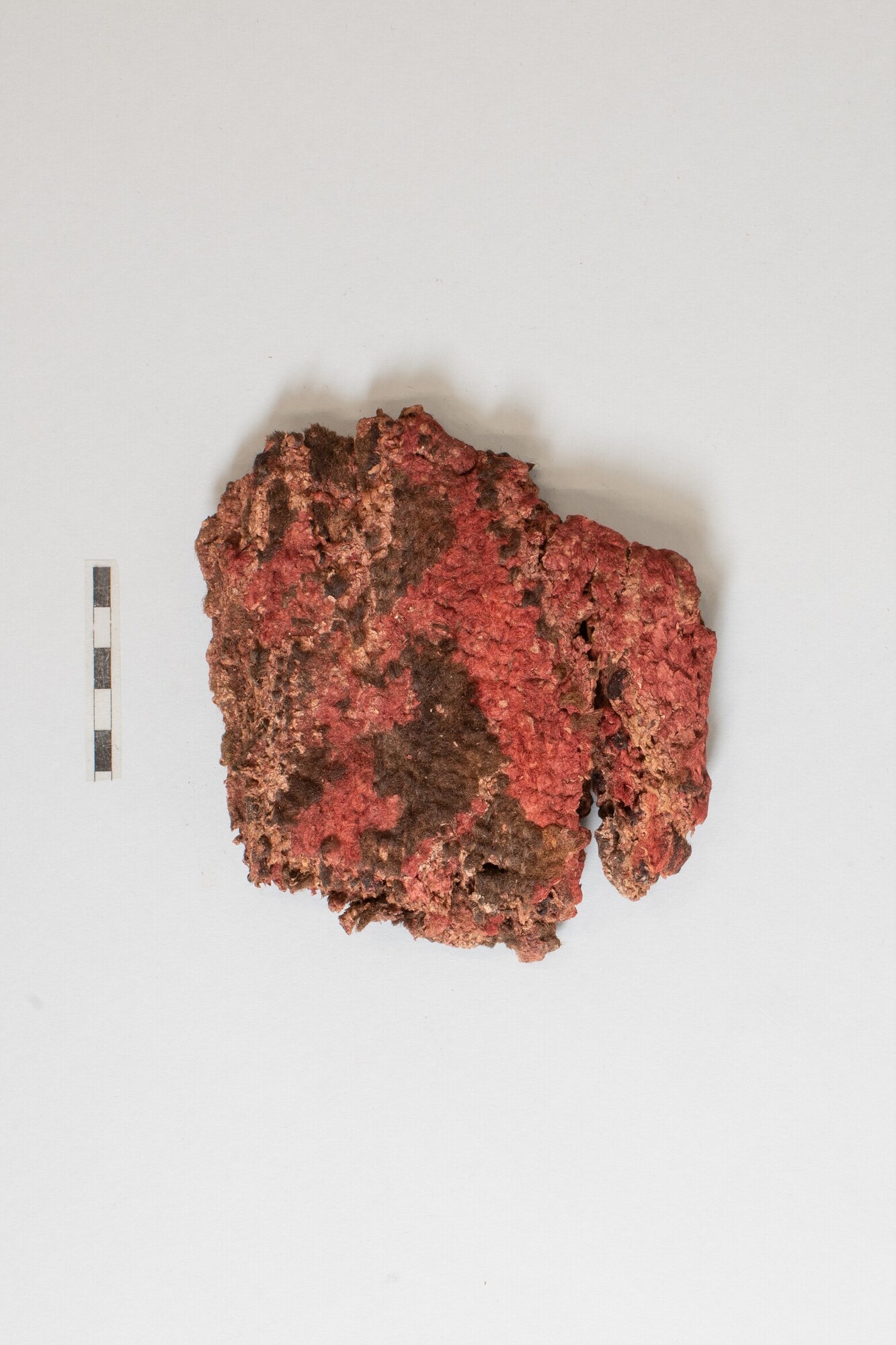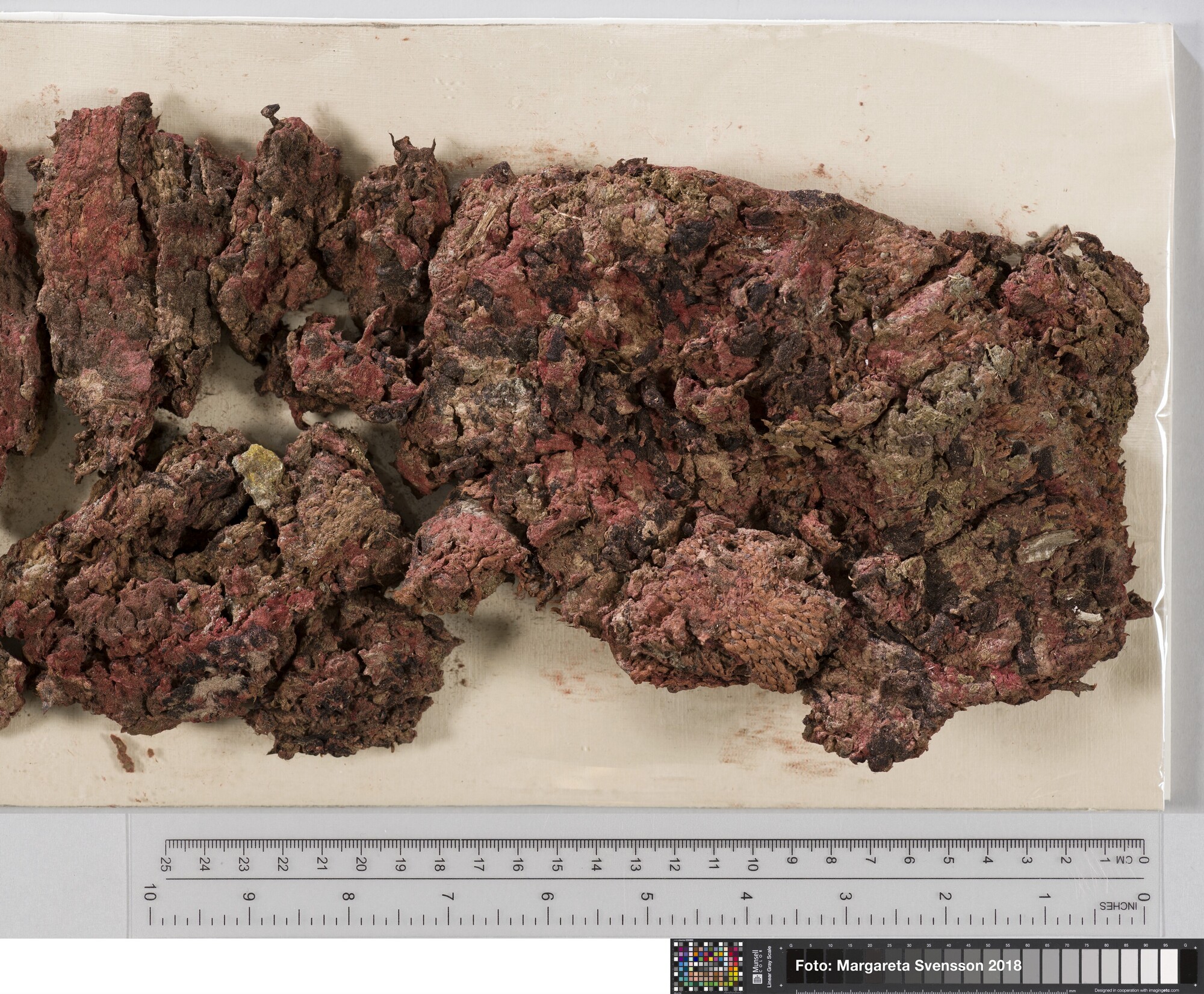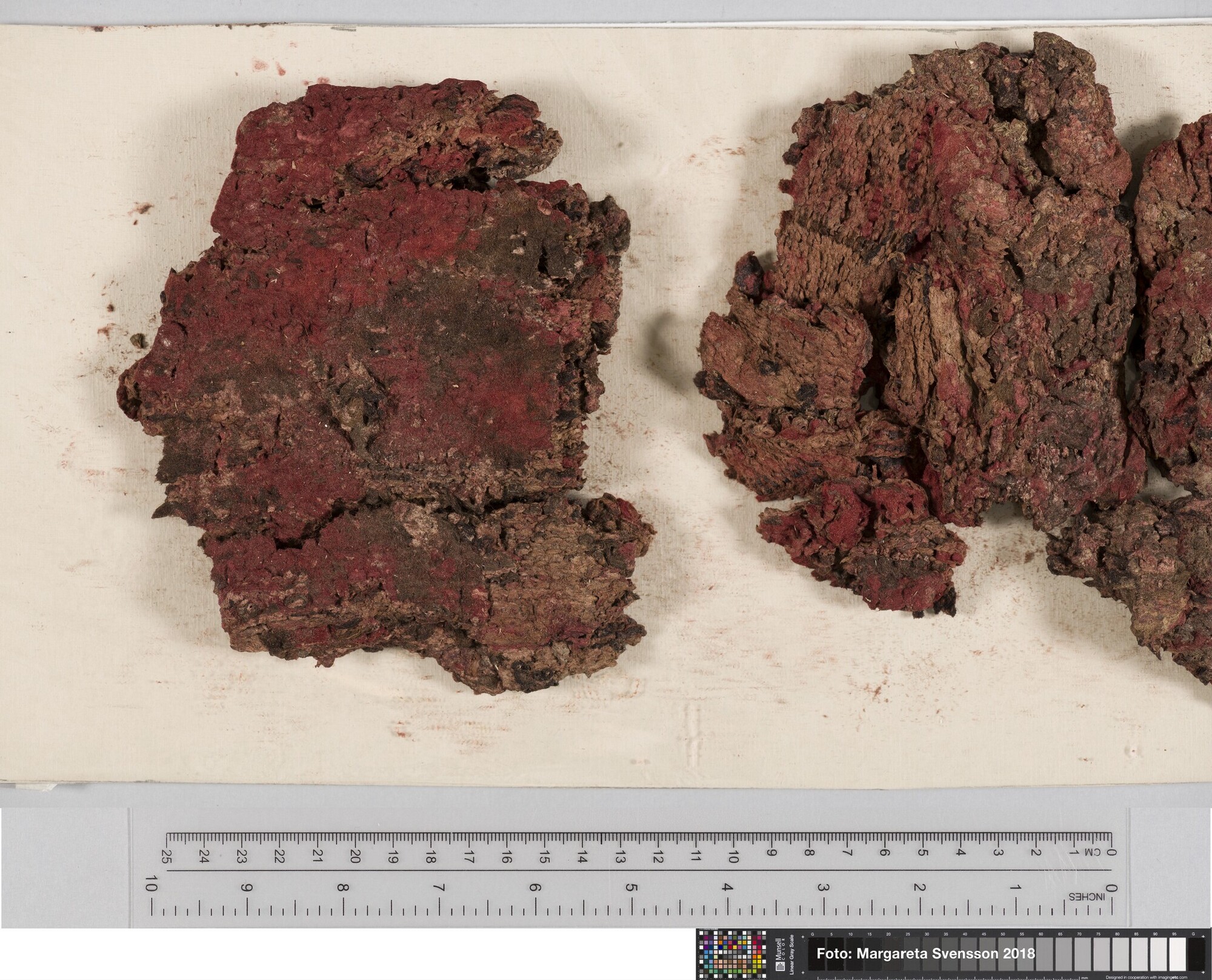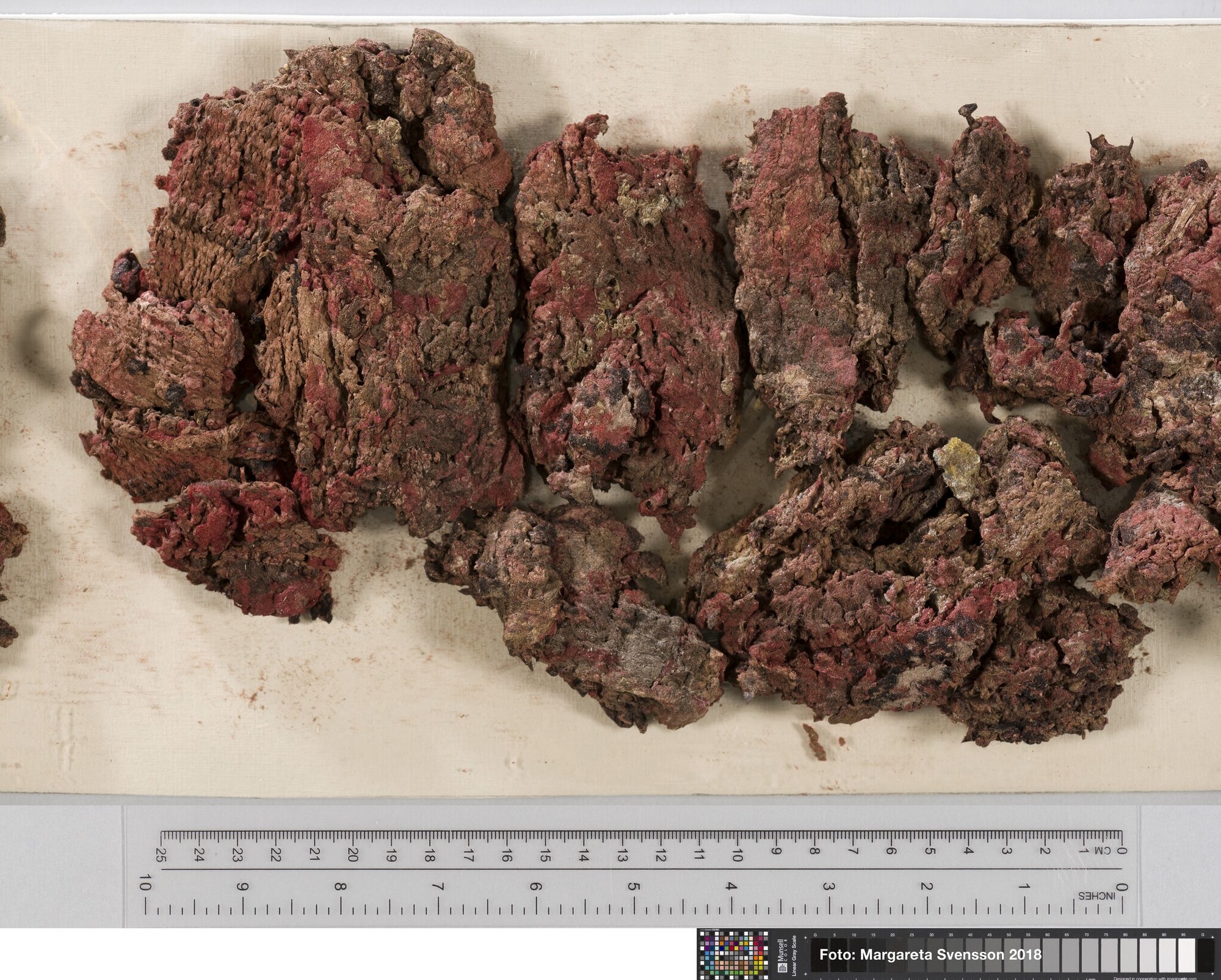 Fragmenten van een oorspronkelijk rood weefsel met patronen in een andere kleur. Er zijn lagen zichtbaar in het weefsel en ook is vaag het oorspronkelijke weefsel zichtbaar; tapijtfragmenten ?