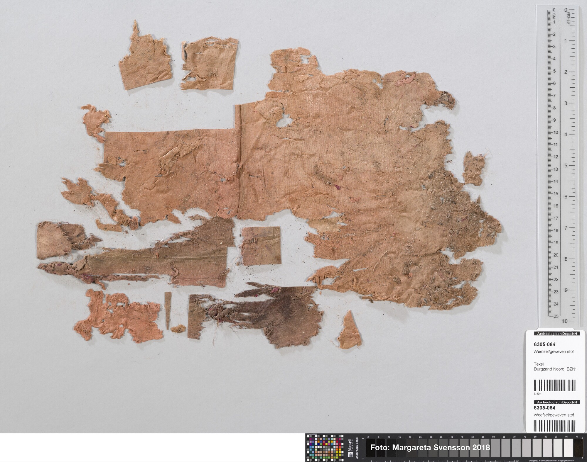 Stukken zalmroze satijnen voering; een groter stuk en 13 kleine fragmenten