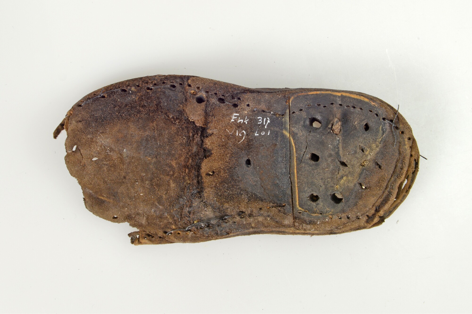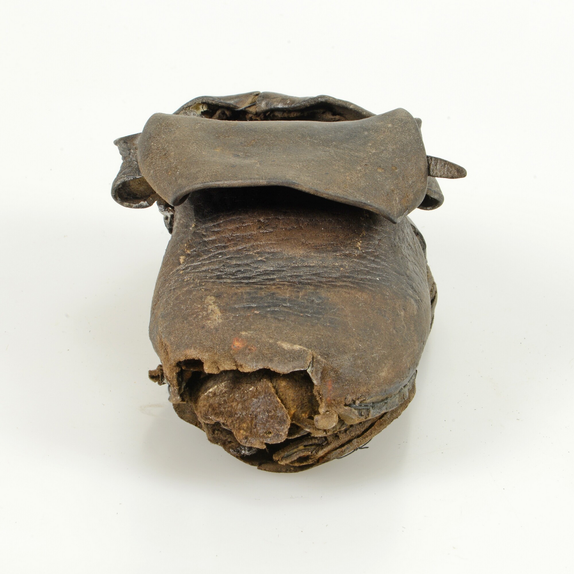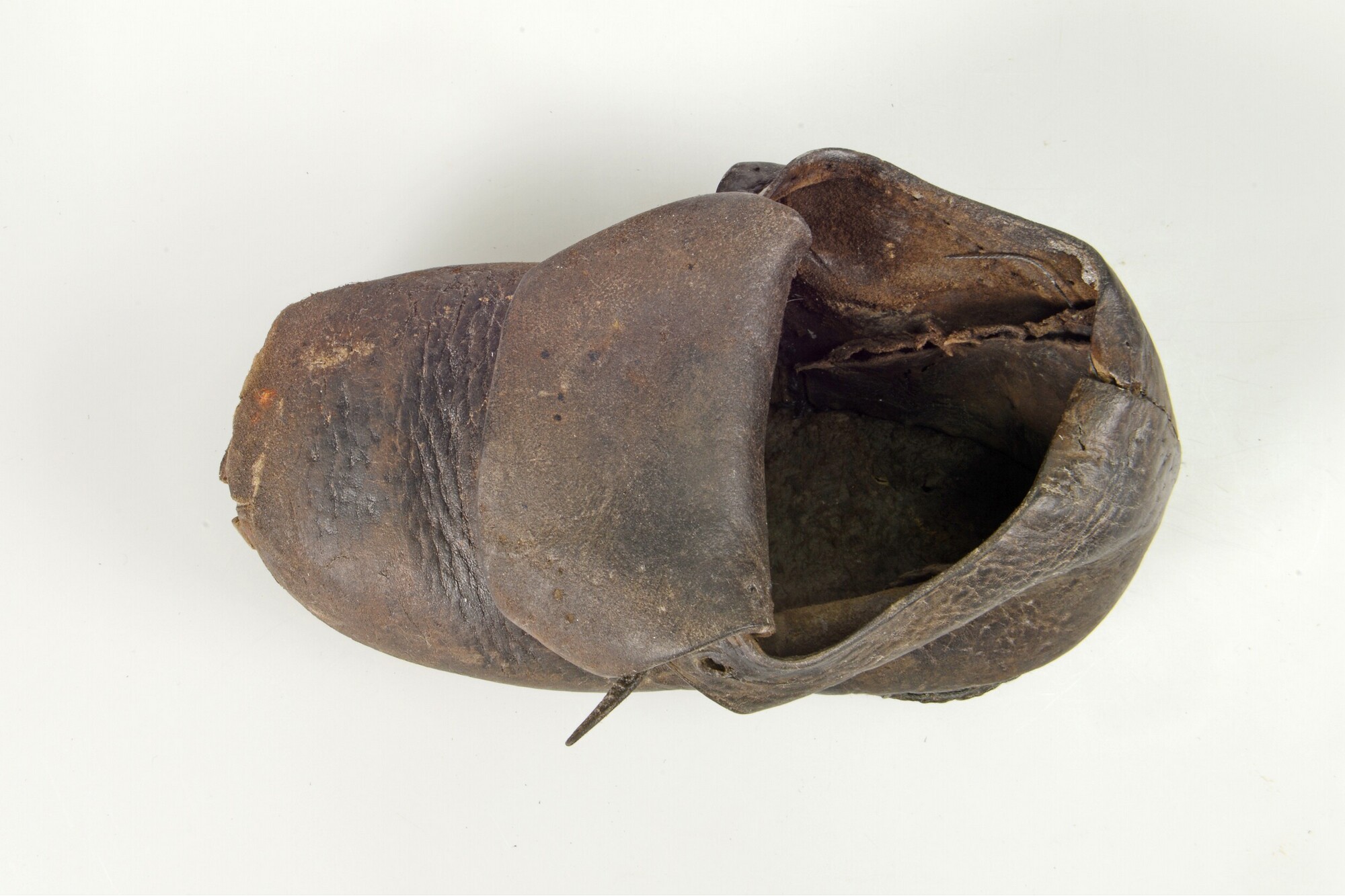 Schoen; Goubitz type 85; runderleer; links; gesloten schoen met riempje en gesp; zool uit meerdere lagen leer; op de teen van de schoen was een reparatiestuk aanwezig; kinderschoen; maat 21