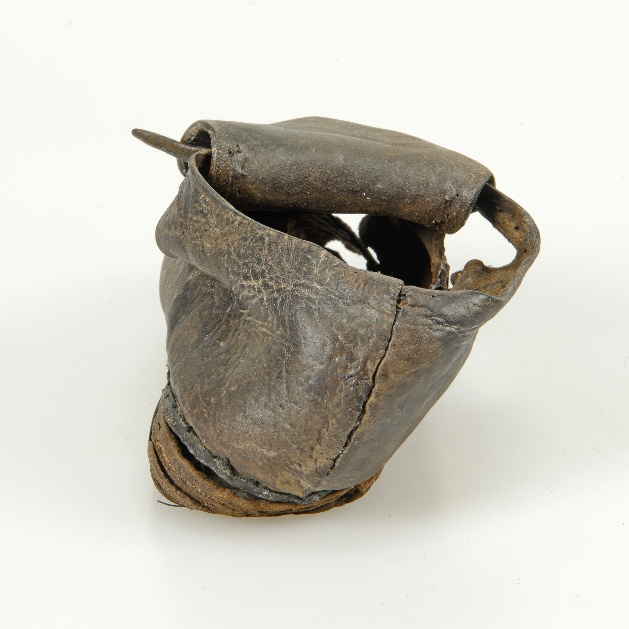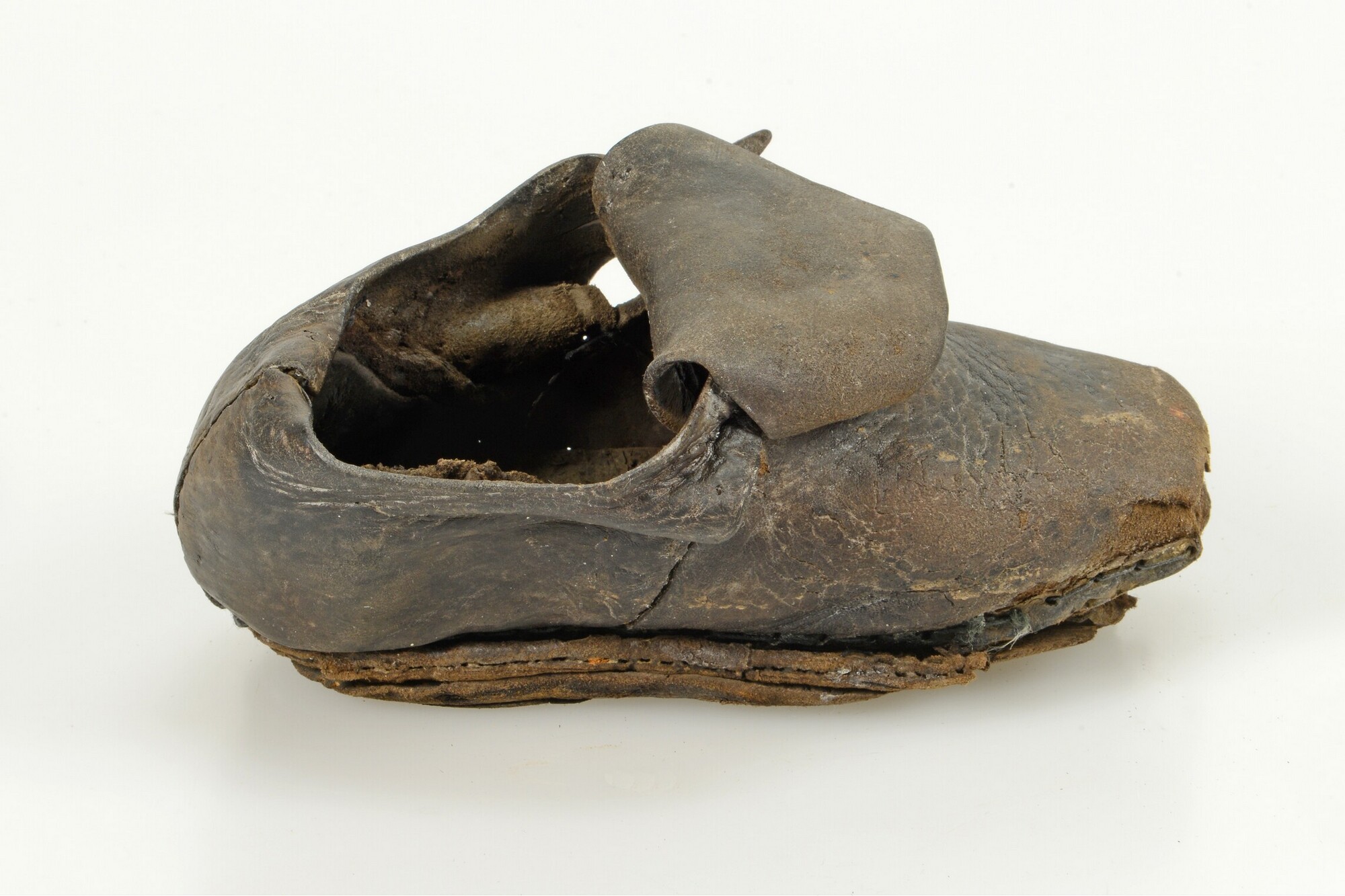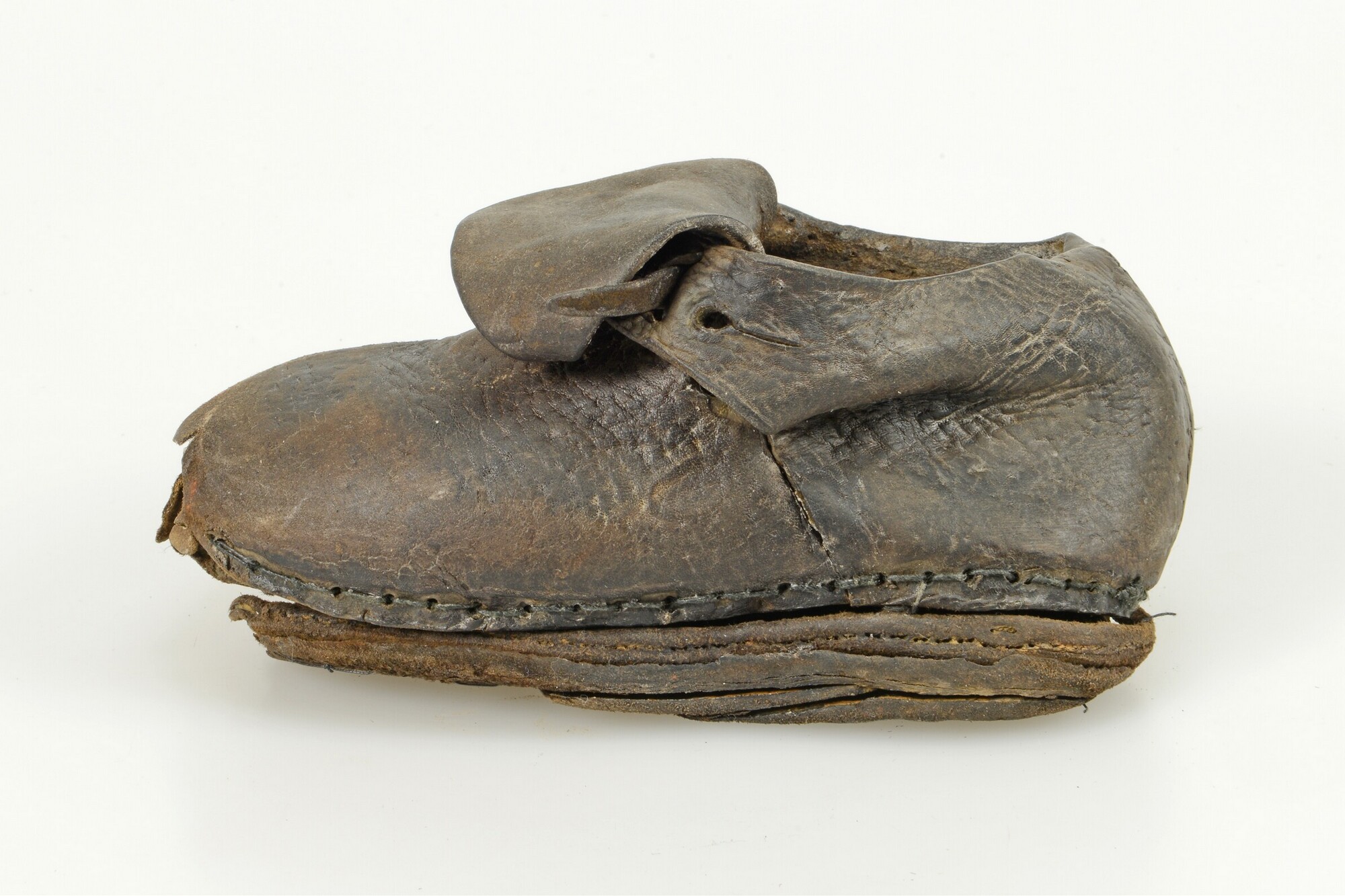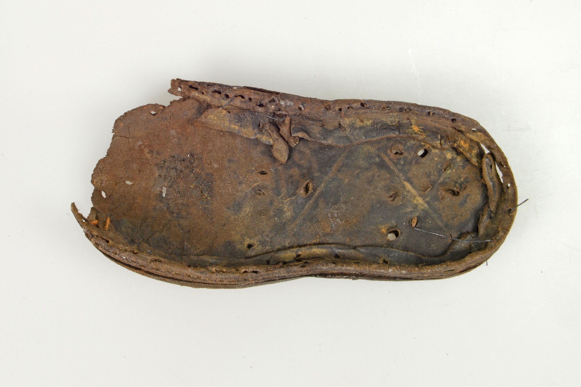 Schoen; Goubitz type 85; runderleer; links; gesloten schoen met riempje en gesp; zool uit meerdere lagen leer; op de teen van de schoen was een reparatiestuk aanwezig; kinderschoen; maat 21