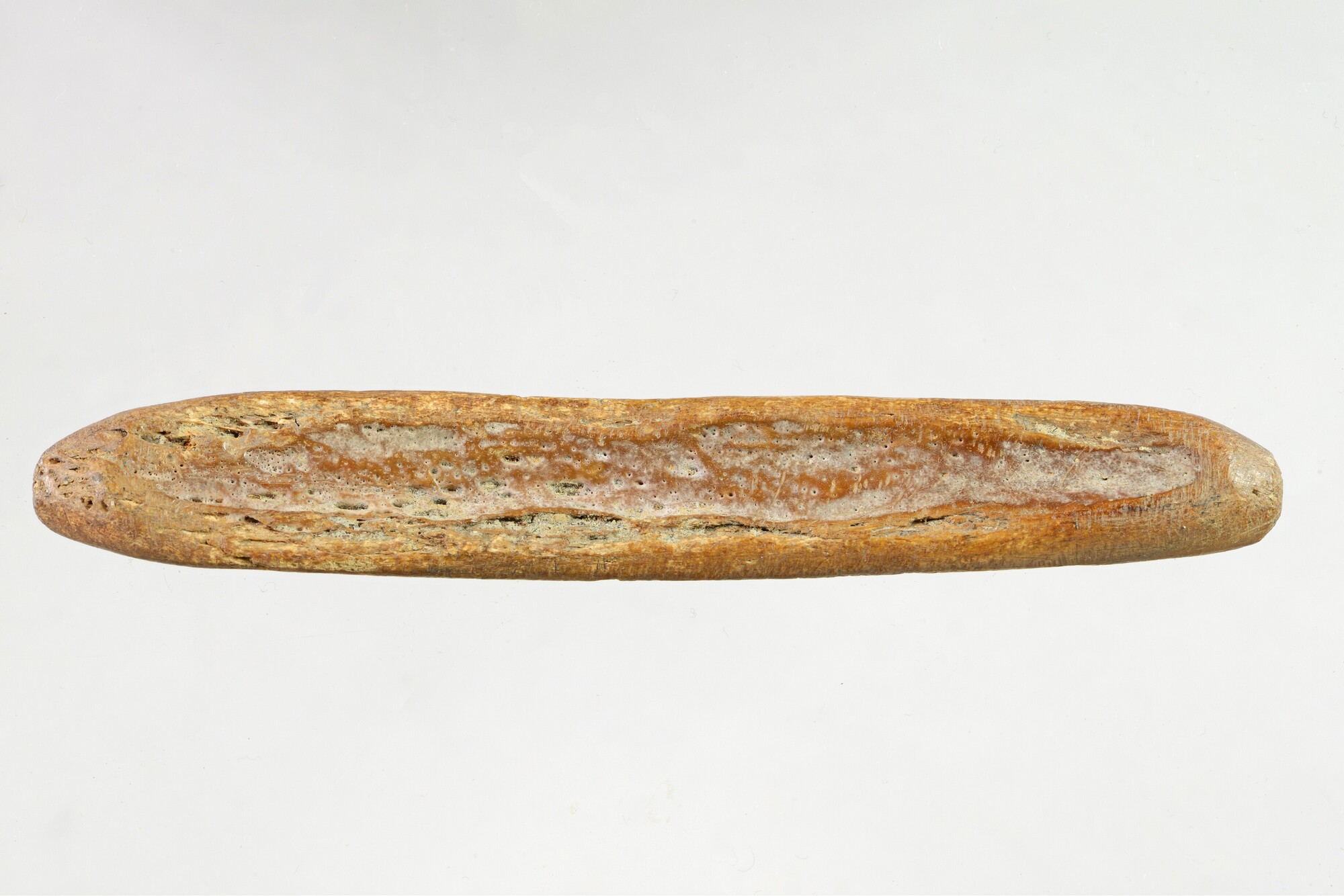 Percussiewerktuig/retouchoir/klos; gemaakt uit een deel van de basale zijde van de onderkaak, mandibula, van een rund (Bos taurus); op de craniaal gerichte randen diepe en ondiepe korte verticale krassen, spongiosa ook zichtbaar als gevolg van slijtage, de holte is over het algemeen glanzend; de buitenkant is geërodeerd, heeft enige glanzende plekken, daarnaast golvende brede diagonale ...