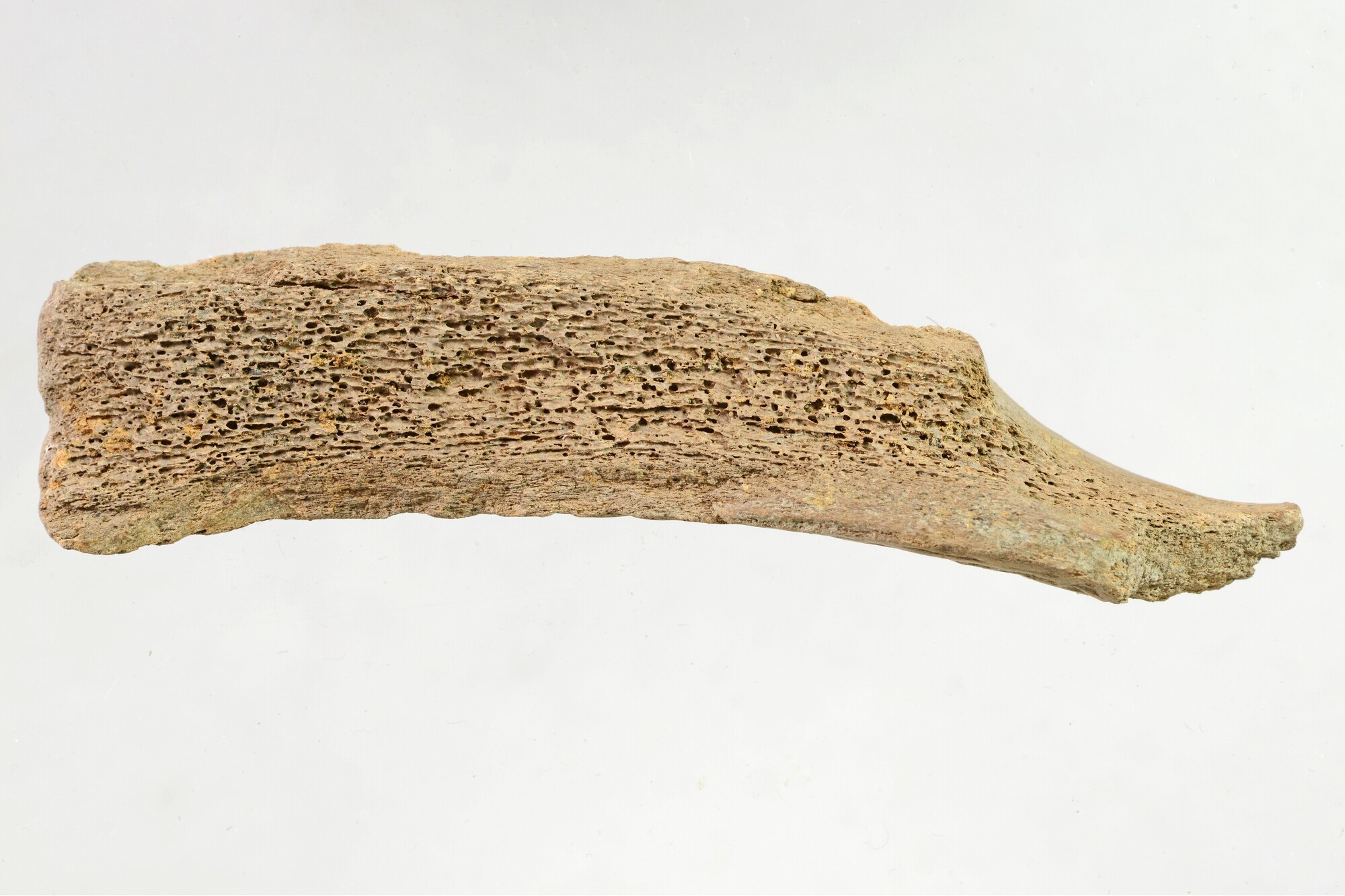 Bijl? fragment; gemaakt uit een gekliefde geweitak van een hertachtige, aan één korte zijde recht afgekapt; aan de bovenkant een halfronde gepolijste holte; de recht afgekapte onderkant is eveneens glad en glanzend over de hele breedte; gewicht: 47.2 gram; vondstomstandigheden: Kolhorn 1982, 165.50/20.50, laag 2
