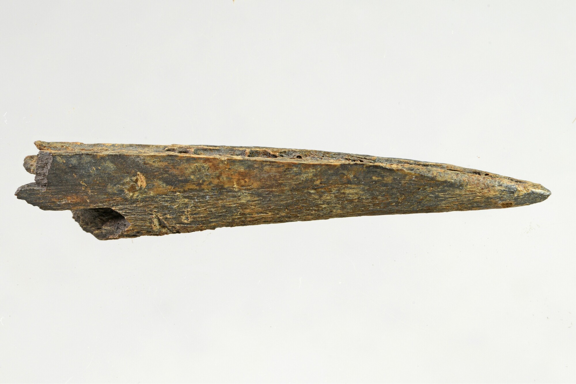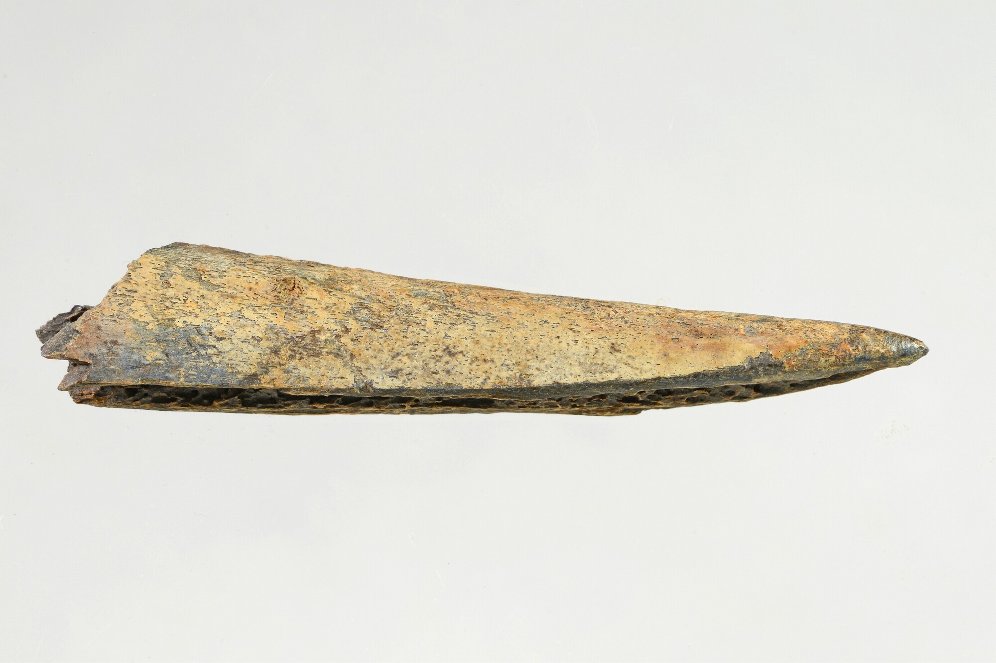 Priem; gemaakt uit een gekliefd bot (pijpbeen/rib) dat aangepunt is; het oppervlak rond de punt is glanzend; gewicht: 3.8 gram; vondstomstandigheden: Kolhorn 1986, 152.50/25.50, bouwvoor
