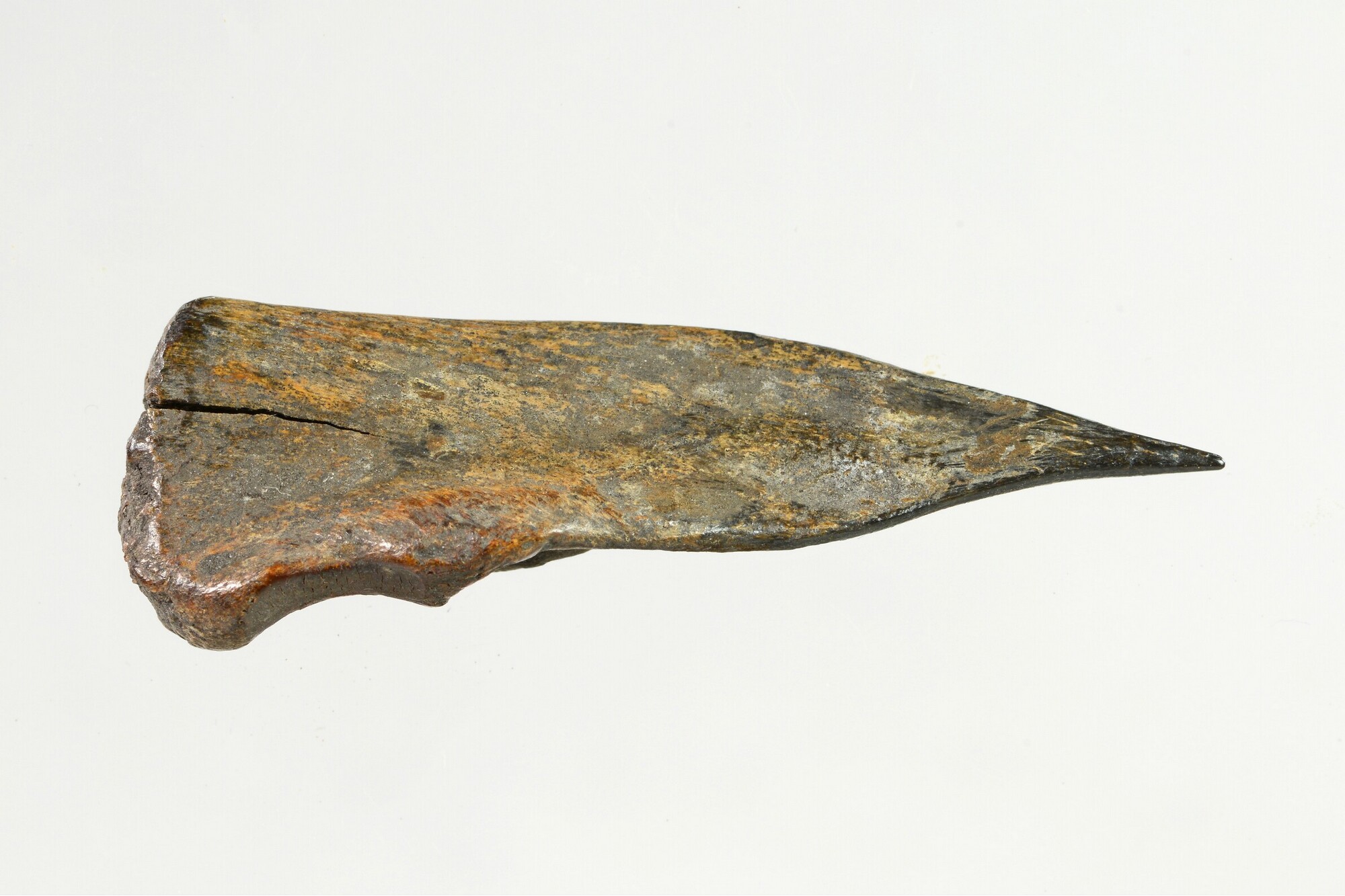 Priem; gemaakt uit de rechter ulna van een ree (Capreolus capreolus); de distale zijde van de ulna is aangepunt; incisura semi-lunaris ontbreekt, afgekapt?; aan de punt geblakerd; het oppervlak is glad en hoogglanzend; diagonale krassen op de buitenkant van de schacht; verticale krasjes bij de punt; gewicht: 5 gram; vondstomstandigheden: Kolhorn 1986, 150.50/29.50, bouwvoor