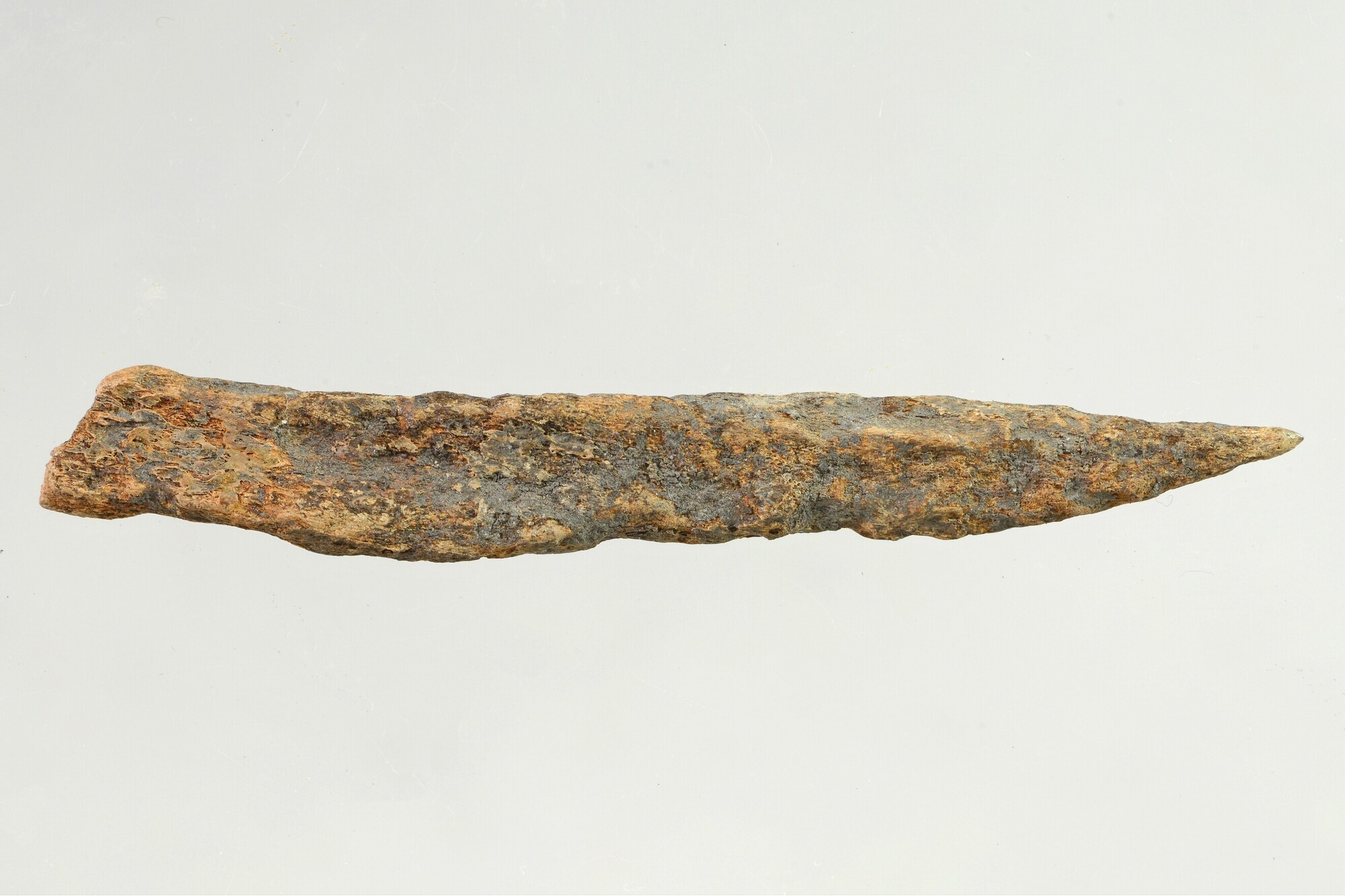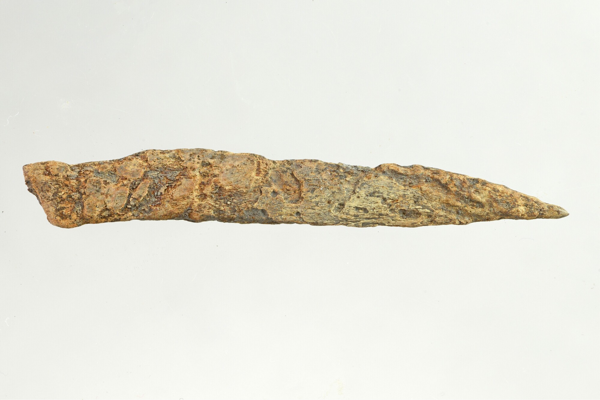Priem; gemaakt uit een splinter van een pijpbeen dat aan een zijde is aangepunt; gewicht: 2.4 gram; vondstomstandigheden: Kolhorn 1981, 151.50/19.50, bouwvoor 2