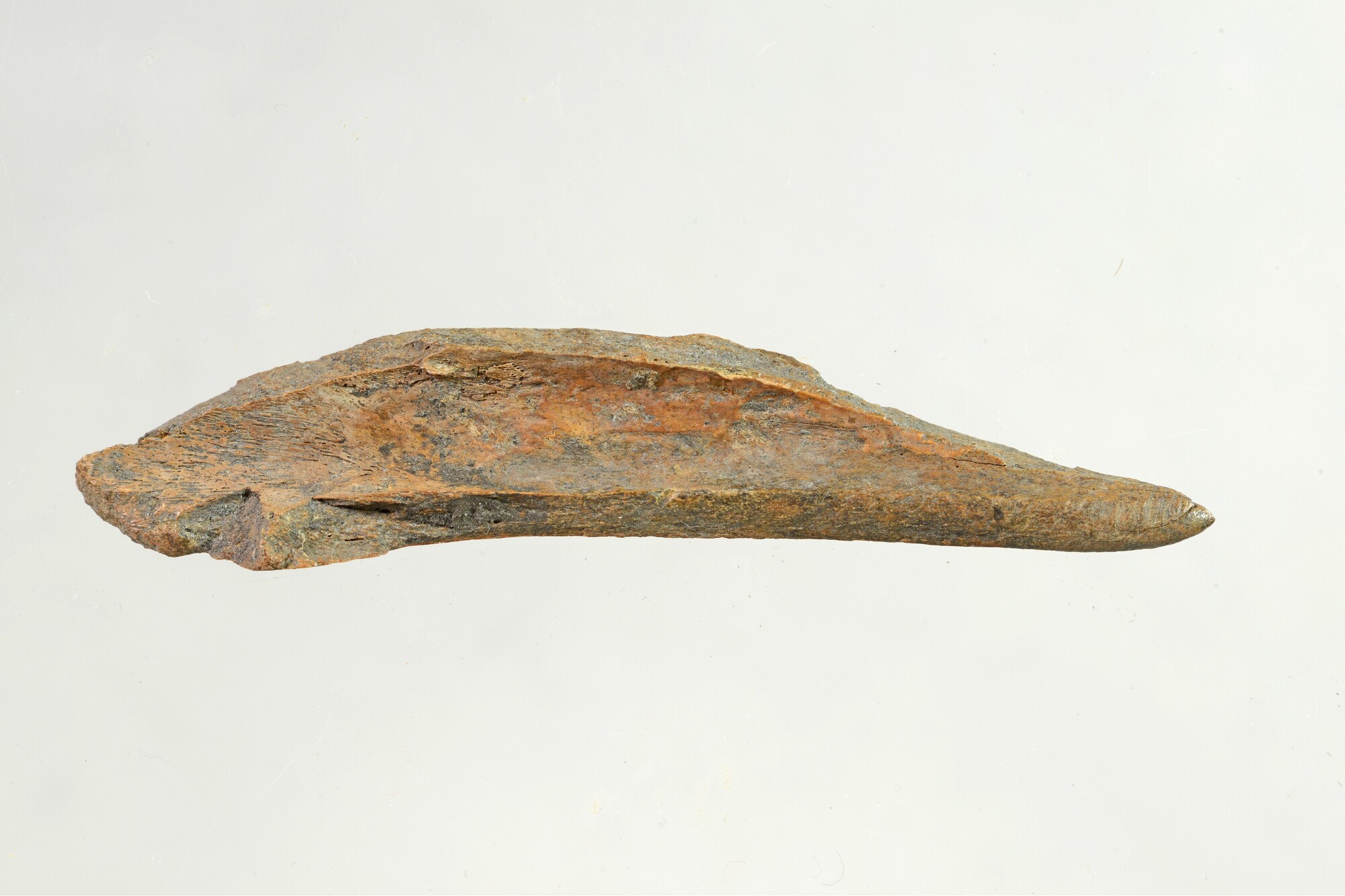 Priem; gemaakt uit een splinter van een pijpbeen dat aan aangepunt is; alleen aan de punt zijn verticale krassen zichtbaar, vooral aan de achterkant; gewicht: 7.4 gram; vondstomstandigheden: Kolhorn 1981, 153.50/32.50, bouwvoor 2