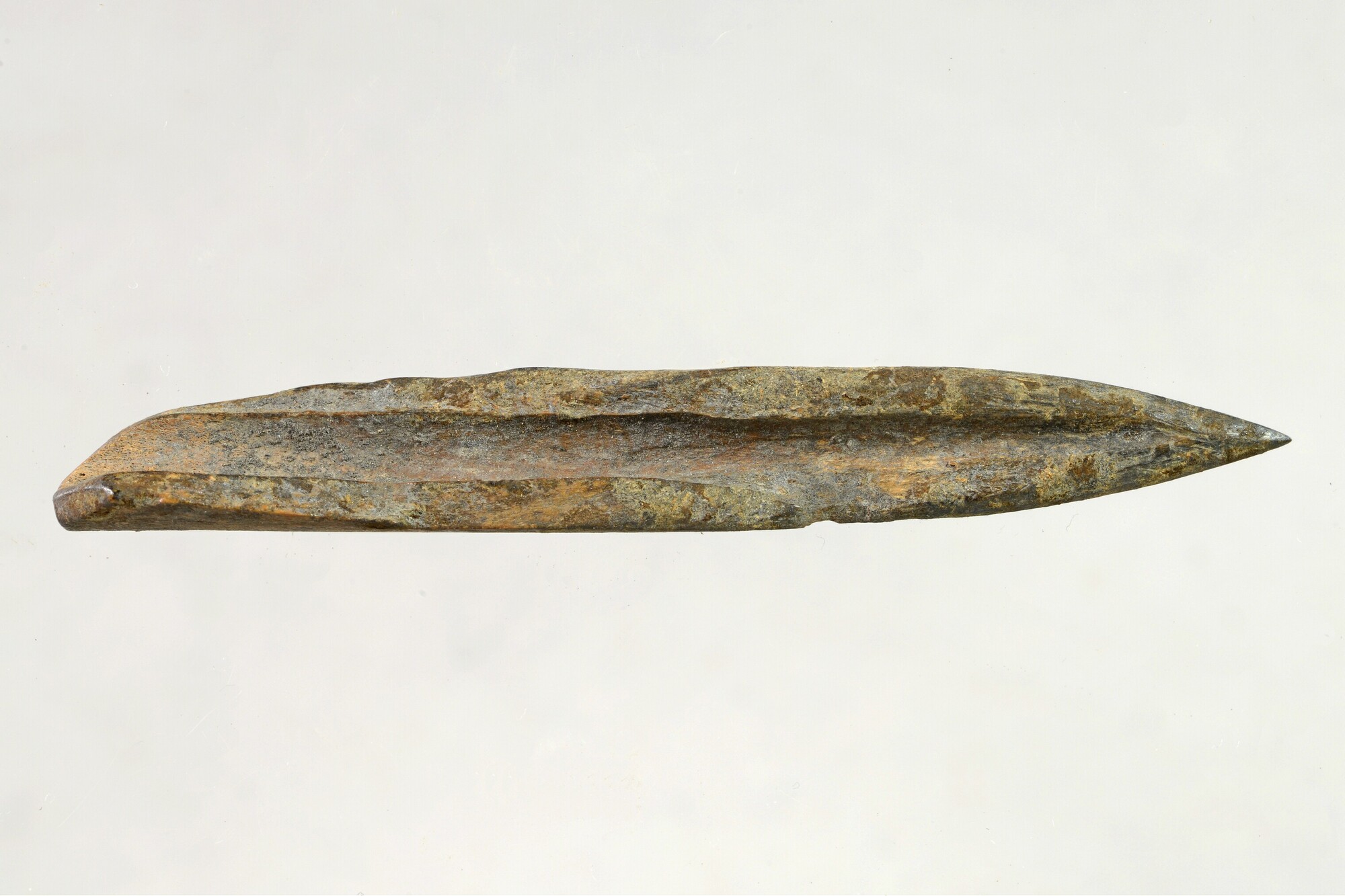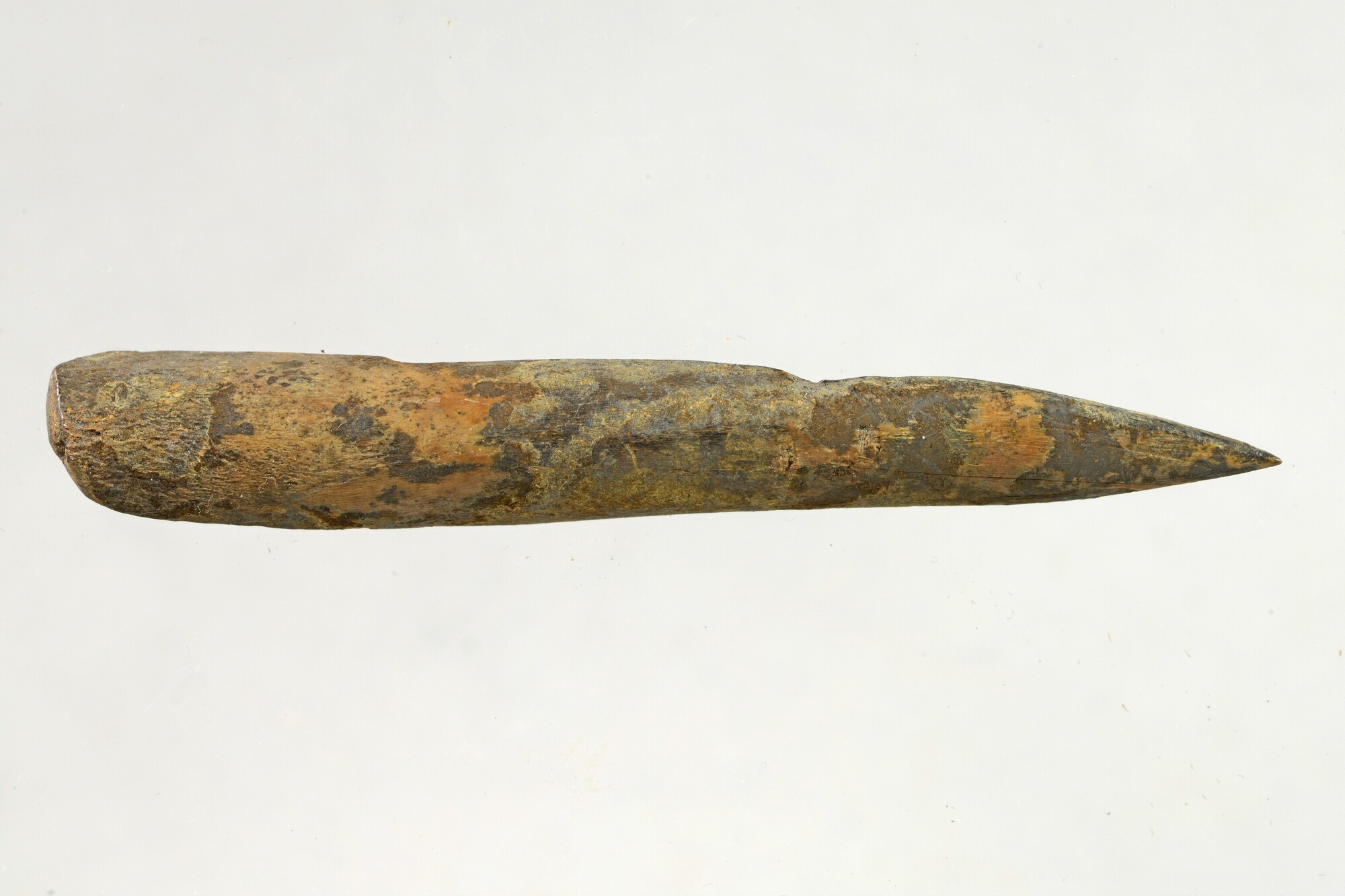 Priem; gemaakt uit een splinter van een pijpbeen; een aantal verticale barsten en krassen op het oppervlak; rond de punt glad en glanzend; gewicht: 7.8 gram; vondstomstandigheden: Kolhorn 1982, 135.50/30.50, laag 3