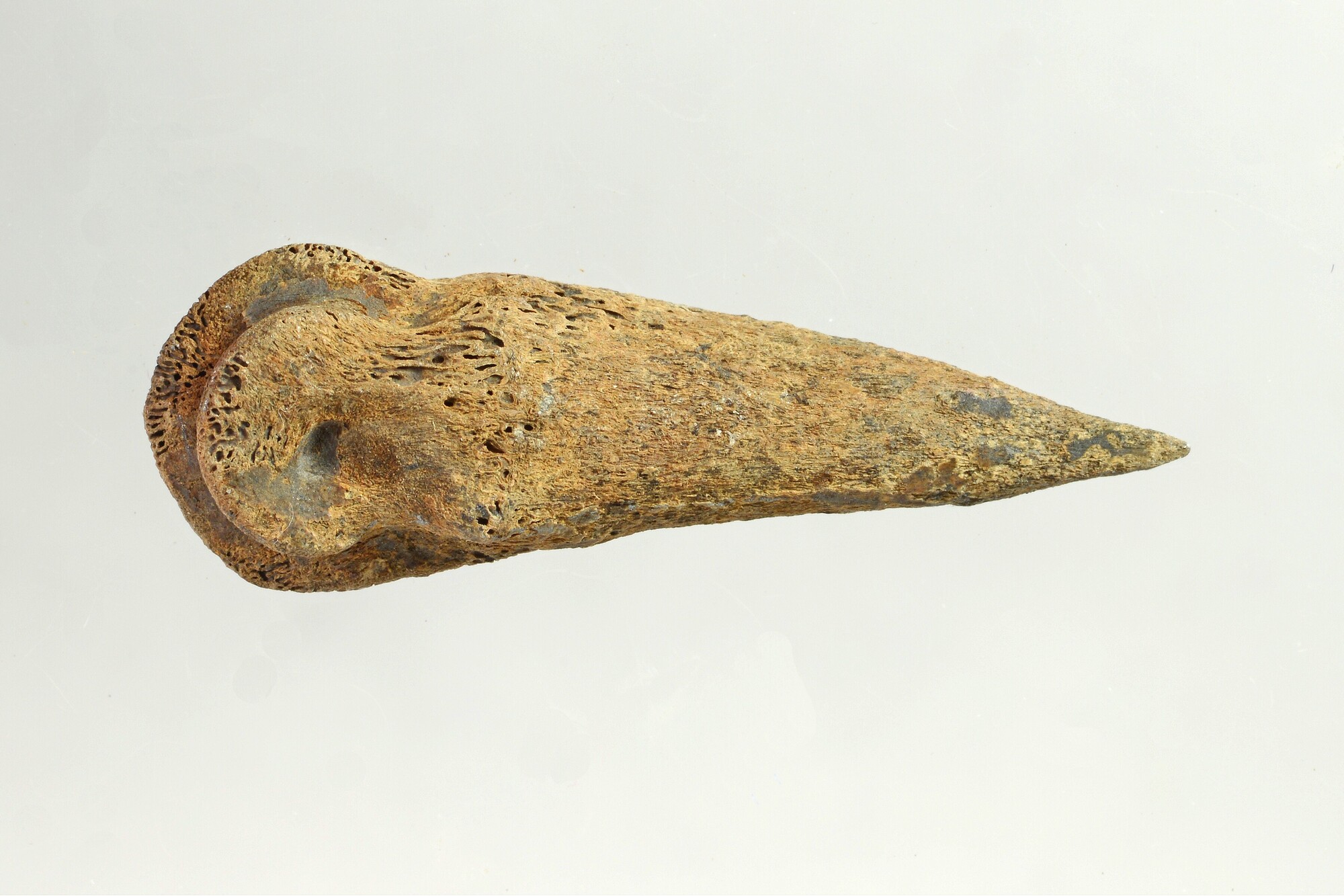 Priem; gemaakt uit de rechter metacarpus van een gedomesticeerd schaap (Ovis aries); het voorwerp is tot stand gekomen door de verbindingsnaad tussen metacarpus III en IV te splijten; de proximale kant is aangepunt; aan het voorwerp ontbreken gebruiksporen; het oppervlak is dof, ruw en spongiosa-achtig, lijkt uitgeloogd; om de punt enkele glanzende plekjes; gewicht: 2.4 gram; ...