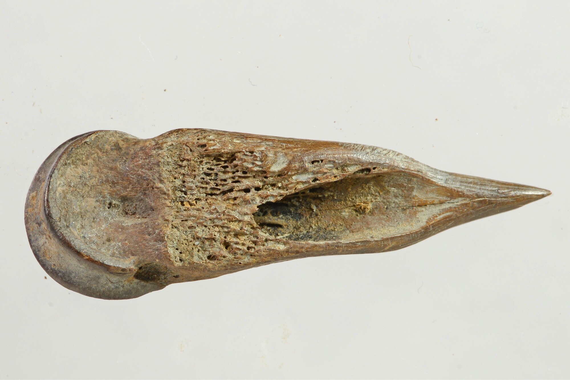 Priem; gemaakt uit de linker metacarpus van een gedomesticeerd schaap (Ovis aries); het voorwerp is tot stand gekomen door de verbindingsnaad tussen metacarpus III en IV te splijten; de proximale kant is aangepunt; de kop is dof, de knobbels en de randen daaromheen glanzend; het oppervlak van de schacht is glanzend, aan de binnenkant heeft ...