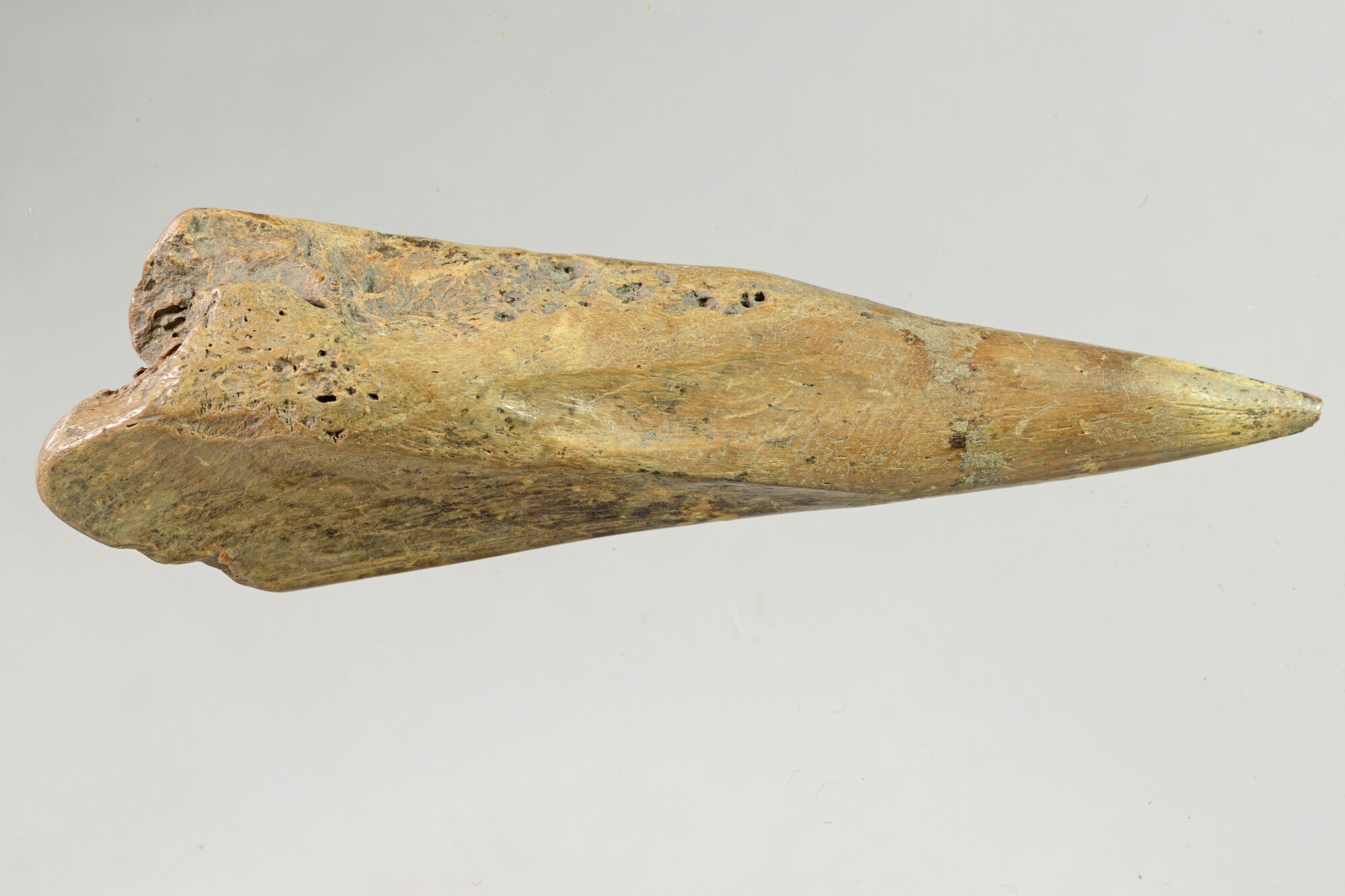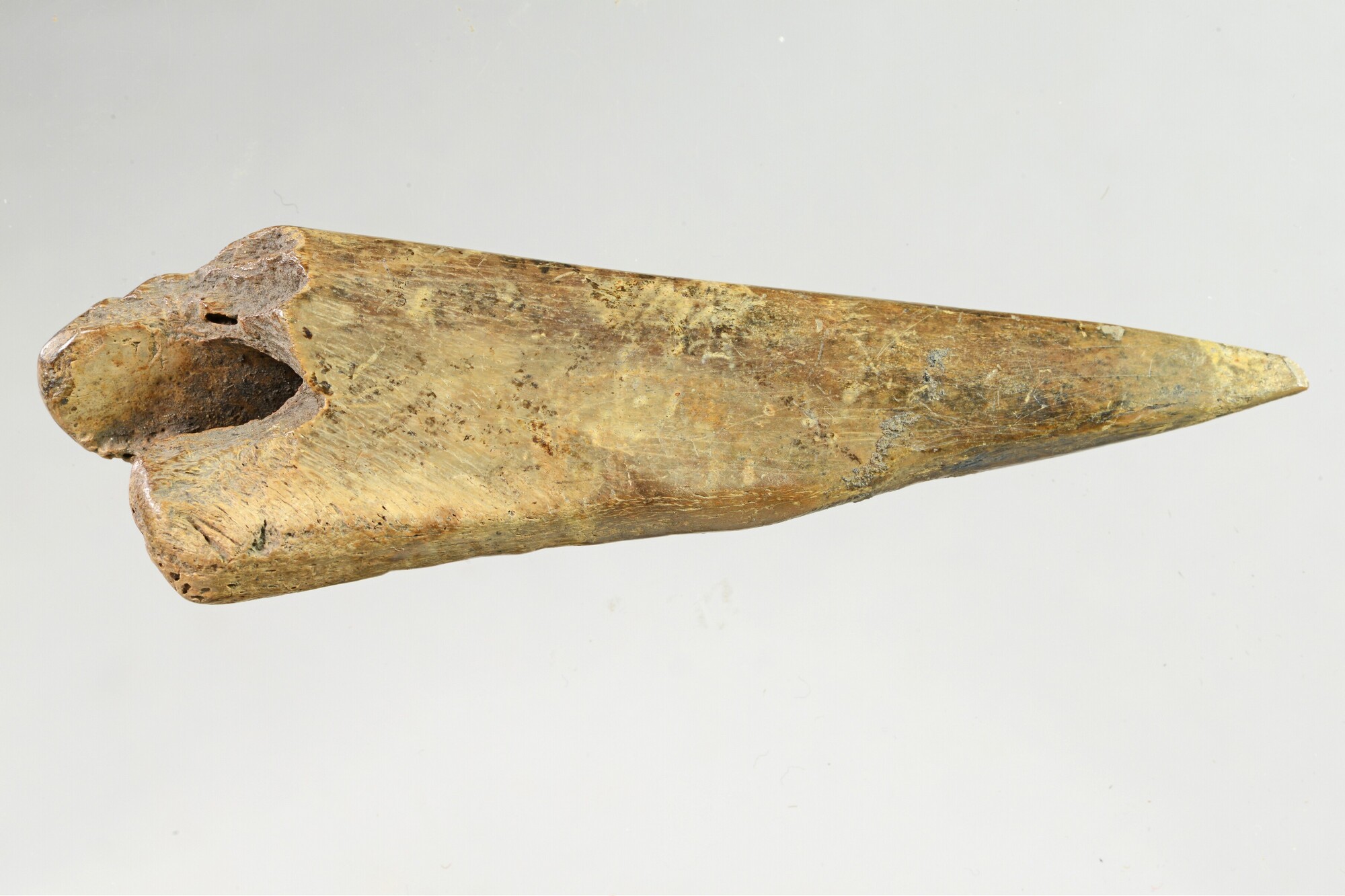 Priem; gemaakt uit een deel van de rechter ulna van een rund (Bos taurus), vanaf de incisura semi-lunaris; de distale zijde is aangepunt; het oppervlak is glanzend; aan de buitenkant en punt verticale krassen en aan de randen diagonale krassen; de punt is verhard door vuur; gewicht: 35.6 gram; vondstomstandigheden: Kolhorn 1985, 220.50/36.50, bouwvoor 2