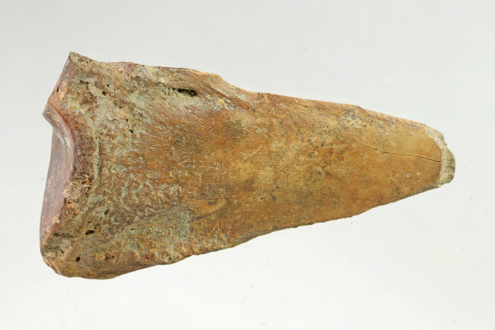 Priem; gemaakt uit de rechter metatarsus van een gedomesticeerd rund (Bos taurus); het voorwerp is tot stand gekomen door de naad tussen de metatarsus III en IV te splijten; de proximale zijde is aangepunt; het oppervlak is glad en glanzend; aan de buitenkant en de punt kleine korte verticale krassen; gewicht: 30.3 gram; vondstomstandigheden: Kolhorn ...