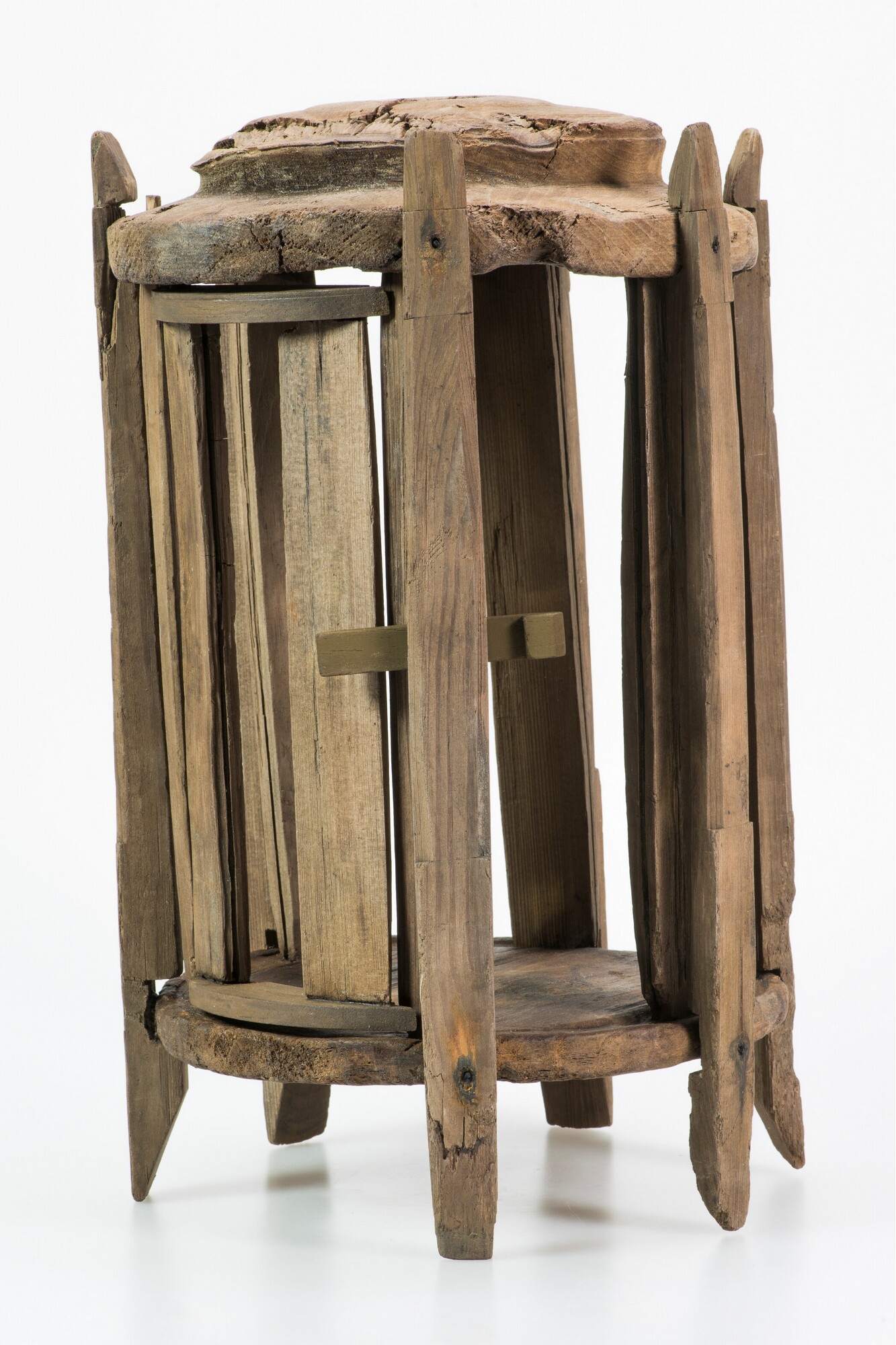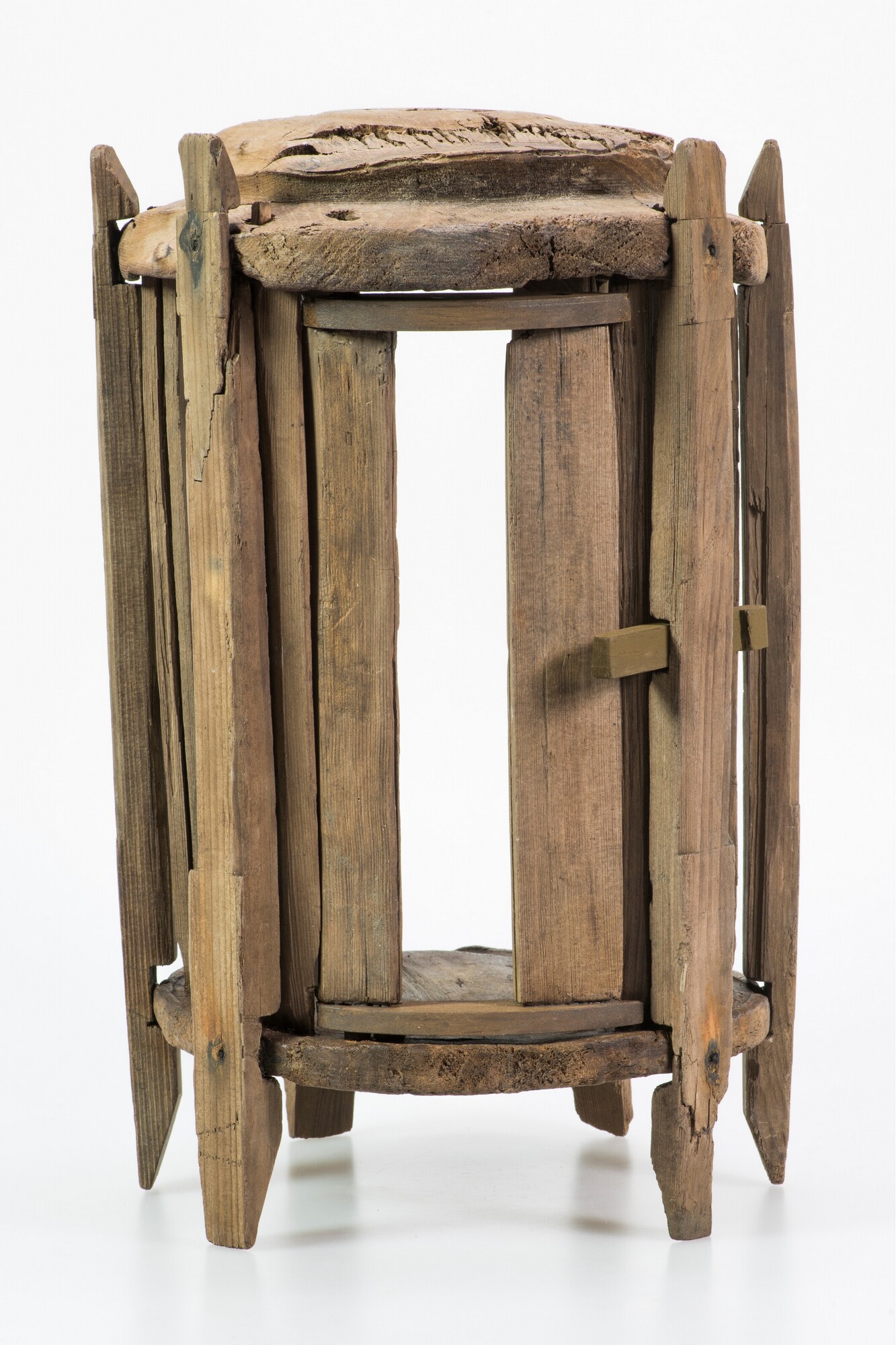 Hout, bodem en deksel: wilg/populier (Salix/Populus), spijlen: den (Pinus sp.)
